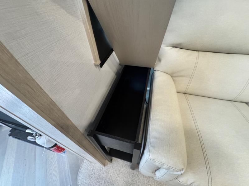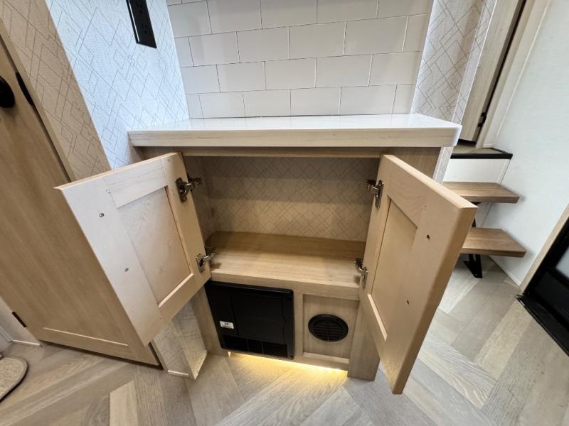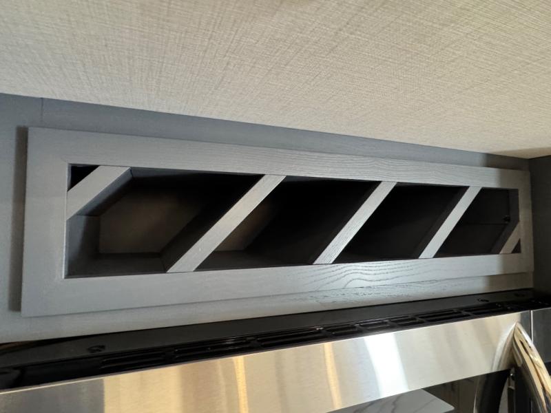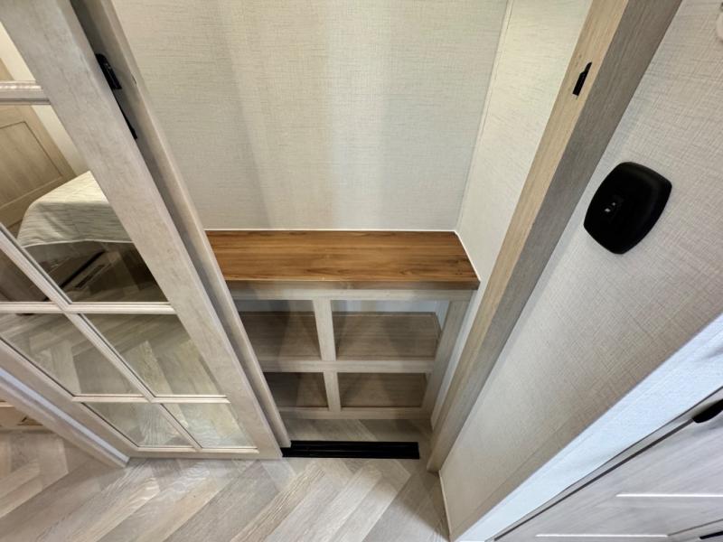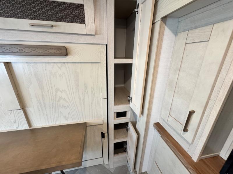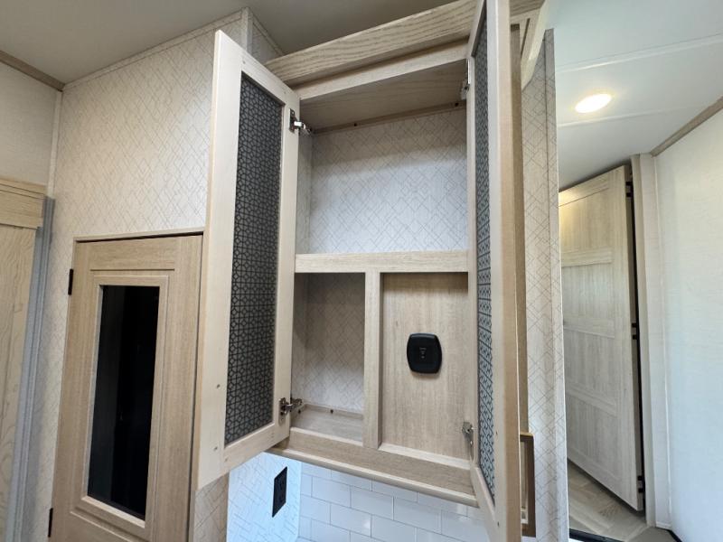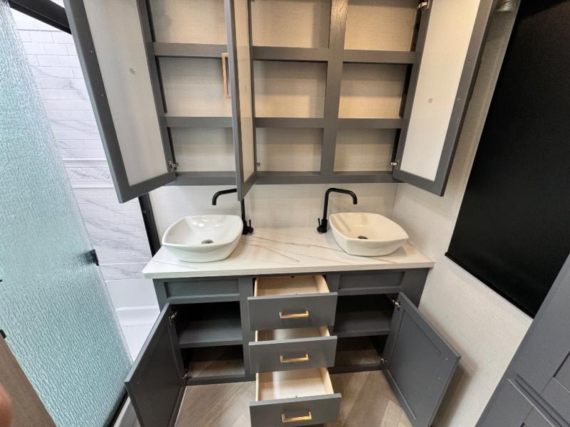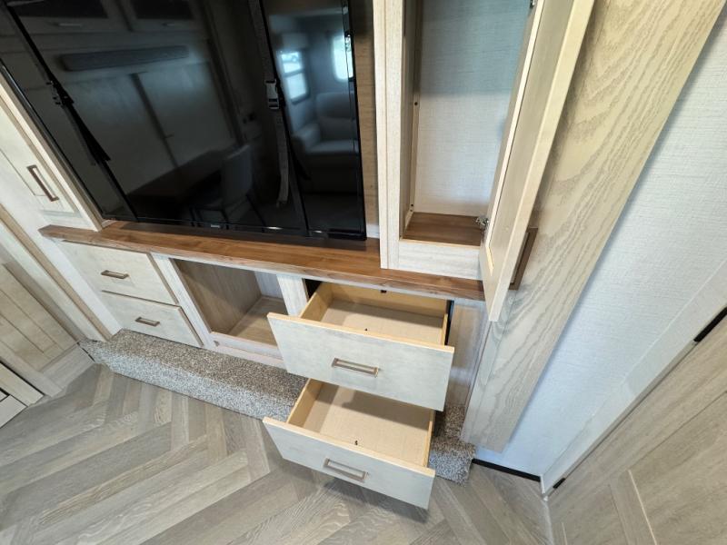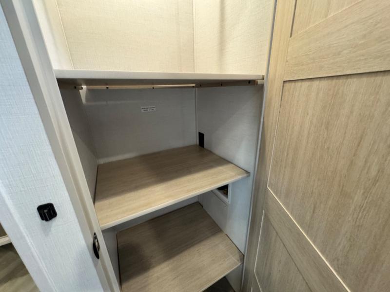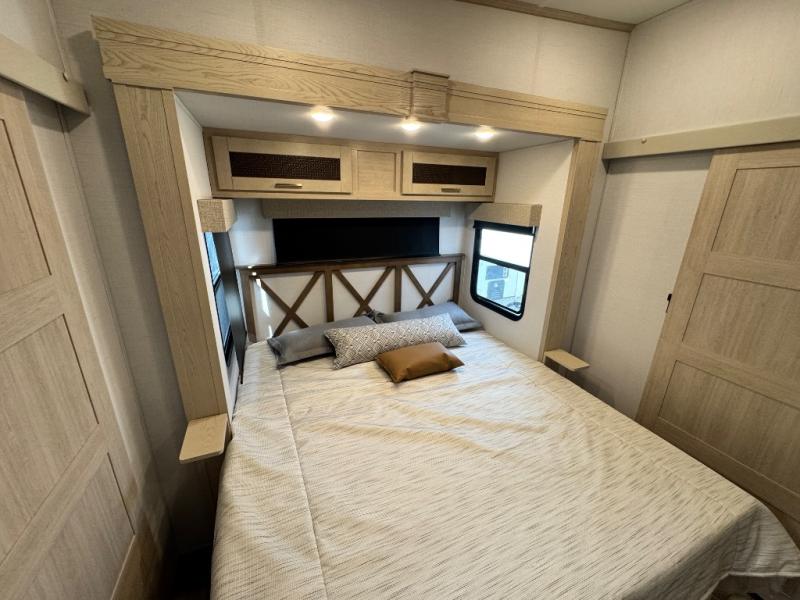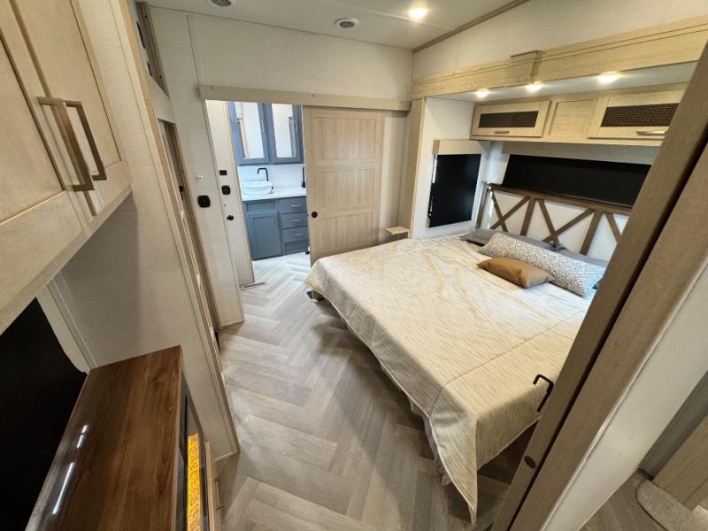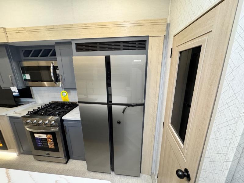 This fifth wheel is sure to wow you! You can easily invite your close neighbor friends along since there is a front den/bedroom that includes dual opposing slides, a Murphy bed/desk, a tri-fold sofa and a wardrobe, plus a full bath! You'll have the master suite towards the back all to yourselves, and here you'll find a king bed slide out, a bedroom fireplace, and a full rear bath, complete with dual bath sinks. There is even a linen closet with washer and dryer prep if you want the option to go full-time! In the morning, everyone can meet in the combined kitchen and living area as the chef whips up breakfast on the four burner cooktop. There is a gourmet island with a flip-up counter and a hidden dinette to provide everyone space to gather around. And you'll love the large sofa with pop-up chargers across from the hidden Smart TV and fireplace. Don't let this fifth wheel slip away!