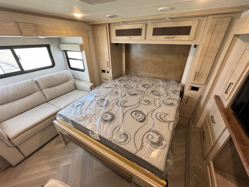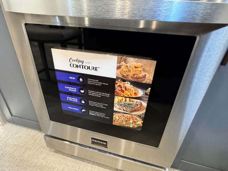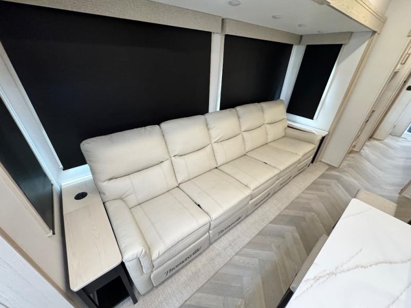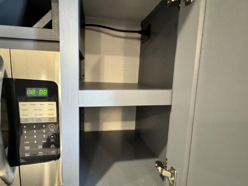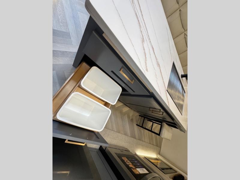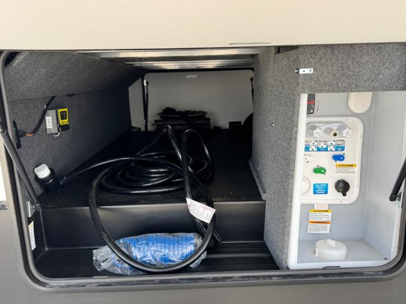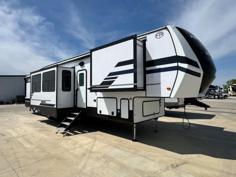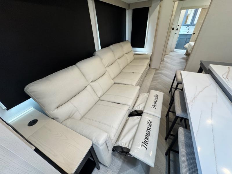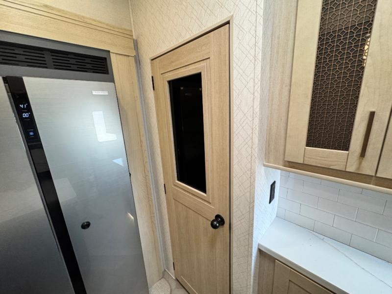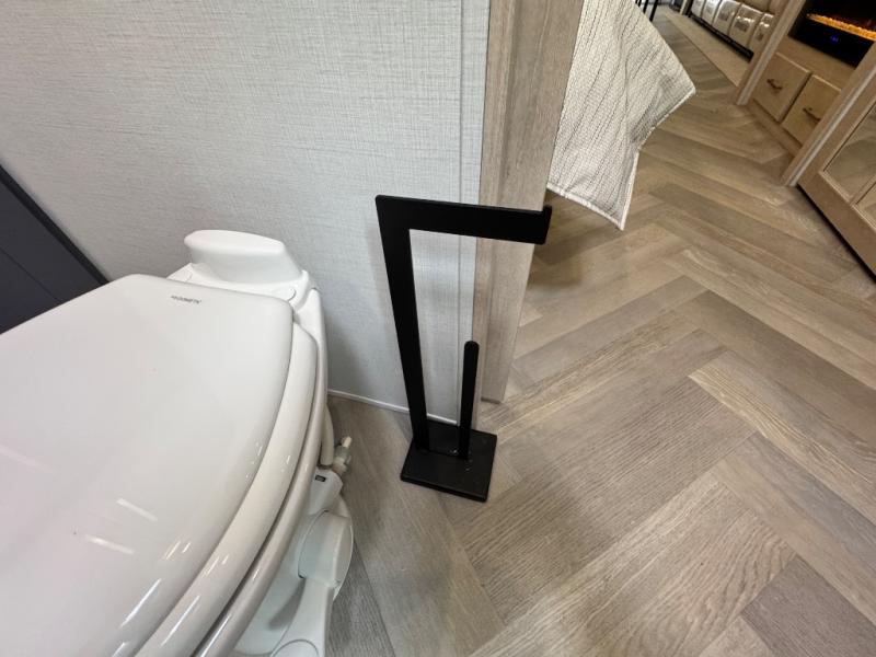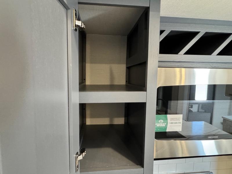 This fifth wheel is sure to wow you! You can easily invite your close neighbor friends along since there is a front den/bedroom that includes dual opposing slides, a Murphy bed/desk, a tri-fold sofa and a wardrobe, plus a full bath! You'll have the master suite towards the back all to yourselves, and here you'll find a king bed slide out, a bedroom fireplace, and a full rear bath, complete with dual bath sinks. There is even a linen closet with washer and dryer prep if you want the option to go full-time! In the morning, everyone can meet in the combined kitchen and living area as the chef whips up breakfast on the four burner cooktop. There is a gourmet island with a flip-up counter and a hidden dinette to provide everyone space to gather around. And you'll love the large sofa with pop-up chargers across from the hidden Smart TV and fireplace. Don't let this fifth wheel slip away!