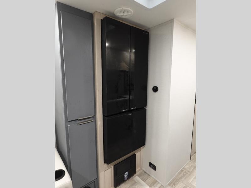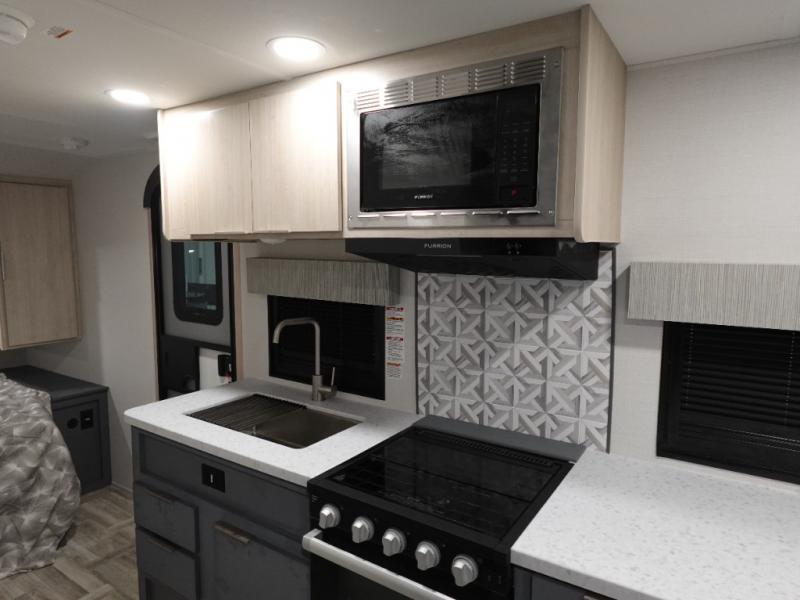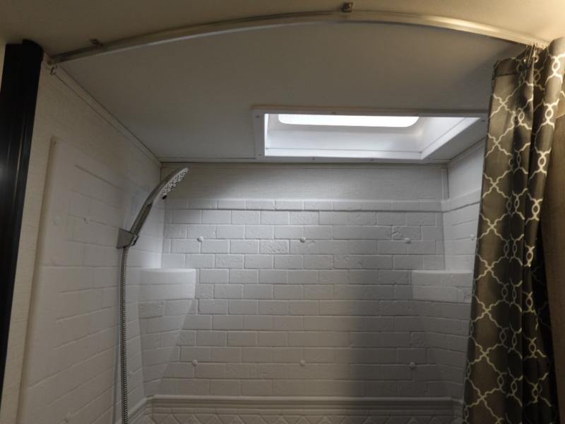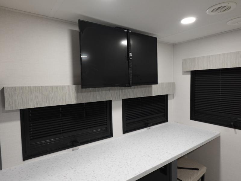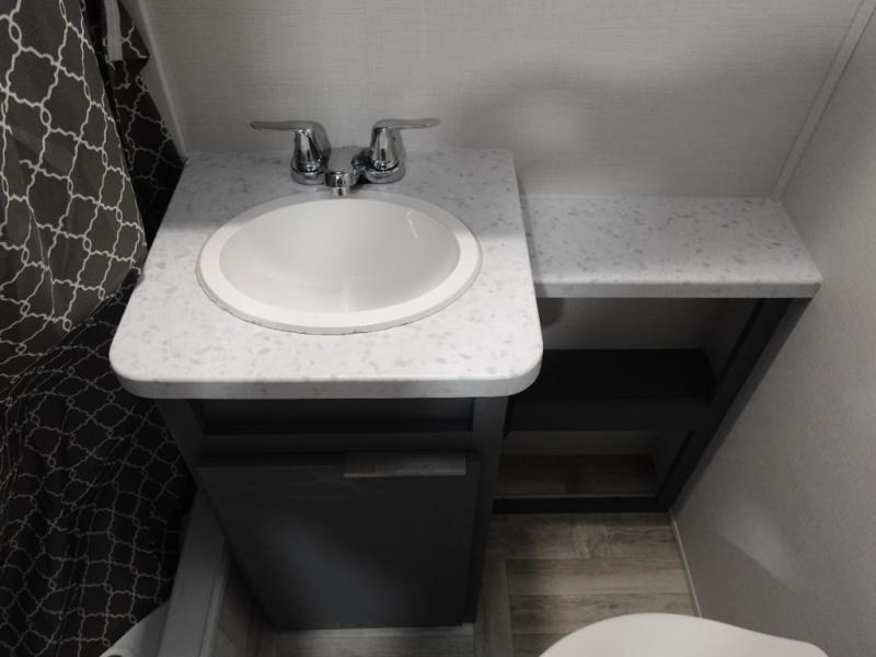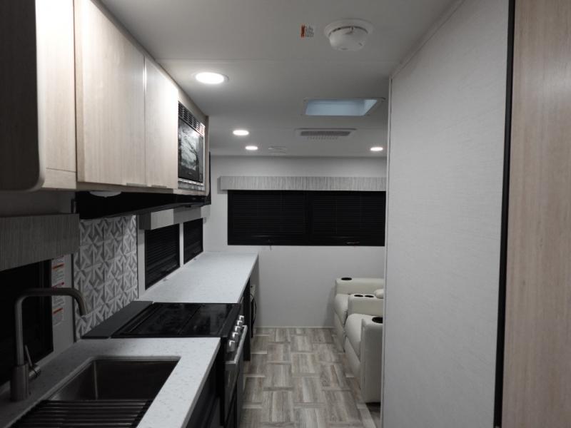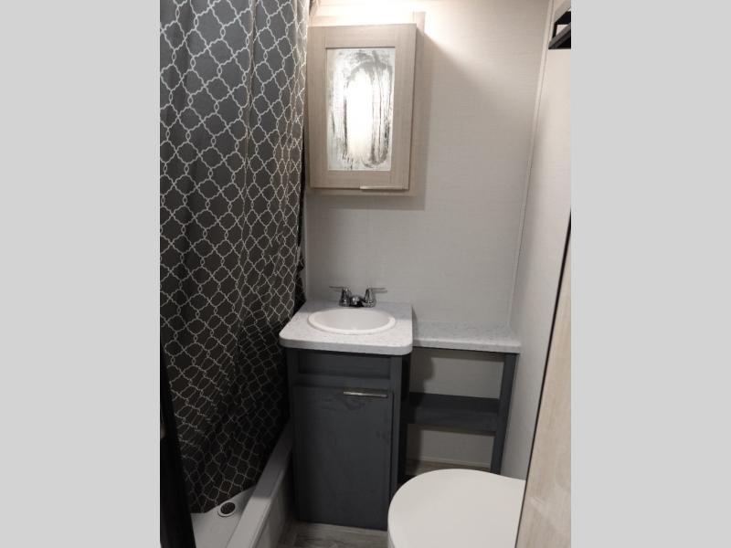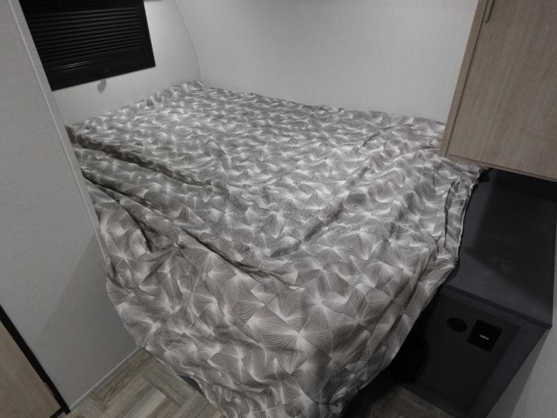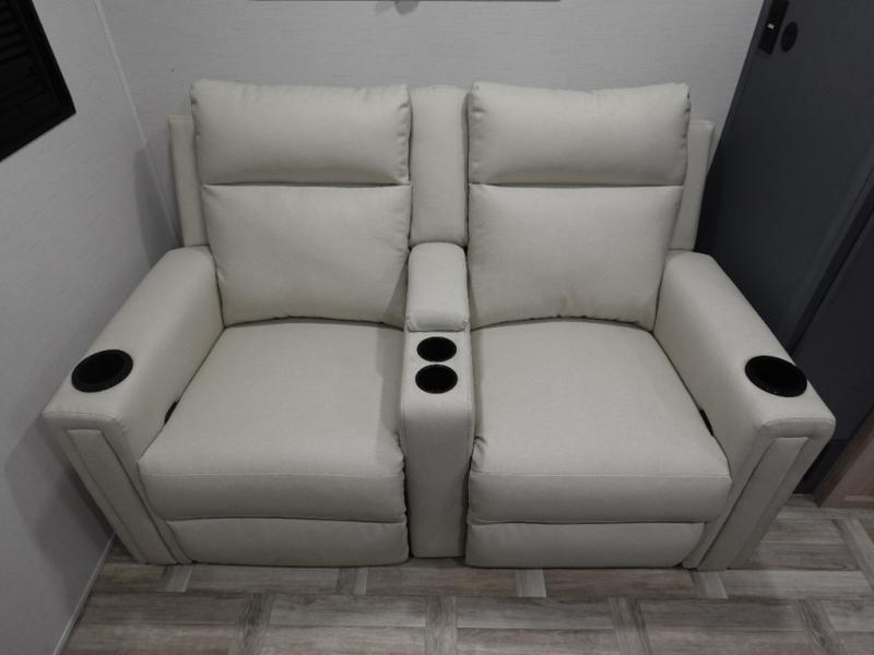 This couple's trailer is perfect for weekend trips to the lake! You'll love waking up each morning on the front queen bed instead of on an air mattress, plus there are overhead cabinets and a wardrobe for your things. The theater seating provides a place for you to relax in the evenings, and the bartop with two stools will be the perfect place to dine together. Making meals will be easier than ever with a three burner cooktop and microwave oven, plus there is a refrigerator and pantry for food storage. And don't overlook the exterior with its pass-thru storage and 15' awning!