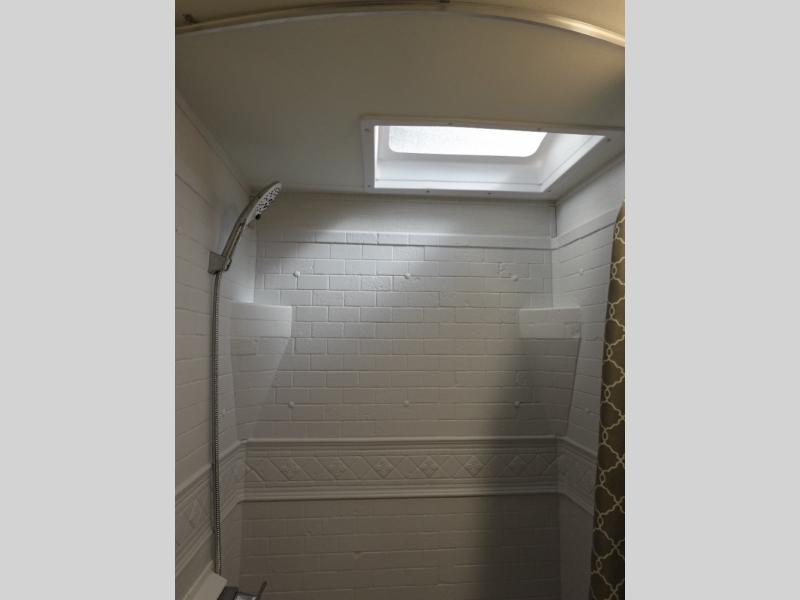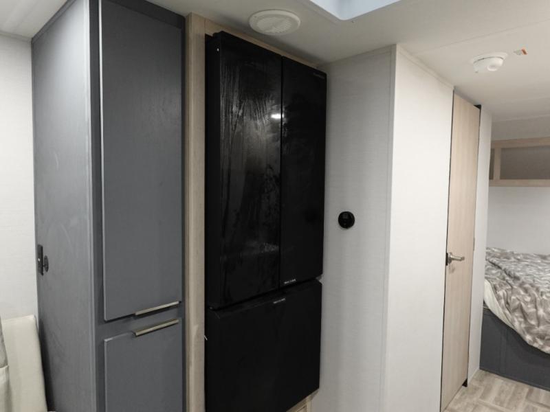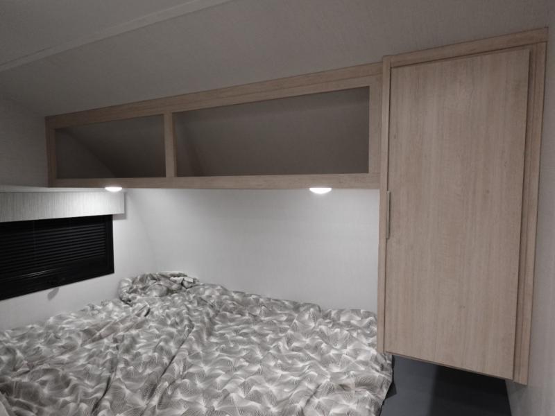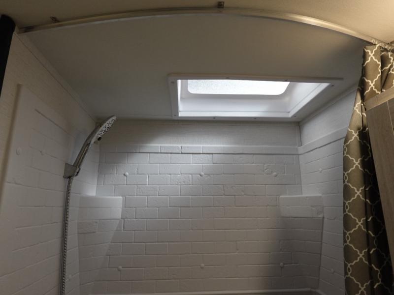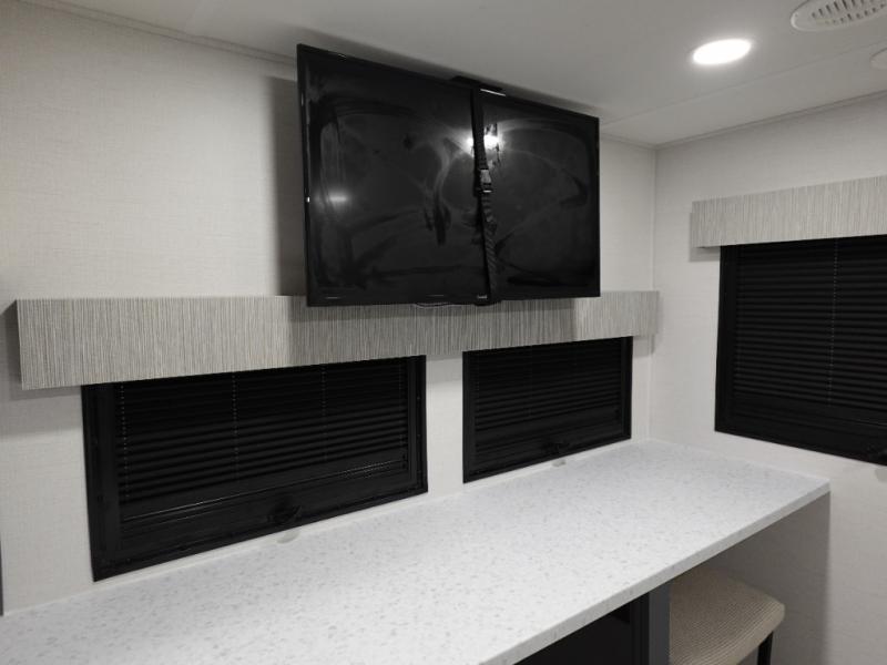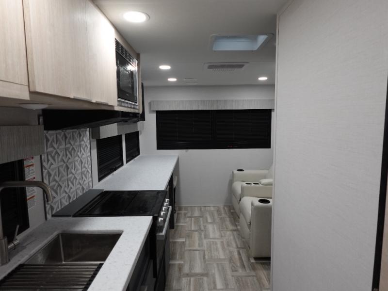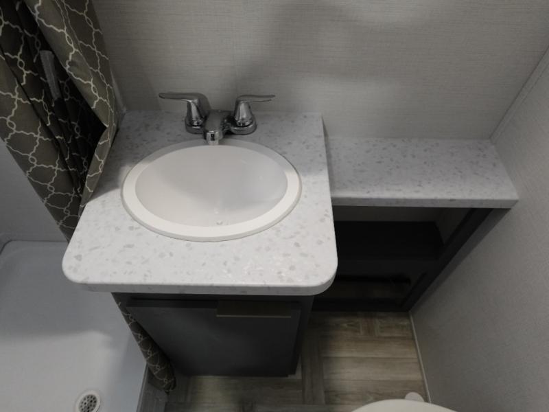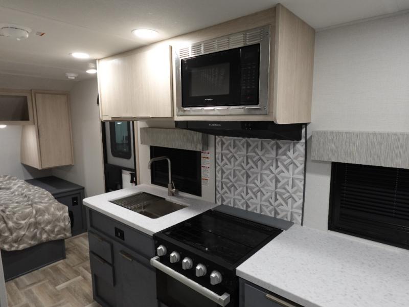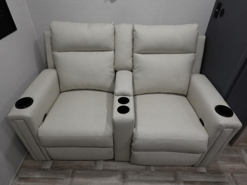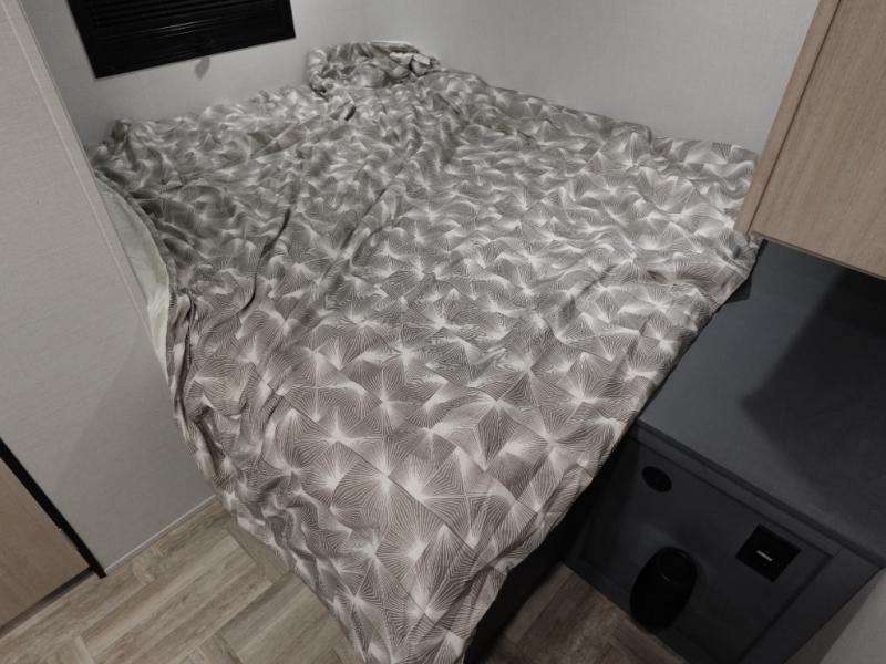 This couple's trailer is perfect for weekend trips to the lake! You'll love waking up each morning on the front queen bed instead of on an air mattress, plus there are overhead cabinets and a wardrobe for your things. The theater seating provides a place for you to relax in the evenings, and the bartop with two stools will be the perfect place to dine together. Making meals will be easier than ever with a three burner cooktop and microwave oven, plus there is a refrigerator and pantry for food storage. And don't overlook the exterior with its pass-thru storage and 15' awning!