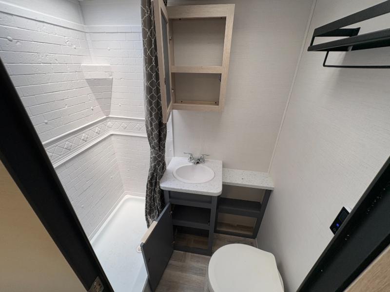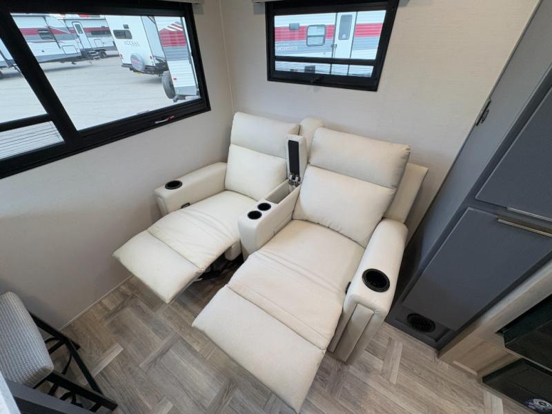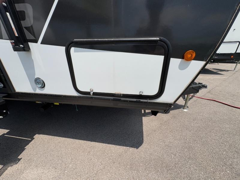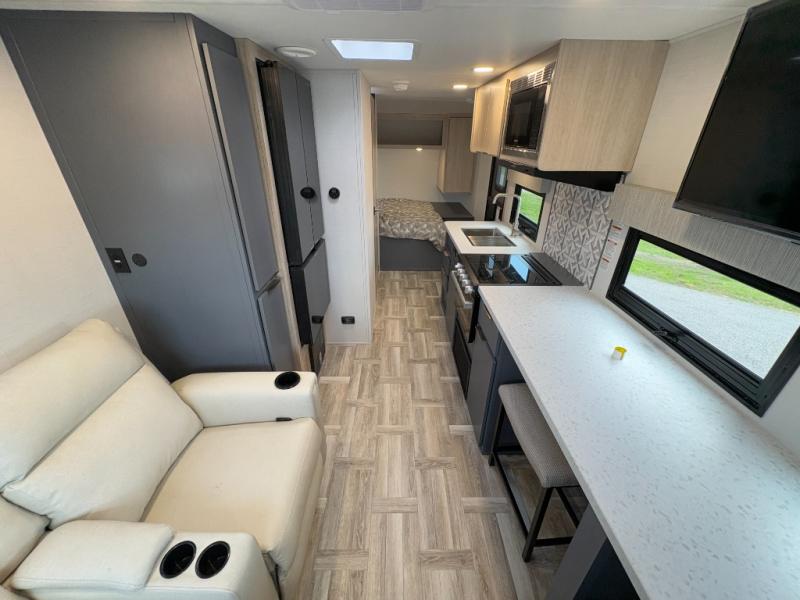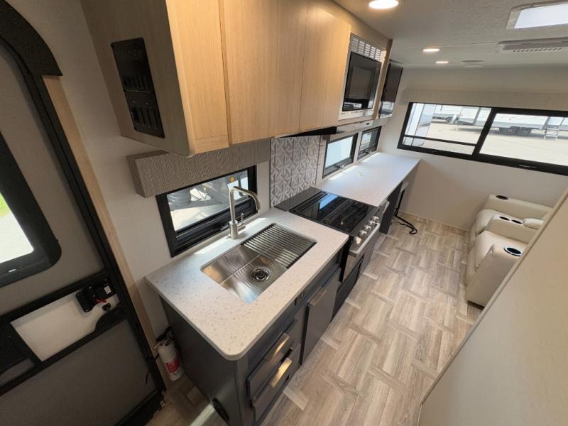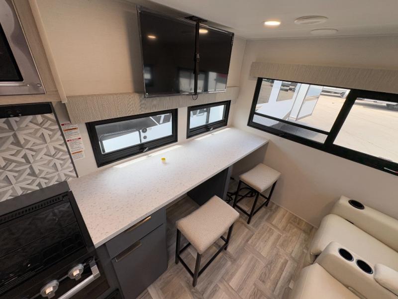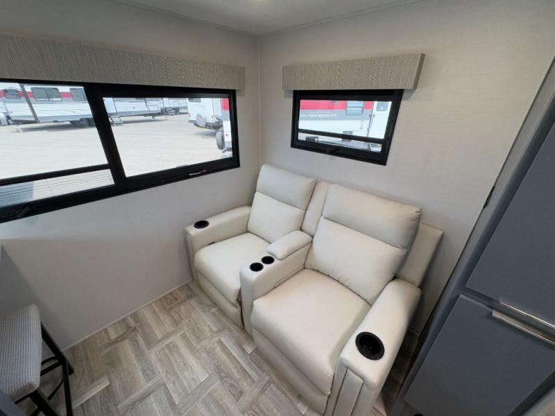 This couple's trailer is perfect for weekend trips to the lake! You'll love waking up each morning on the front queen bed instead of on an air mattress, plus there are overhead cabinets and a wardrobe for your things. The theater seating provides a place for you to relax in the evenings, and the bartop with two stools will be the perfect place to dine together. Making meals will be easier than ever with a three burner cooktop and microwave oven, plus there is a refrigerator and pantry for food storage. And don't overlook the exterior with its pass-thru storage and 15' awning!