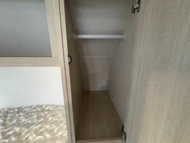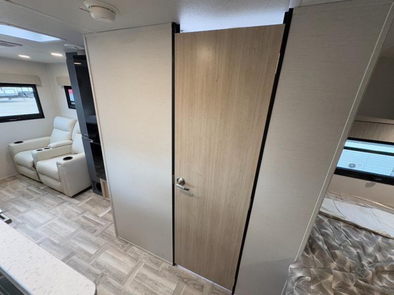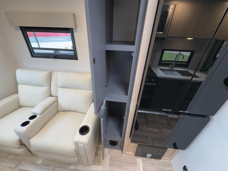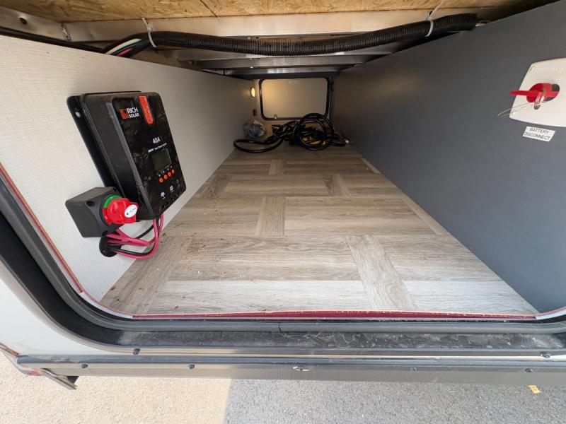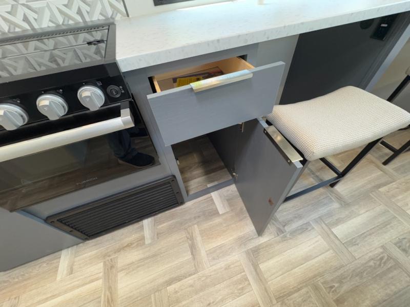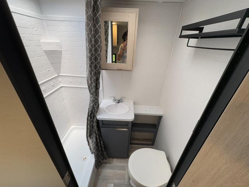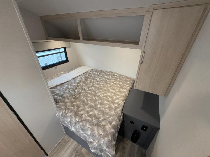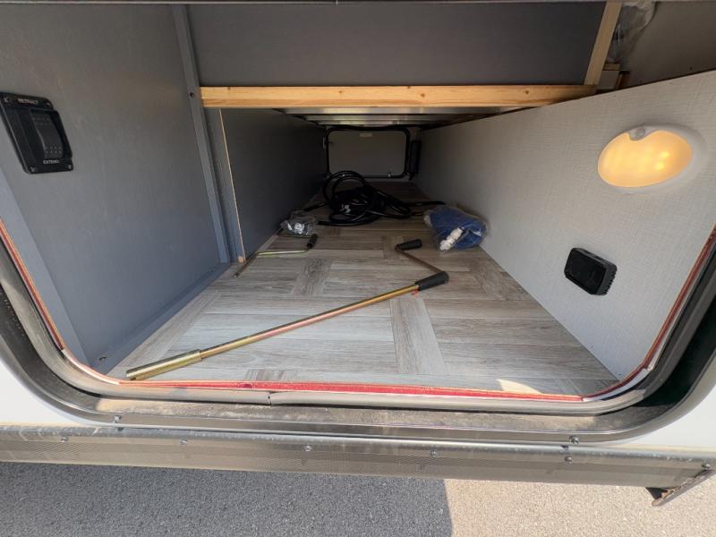 This couple's trailer is perfect for weekend trips to the lake! You'll love waking up each morning on the front queen bed instead of on an air mattress, plus there are overhead cabinets and a wardrobe for your things. The theater seating provides a place for you to relax in the evenings, and the bartop with two stools will be the perfect place to dine together. Making meals will be easier than ever with a three burner cooktop and microwave oven, plus there is a refrigerator and pantry for food storage. And don't overlook the exterior with its pass-thru storage and 15' awning!