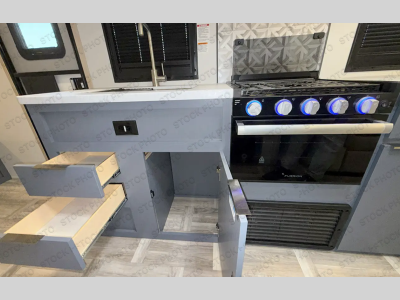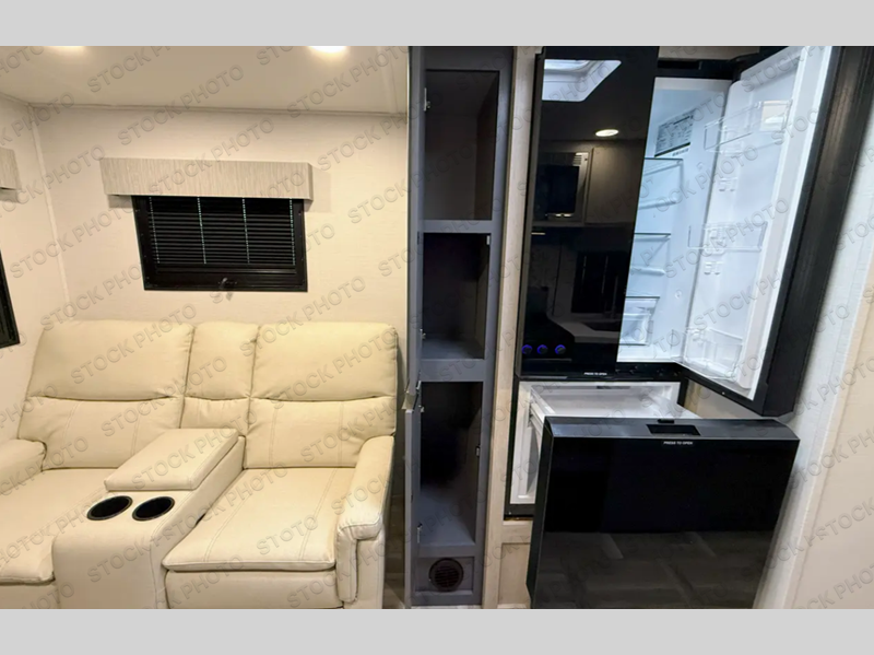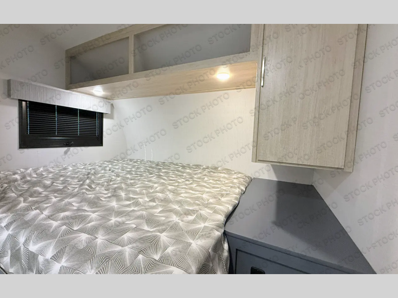 This couple's trailer is perfect for weekend trips to the lake! You'll love waking up each morning on the front queen bed instead of on an air mattress, plus there are overhead cabinets and a wardrobe for your things. The theater seating provides a place for you to relax in the evenings, and the bartop with two stools will be the perfect place to dine together. Making meals will be easier than ever with a three burner cooktop and microwave oven, plus there is a refrigerator and pantry for food storage. And don't overlook the exterior with its pass-thru storage and 15' awning!