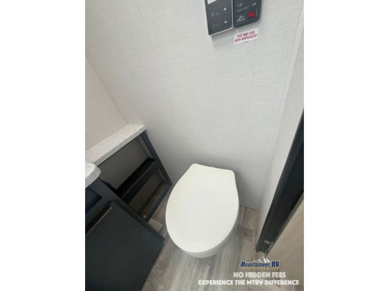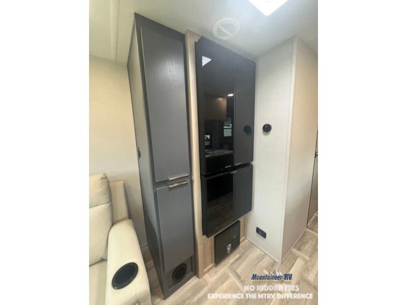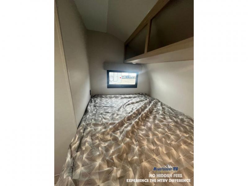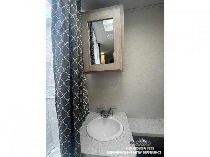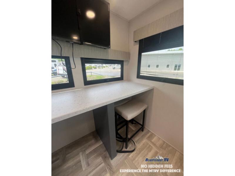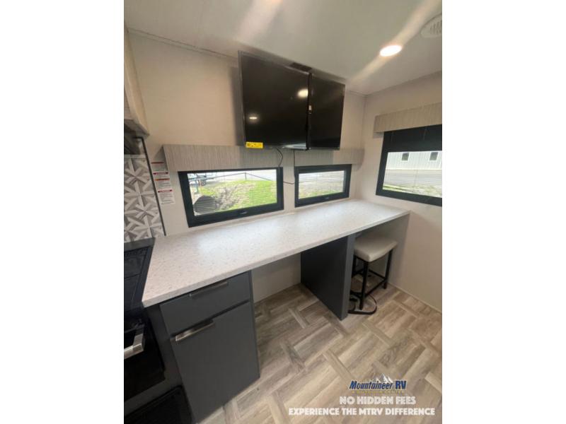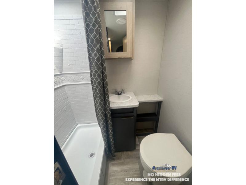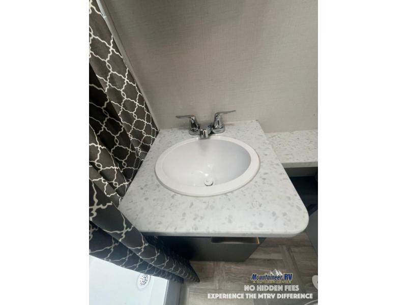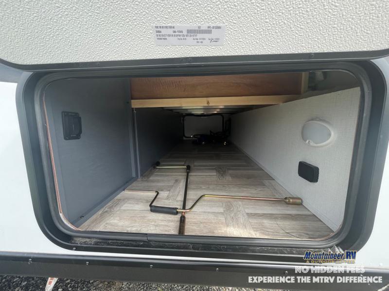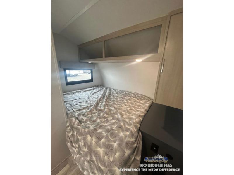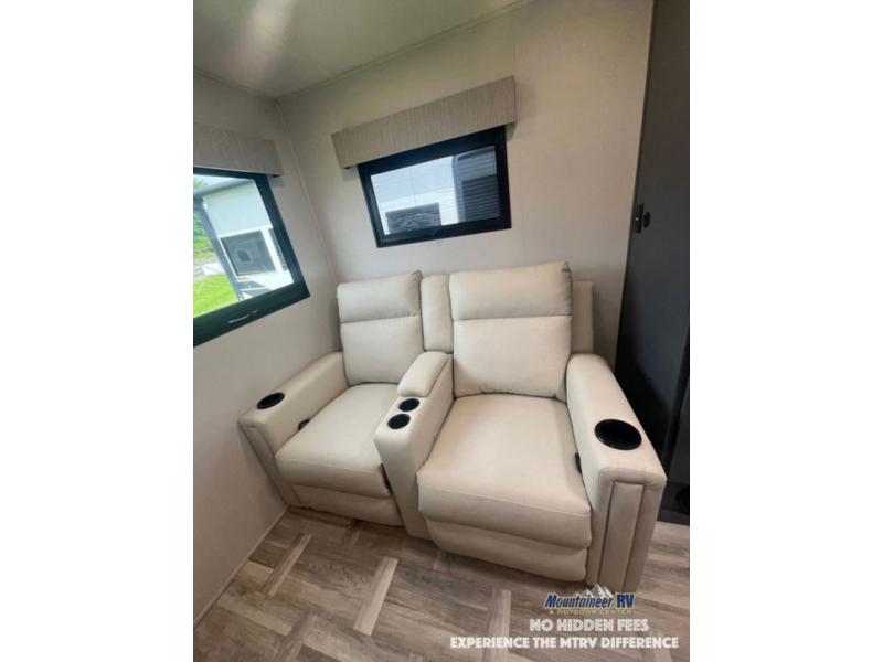 This couple's trailer is perfect for weekend trips to the lake! You'll love waking up each morning on the front queen bed instead of on an air mattress, plus there are overhead cabinets and a wardrobe for your things. The theater seating provides a place for you to relax in the evenings, and the bartop with two stools will be the perfect place to dine together. Making meals will be easier than ever with a three burner cooktop and microwave oven, plus there is a refrigerator and pantry for food storage. And don't overlook the exterior with its pass-thru storage and 15' awning!