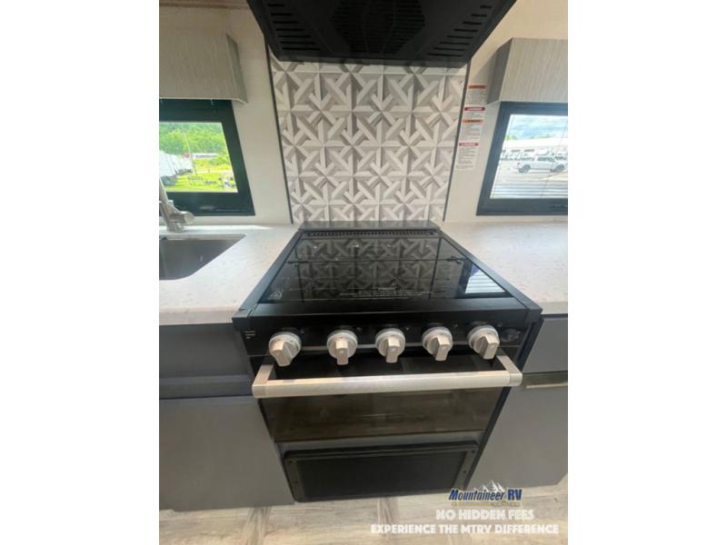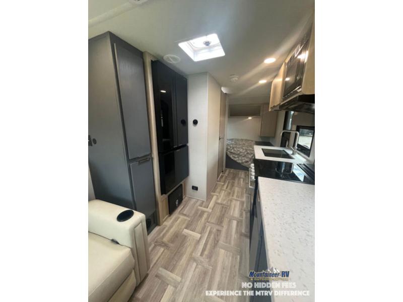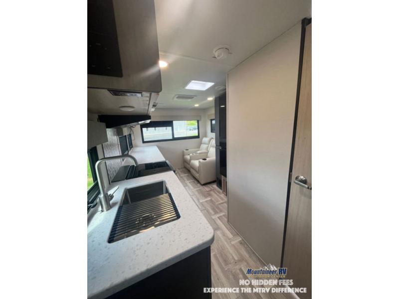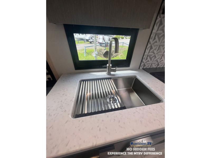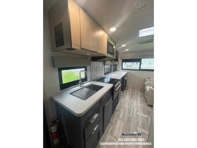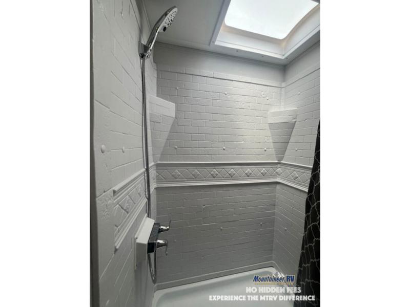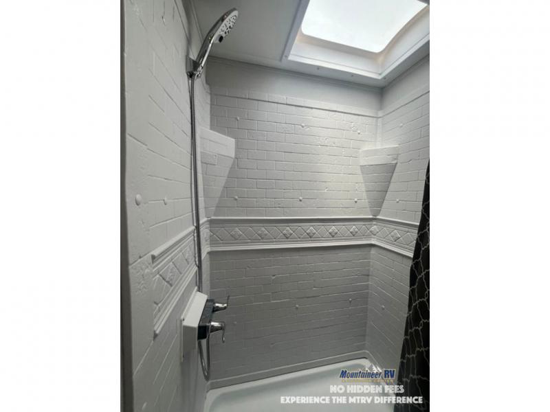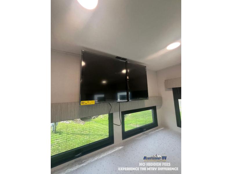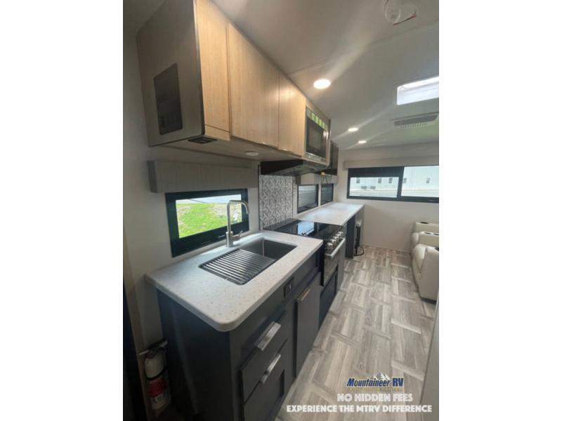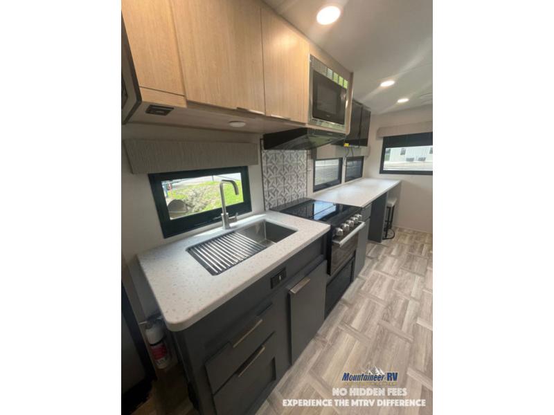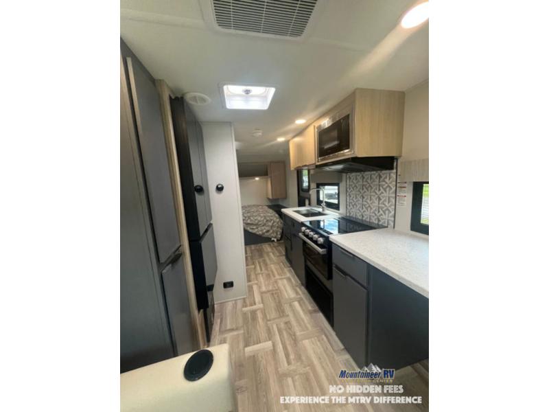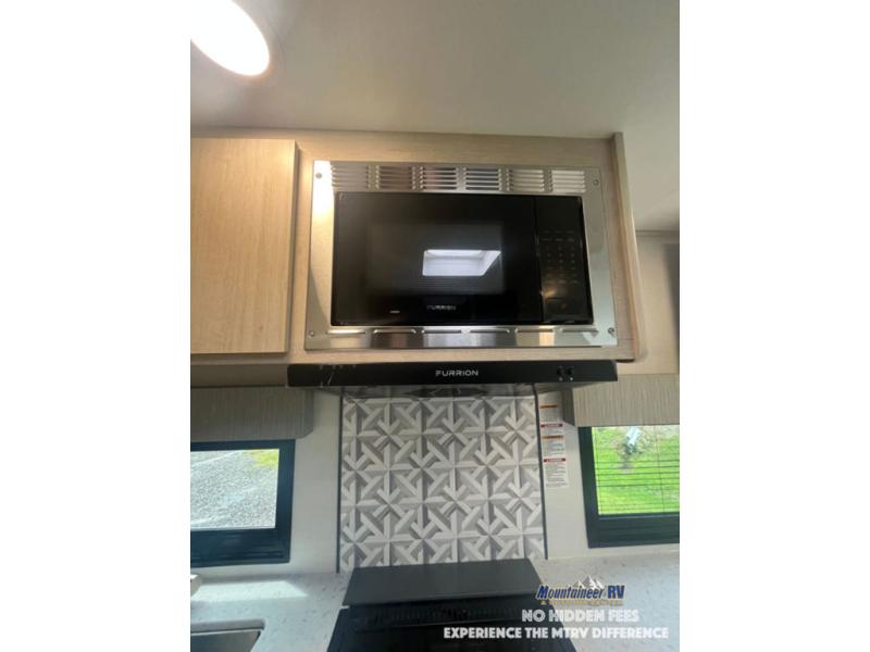 This couple's trailer is perfect for weekend trips to the lake! You'll love waking up each morning on the front queen bed instead of on an air mattress, plus there are overhead cabinets and a wardrobe for your things. The theater seating provides a place for you to relax in the evenings, and the bartop with two stools will be the perfect place to dine together. Making meals will be easier than ever with a three burner cooktop and microwave oven, plus there is a refrigerator and pantry for food storage. And don't overlook the exterior with its pass-thru storage and 15' awning!