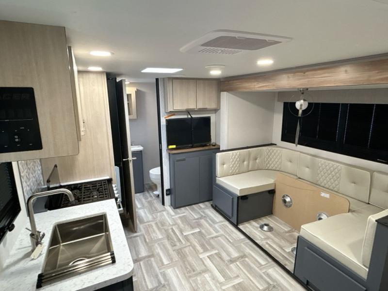Each Tracer LE travel trailer by Prime Time is made to last with its Eternabond construction, and there is a power awning with LED lights for an inviting outdoor living space. There is a manual tongue jack and manual stabilizer jacks outside, along with an XL grab handle and steel entry steps to provide a sturdy entrance and exit into your trailer. You will fall in love with the interior that includes LED lighting, a stainless steel galley sink, a 15k BTU A/C, and a soundbar to listen to your favorite tunes. You will also love the Tracer LE Solar Package that comes with a 200W solar panel, a 40A MPPT charge controller, and a solar disconnect switch for off-grid capabilities!