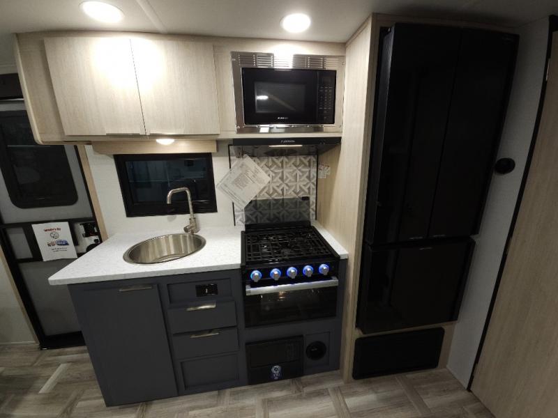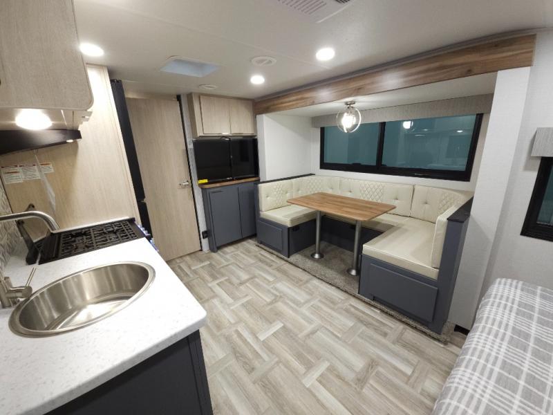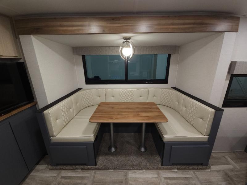 Looking to travel to see new campgrounds and enjoy the outdoors? This trailer offers you that choice then you can return to inside comforts with a queen bed and dual wardrobes and a U-shaped dinette slide out that allows you to provide more sleeping space. The galley kitchen offers a 2-in-1 gas oven and range, plus a large two-door 12V refrigerator and a microwave. The rear full bathroom might just be the reason you wanted this RV thanks to the privacy, the linen storage, and all the amenities that allow you to skip the public facilities.