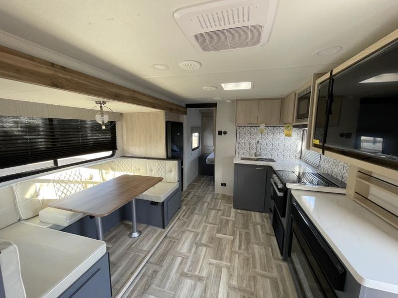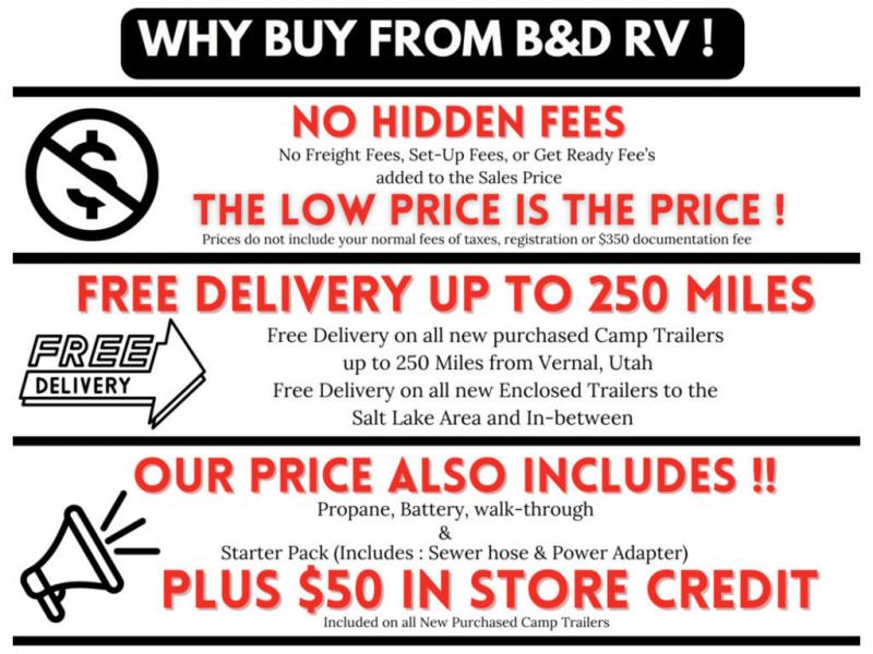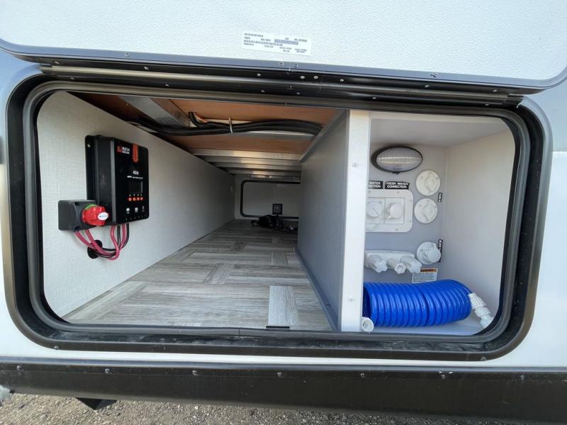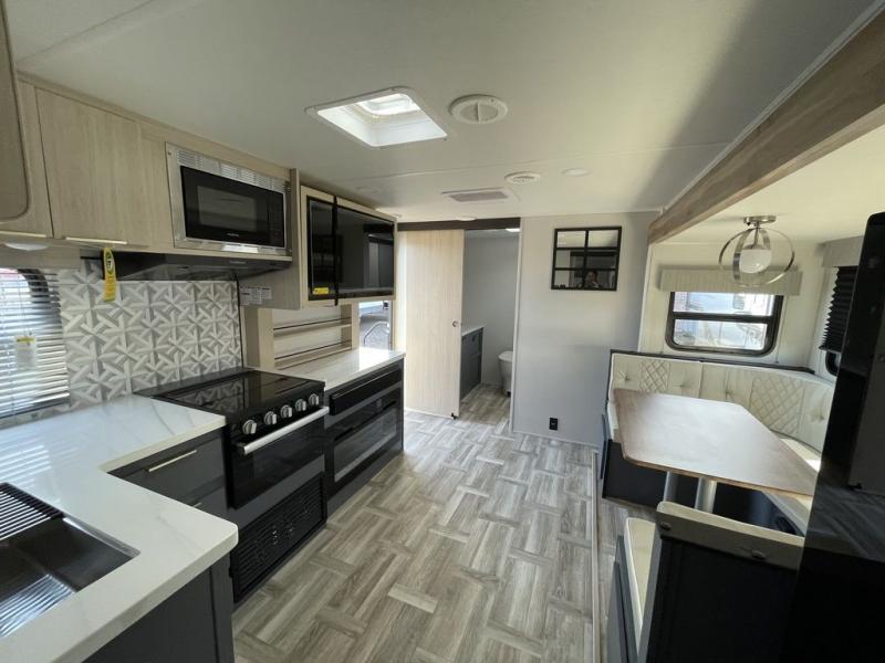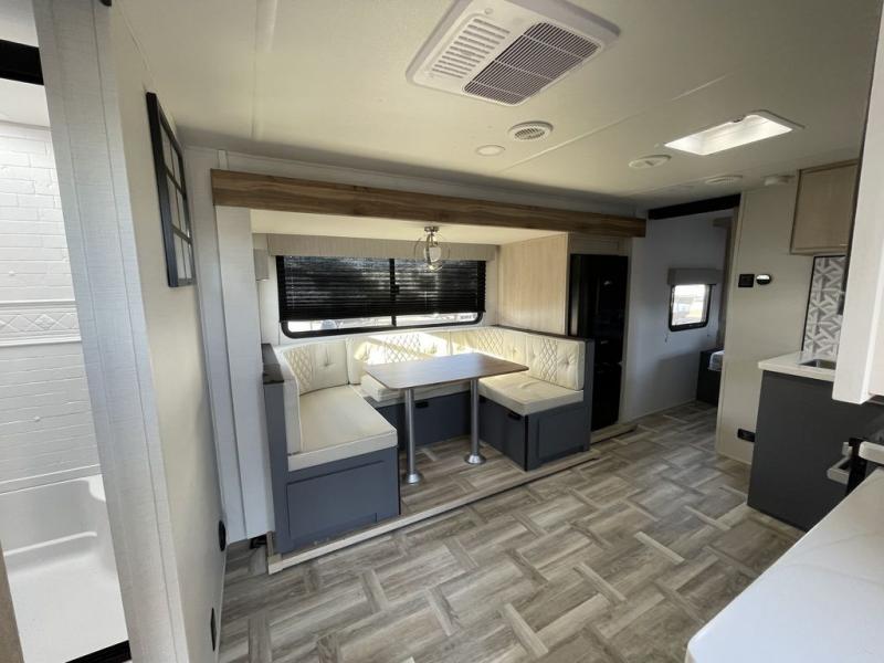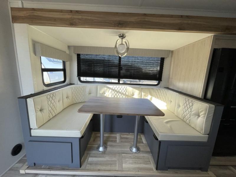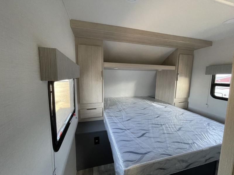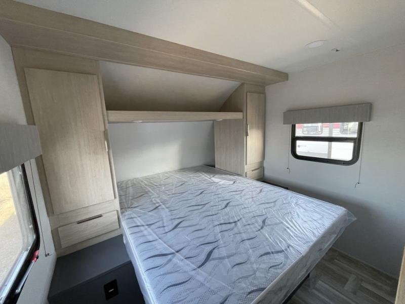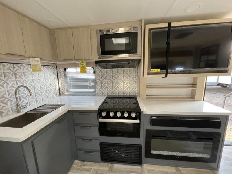 Four people can sleep comfortably in this travel trailer, so pack up and head for the hills! Once you arrive at the campground, you can unpack your gear from the exterior pass-through, then start lunch on the exterior camp kitchen. You will also find a fully-equipped indoor kitchen when the weather isn't cooperating. Once you've stretched your legs, head inside to freshen up in the full rear bath, or play a game around the U-shaped dinette slide. There is an LED TV within the entertainment center, plus a fireplace to make this area feel more like home, and when you're ready for some shut-eye, the front private bedroom will be waiting for you!