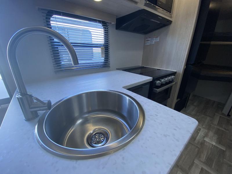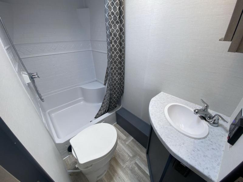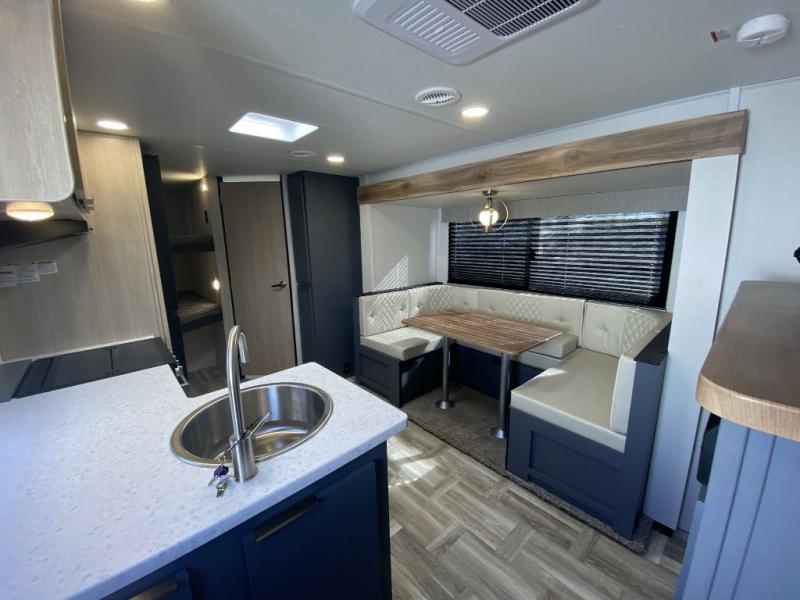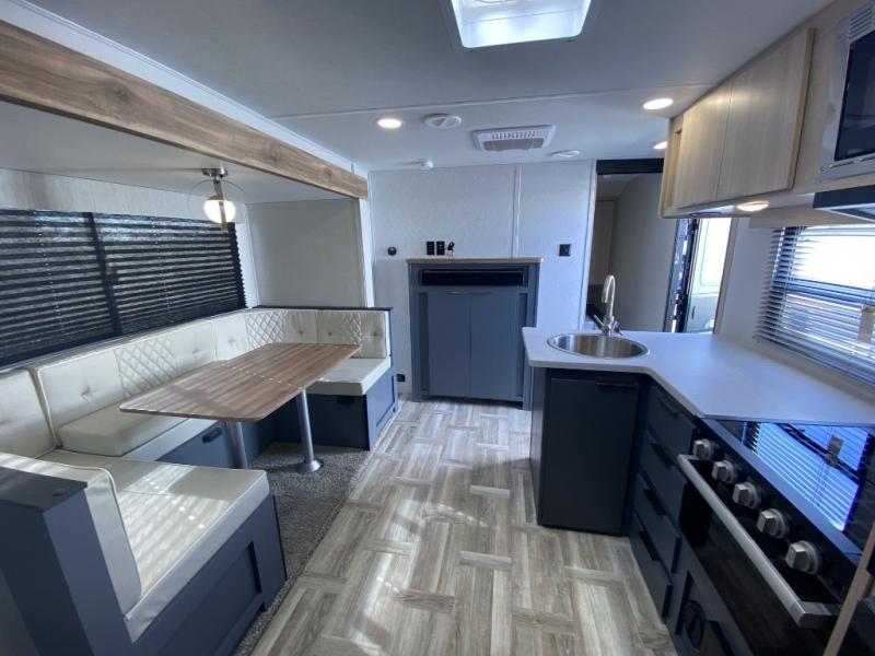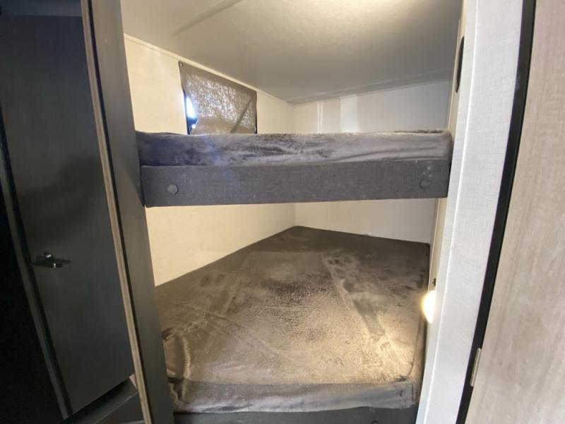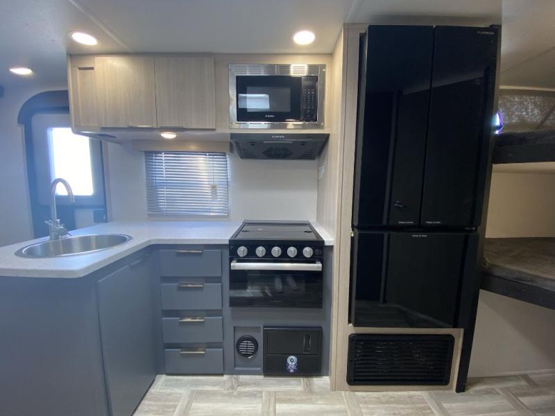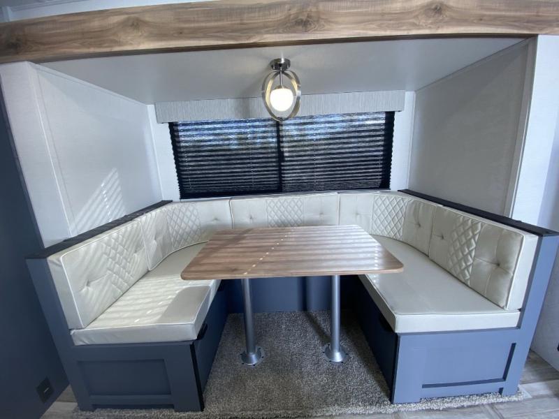 Camping with your friends and family can be comfortable and fun when you have this trailer! From the double-size bunks next to the full bathroom to the queen bed up front, everyone will have their own space. The U-shaped dinette slide out offers extra floor space and elbow room, and the kitchen offers full amenities including an L-shaped counter with a kitchen sink to keep everything clean.