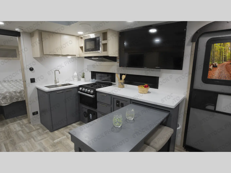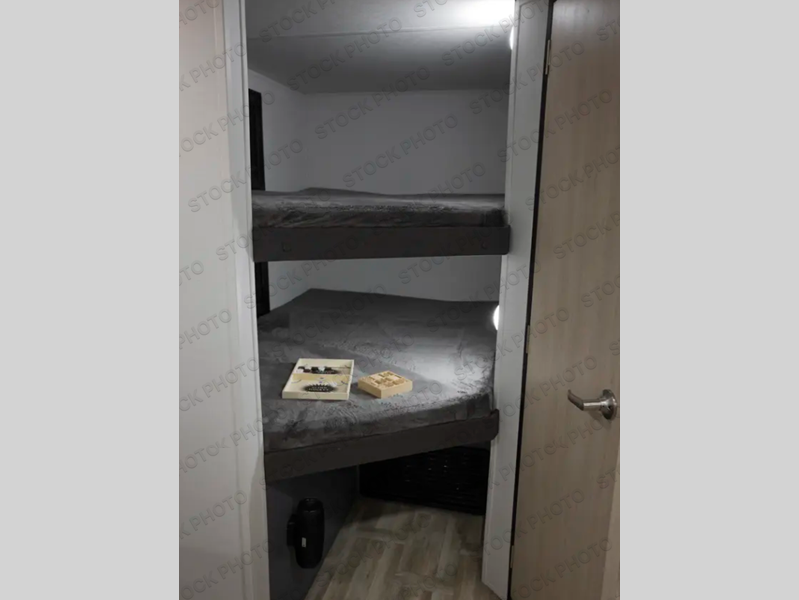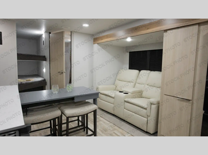 If you're looking for more comfort and a larger sleeping capacity in your next RV, this travel trailer is the one! There are double-size bunks in the rear corner, along with a ladder to easily hop into bed, and the full bath is in the other rear corner for easy nighttime use. You'll enjoy the front private bedroom with its queen bed and dual wardrobes for your things. In the morning, you can make breakfast in the full kitchen, then dine at the bartop with three stools. Or head outdoors to cook on the camp kitchen and eat under the awning! There is also a theater seat within the slide out for more comfort and space, plus the pantry and refrigerator are here so you can easily grab a snack!