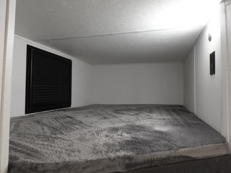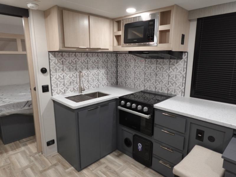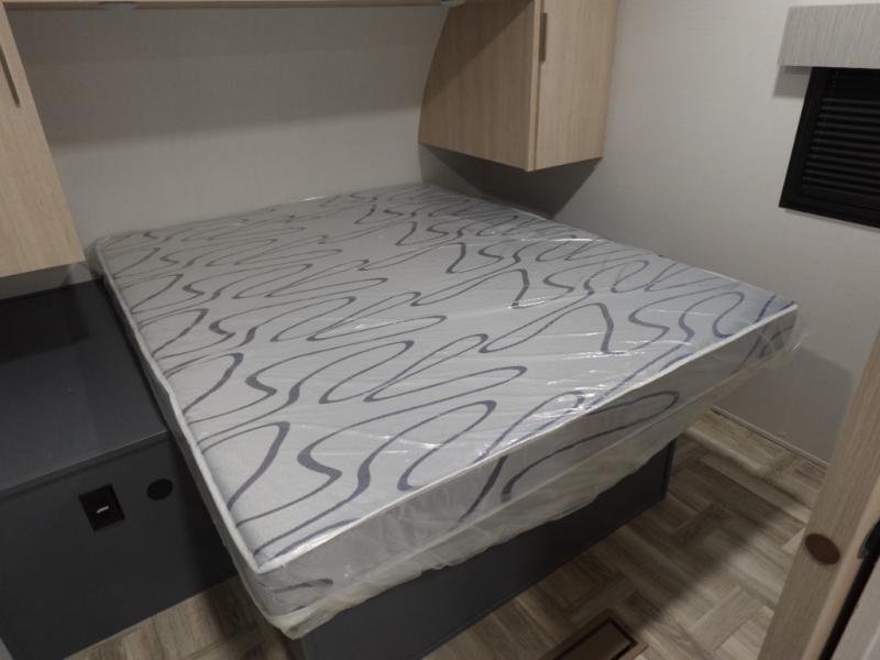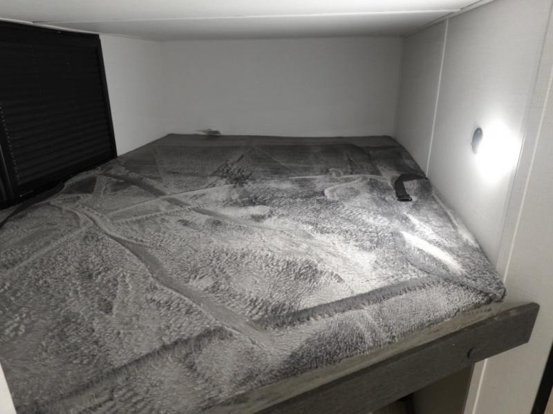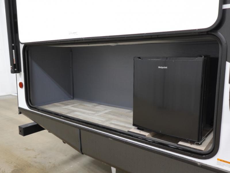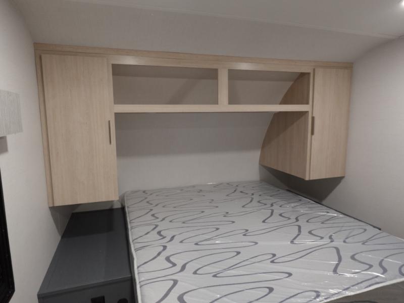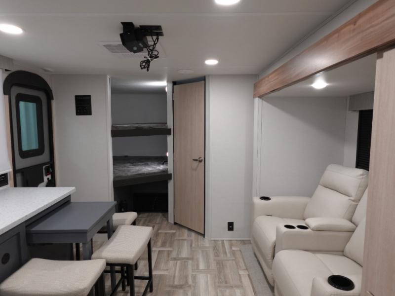 If you're looking for more comfort and a larger sleeping capacity in your next RV, this travel trailer is the one! There are double-size bunks in the rear corner, along with a ladder to easily hop into bed, and the full bath is in the other rear corner for easy nighttime use. You'll enjoy the front private bedroom with its queen bed and dual wardrobes for your things. In the morning, you can make breakfast in the full kitchen, then dine at the bartop with three stools. Or head outdoors to cook on the camp kitchen and eat under the awning! There is also a theater seat within the slide out for more comfort and space, plus the pantry and refrigerator are here so you can easily grab a snack!