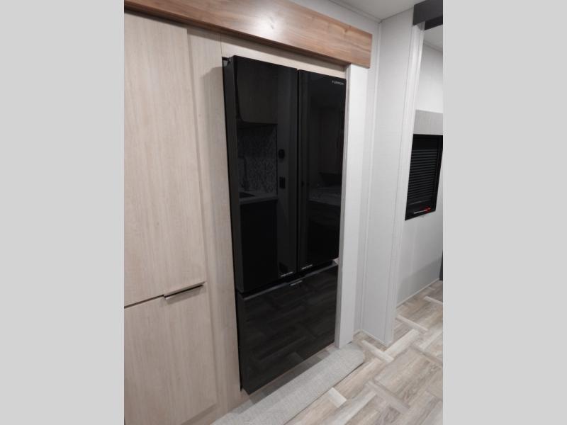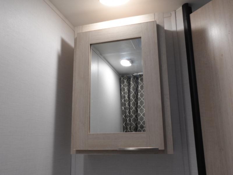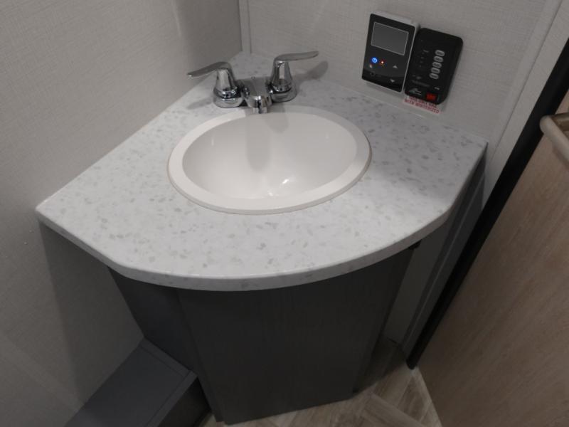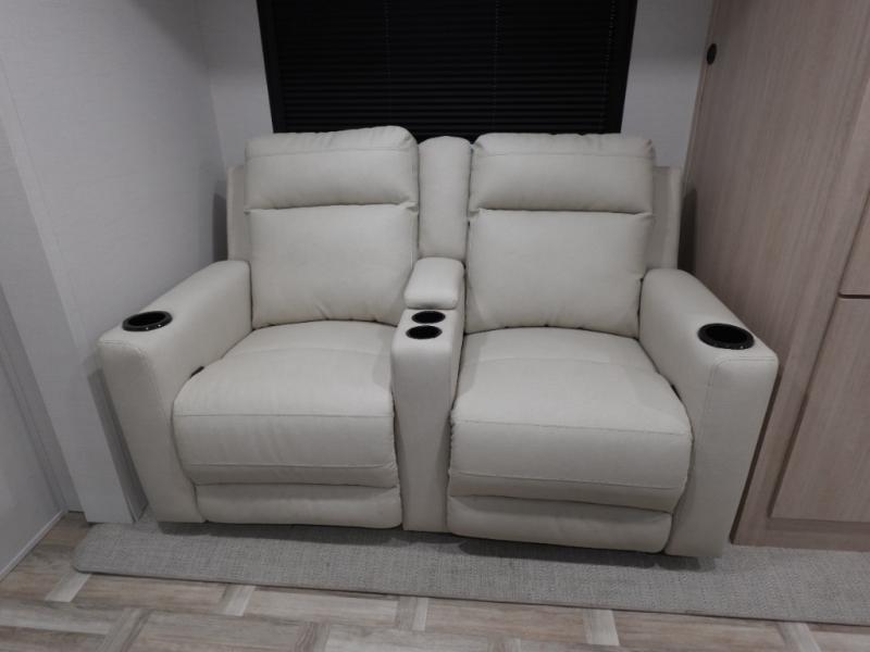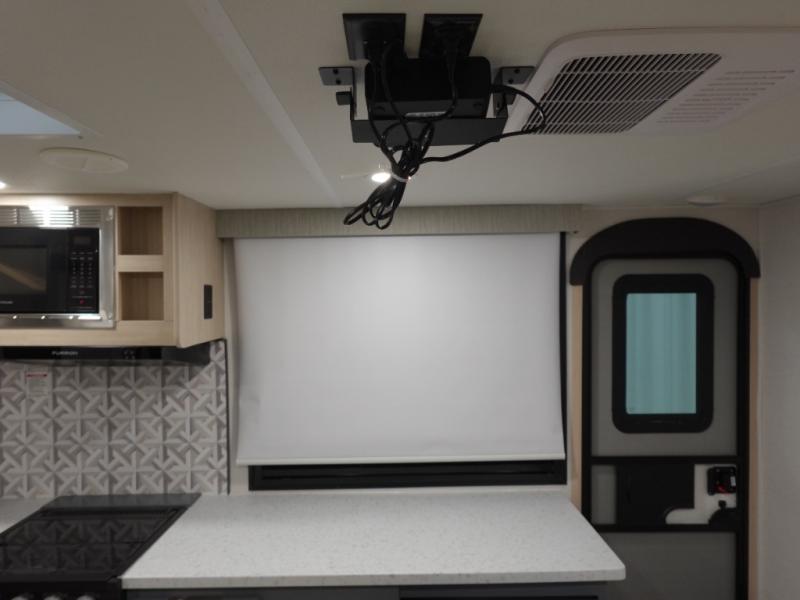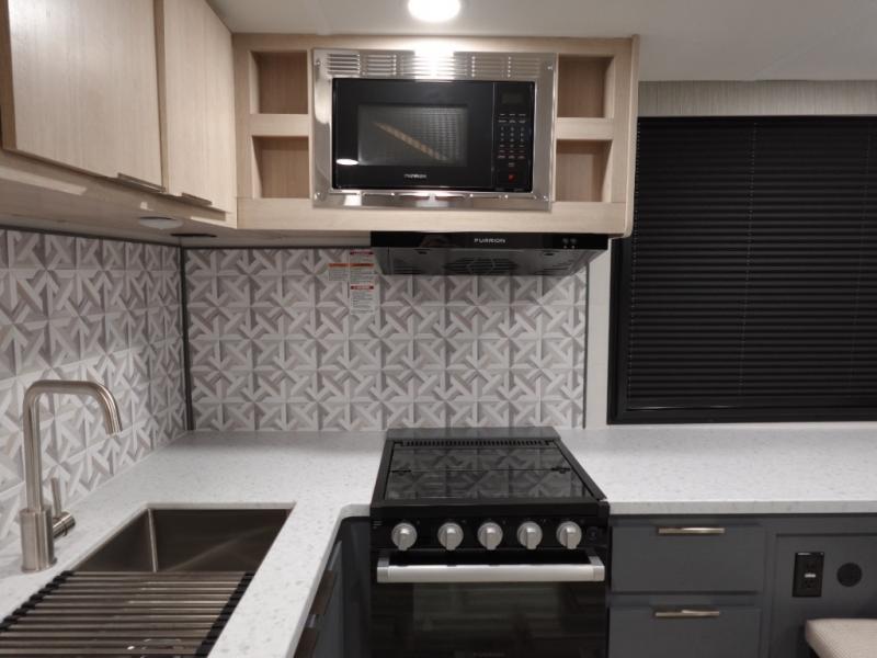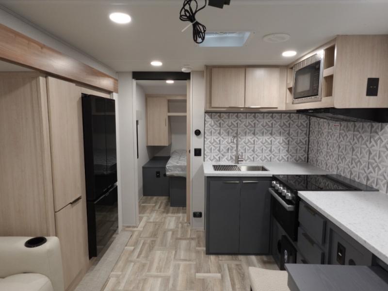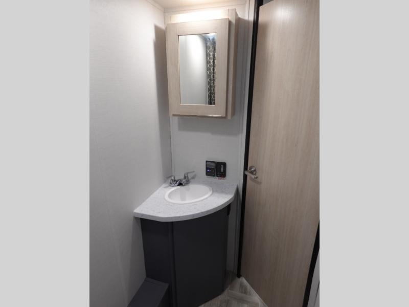 If you're looking for more comfort and a larger sleeping capacity in your next RV, this travel trailer is the one! There are double-size bunks in the rear corner, along with a ladder to easily hop into bed, and the full bath is in the other rear corner for easy nighttime use. You'll enjoy the front private bedroom with its queen bed and dual wardrobes for your things. In the morning, you can make breakfast in the full kitchen, then dine at the bartop with three stools. Or head outdoors to cook on the camp kitchen and eat under the awning! There is also a theater seat within the slide out for more comfort and space, plus the pantry and refrigerator are here so you can easily grab a snack!
