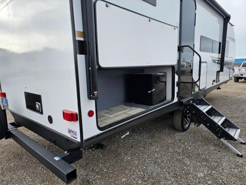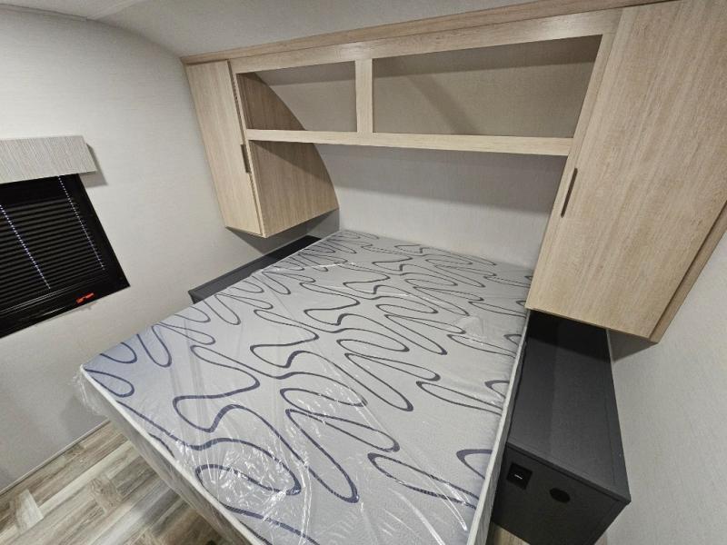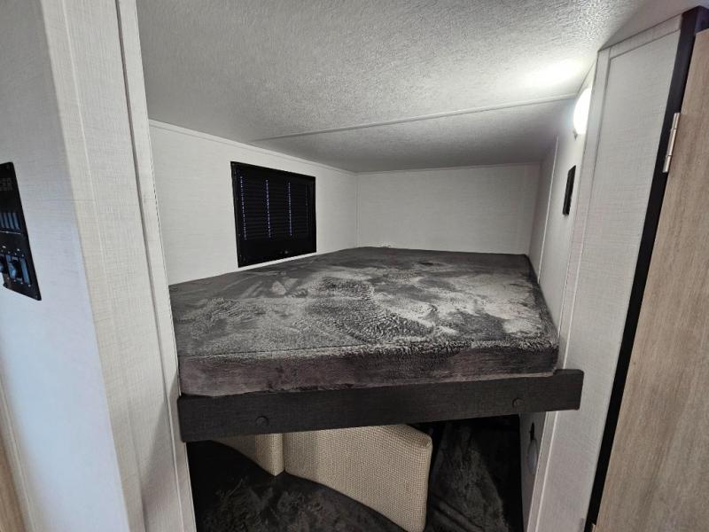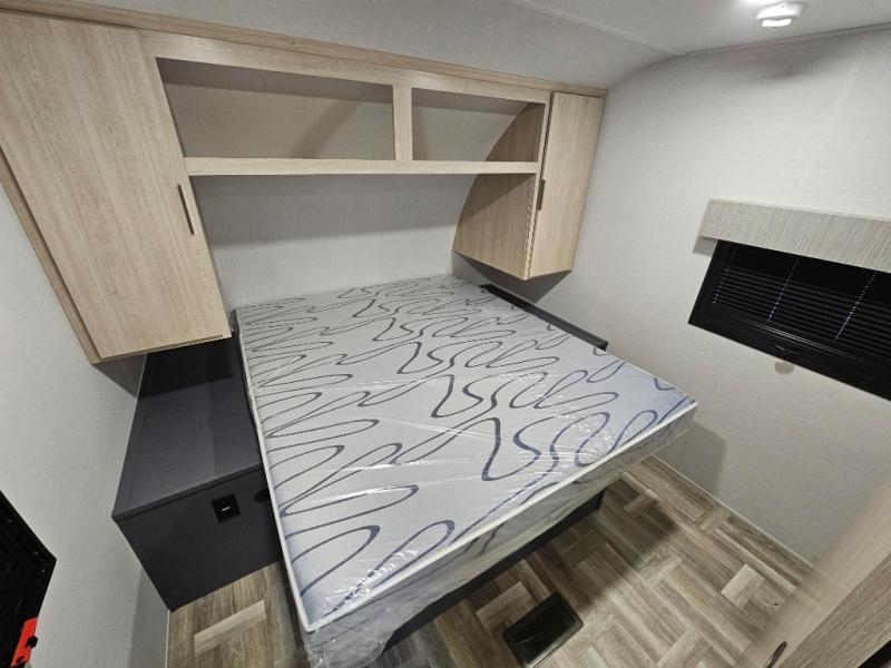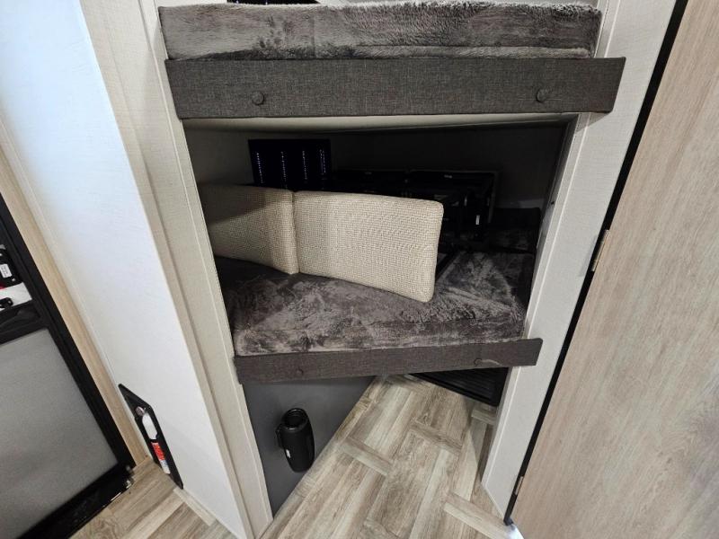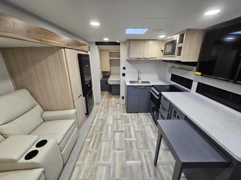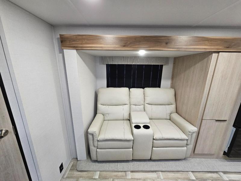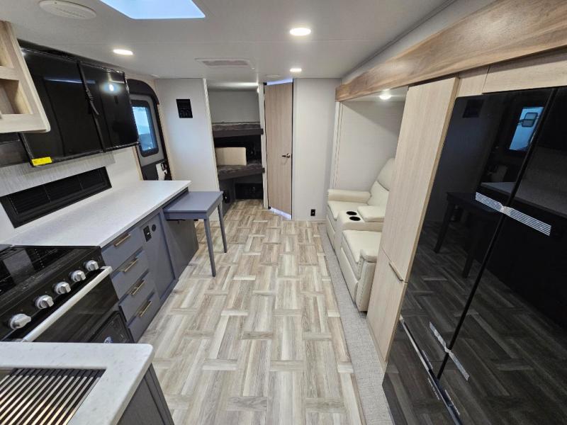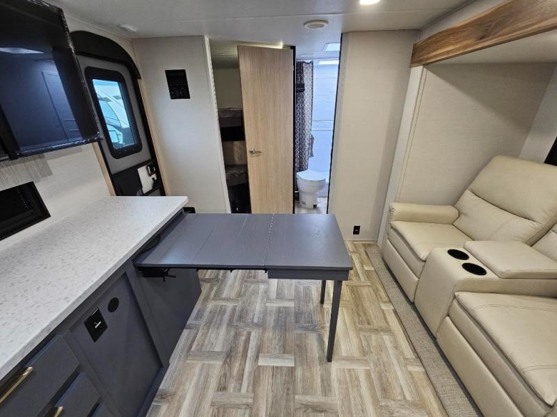 If you're looking for more comfort and a larger sleeping capacity in your next RV, this travel trailer is the one! There are double-size bunks in the rear corner, along with a ladder to easily hop into bed, and the full bath is in the other rear corner for easy nighttime use. You'll enjoy the front private bedroom with its queen bed and dual wardrobes for your things. In the morning, you can make breakfast in the full kitchen, then dine at the bartop with three stools. Or head outdoors to cook on the camp kitchen and eat under the awning! There is also a theater seat within the slide out for more comfort and space, plus the pantry and refrigerator are here so you can easily grab a snack!