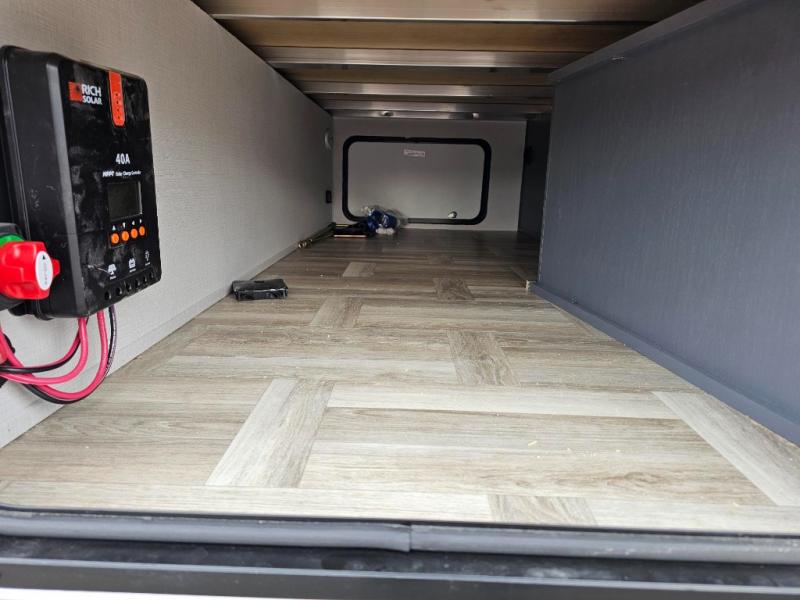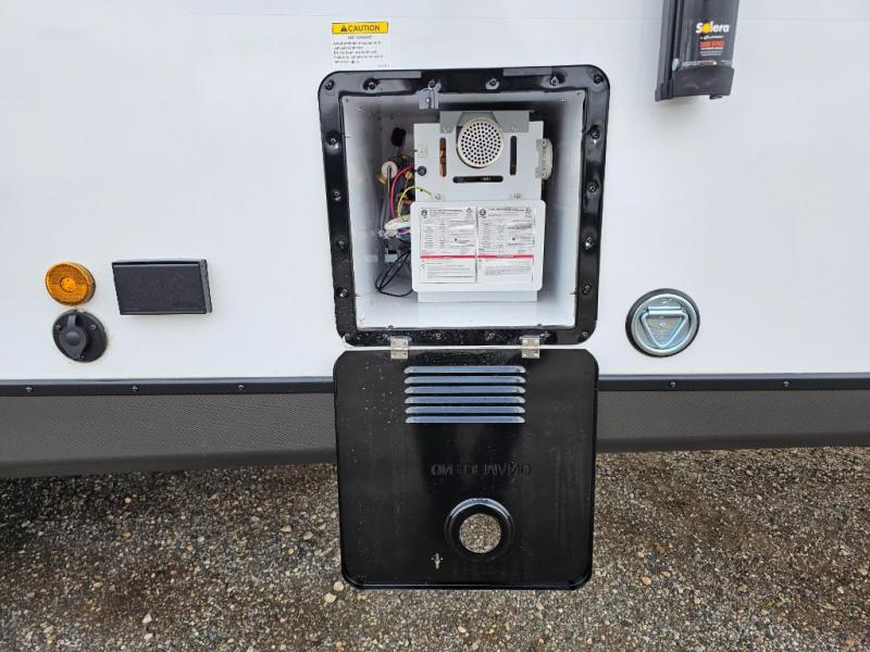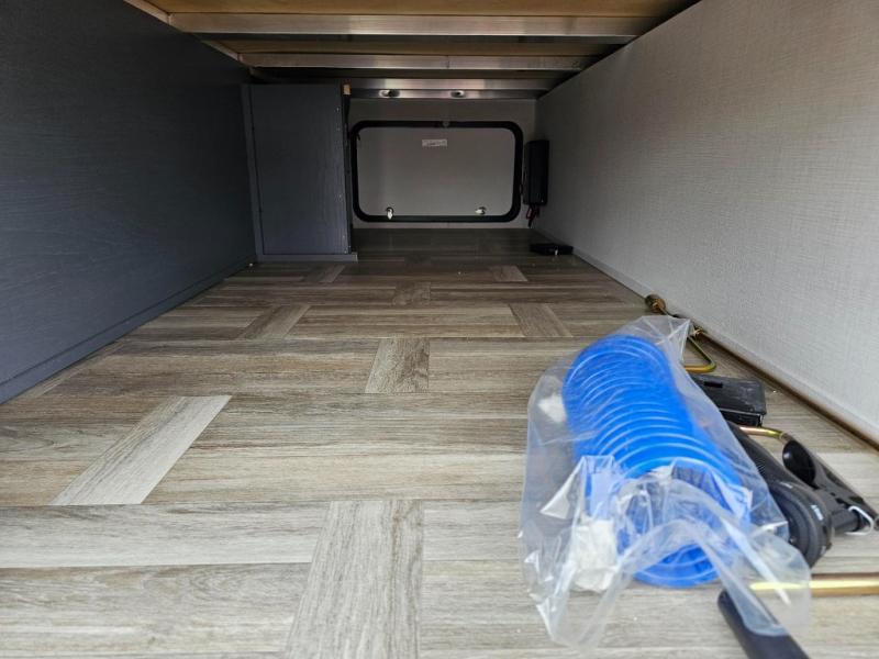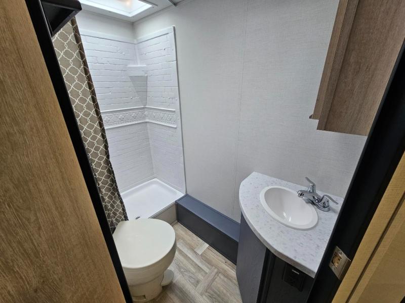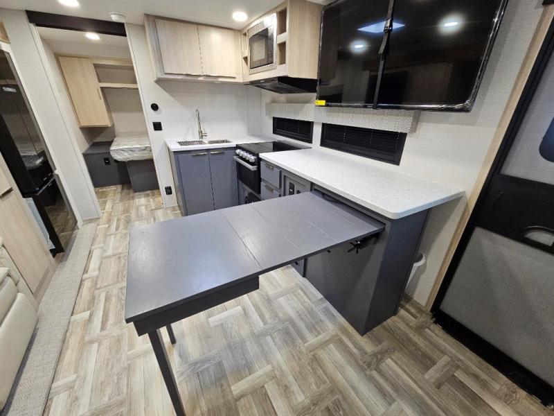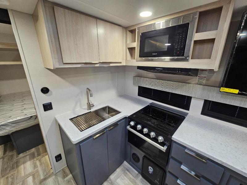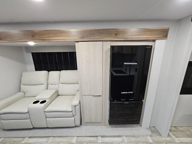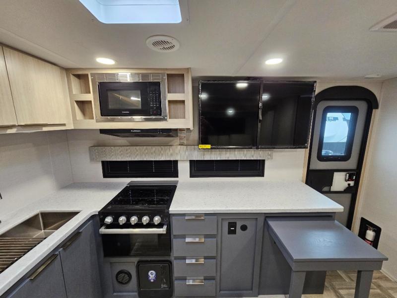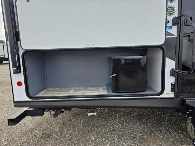 If you're looking for more comfort and a larger sleeping capacity in your next RV, this travel trailer is the one! There are double-size bunks in the rear corner, along with a ladder to easily hop into bed, and the full bath is in the other rear corner for easy nighttime use. You'll enjoy the front private bedroom with its queen bed and dual wardrobes for your things. In the morning, you can make breakfast in the full kitchen, then dine at the bartop with three stools. Or head outdoors to cook on the camp kitchen and eat under the awning! There is also a theater seat within the slide out for more comfort and space, plus the pantry and refrigerator are here so you can easily grab a snack!
