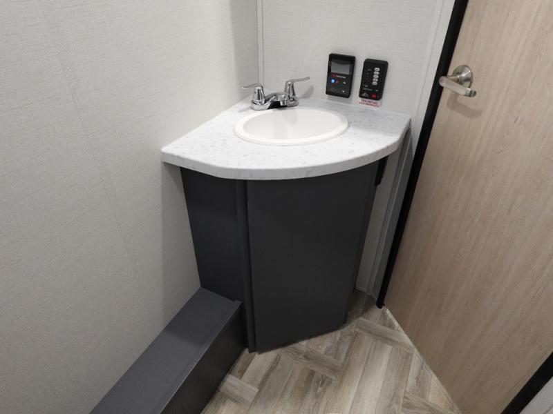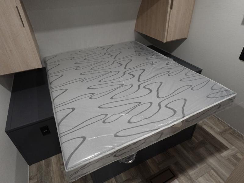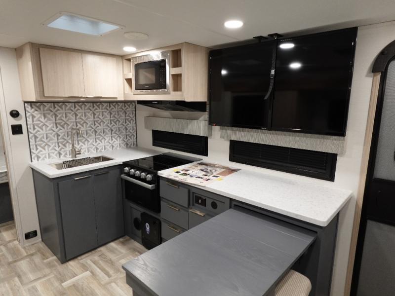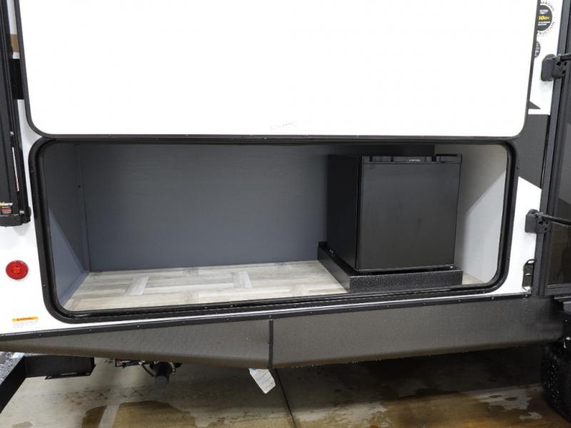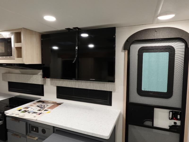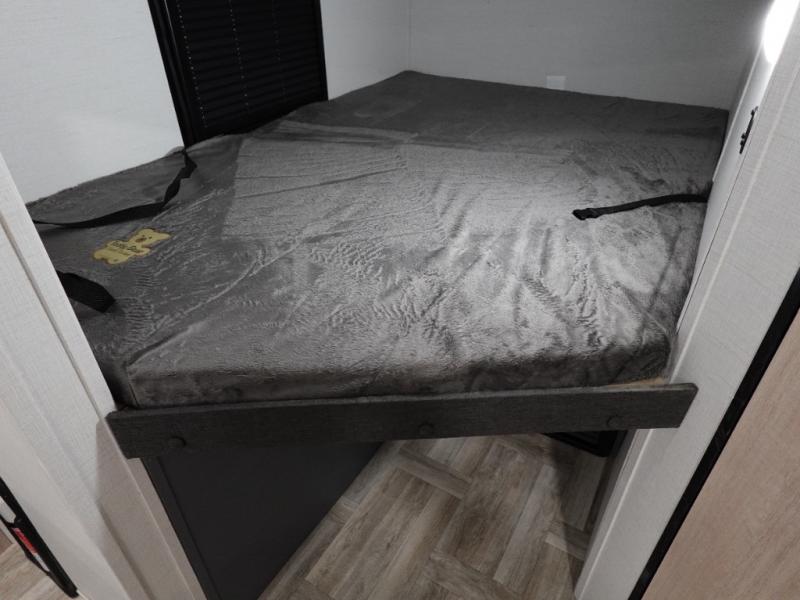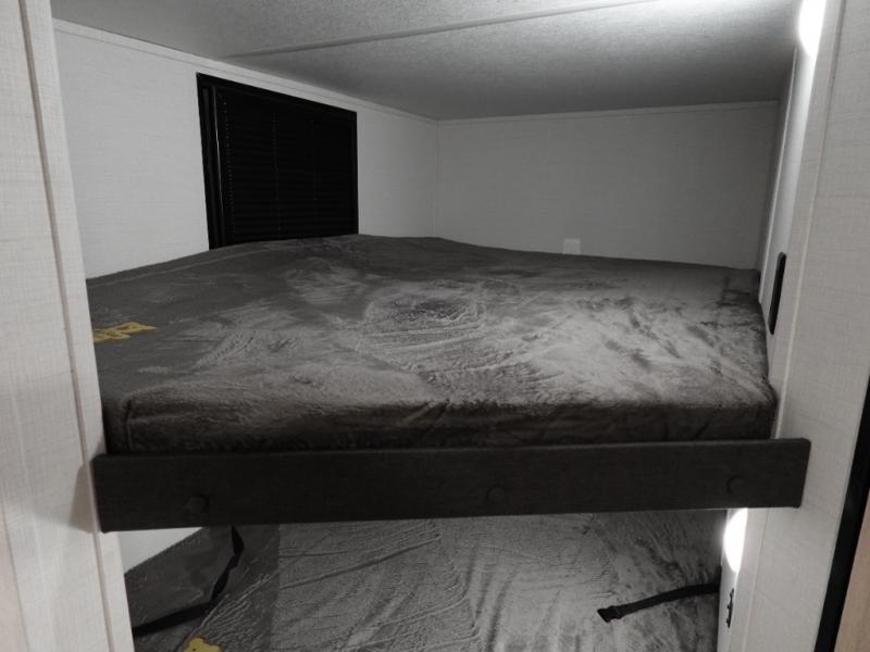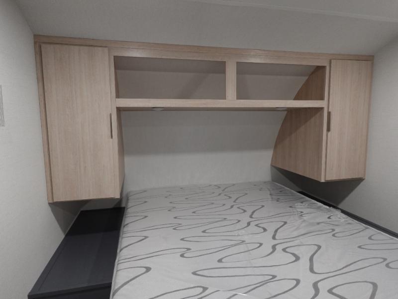 If you're looking for more comfort and a larger sleeping capacity in your next RV, this travel trailer is the one! There are double-size bunks in the rear corner, along with a ladder to easily hop into bed, and the full bath is in the other rear corner for easy nighttime use. You'll enjoy the front private bedroom with its queen bed and dual wardrobes for your things. In the morning, you can make breakfast in the full kitchen, then dine at the bartop with three stools. Or head outdoors to cook on the camp kitchen and eat under the awning! There is also a theater seat within the slide out for more comfort and space, plus the pantry and refrigerator are here so you can easily grab a snack!