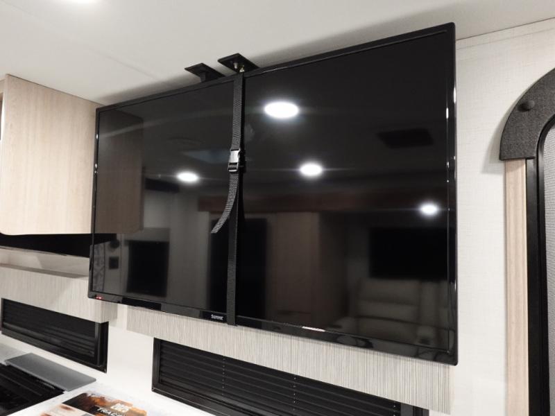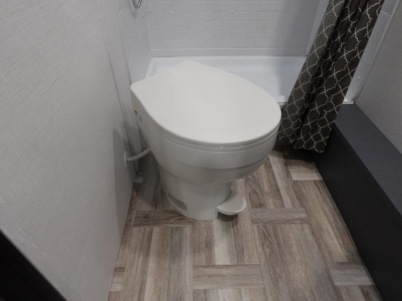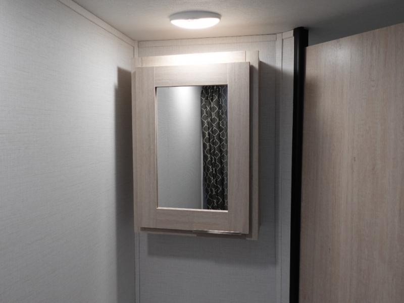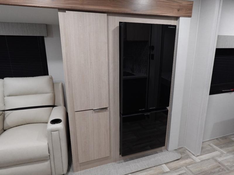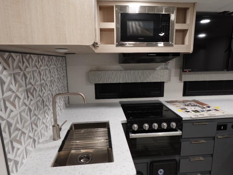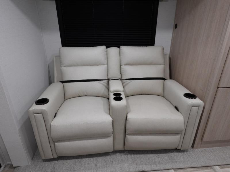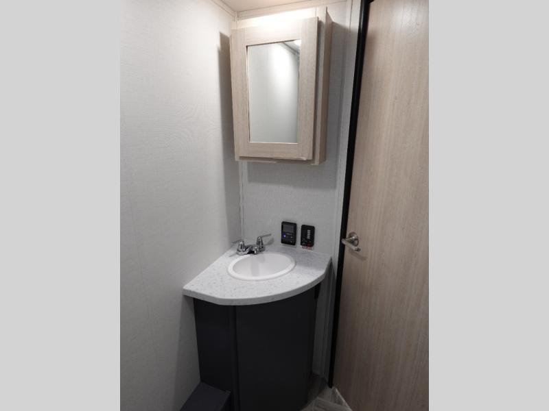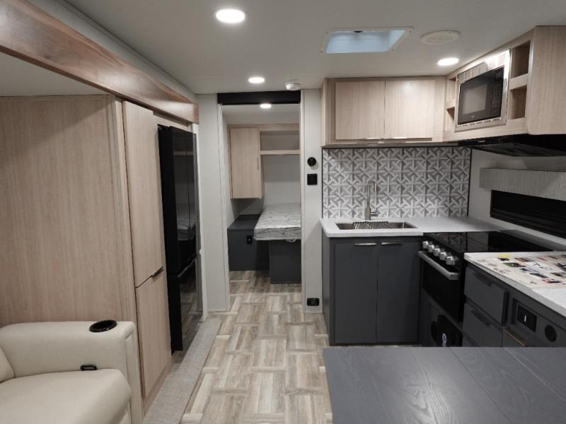 If you're looking for more comfort and a larger sleeping capacity in your next RV, this travel trailer is the one! There are double-size bunks in the rear corner, along with a ladder to easily hop into bed, and the full bath is in the other rear corner for easy nighttime use. You'll enjoy the front private bedroom with its queen bed and dual wardrobes for your things. In the morning, you can make breakfast in the full kitchen, then dine at the bartop with three stools. Or head outdoors to cook on the camp kitchen and eat under the awning! There is also a theater seat within the slide out for more comfort and space, plus the pantry and refrigerator are here so you can easily grab a snack!