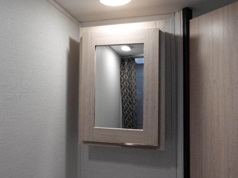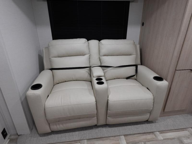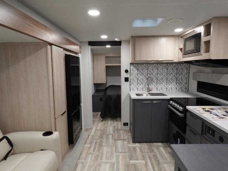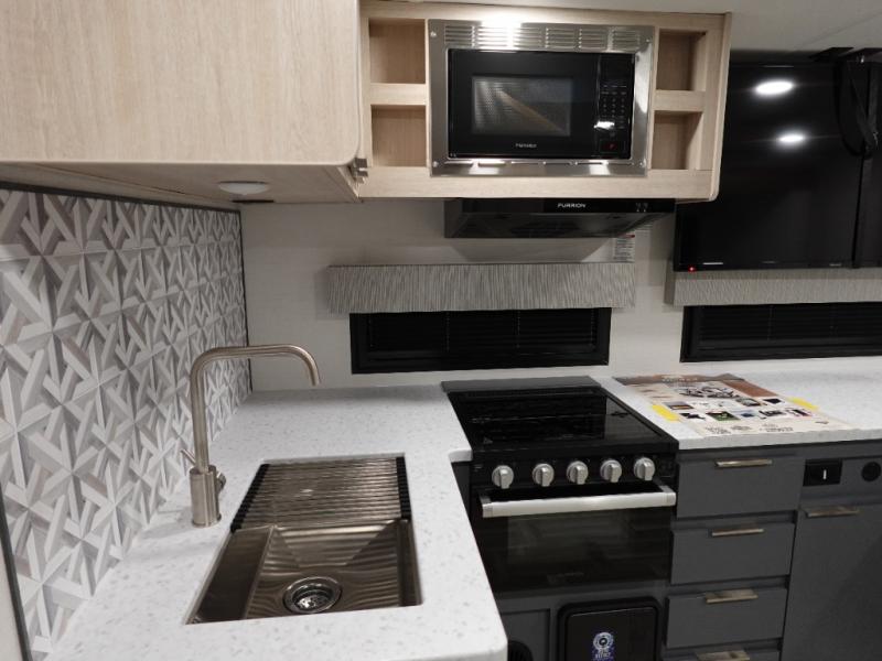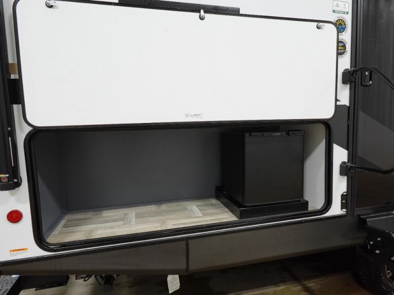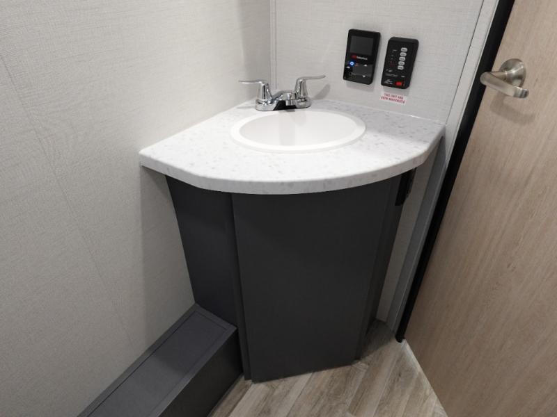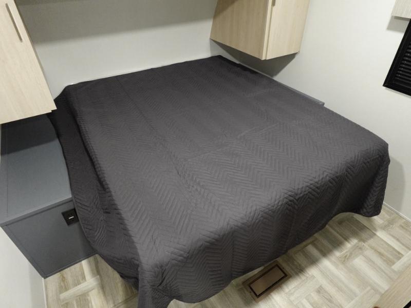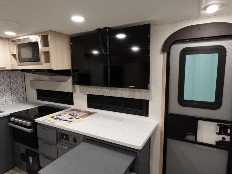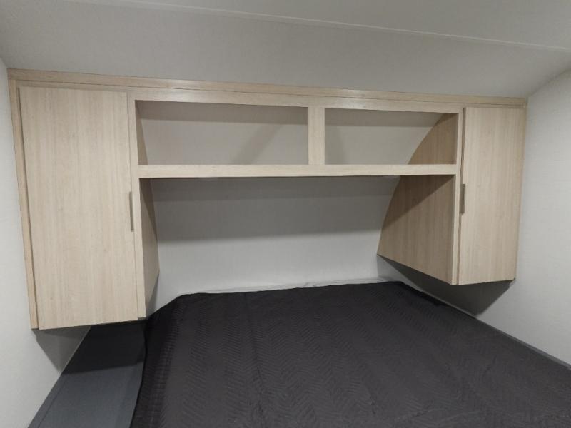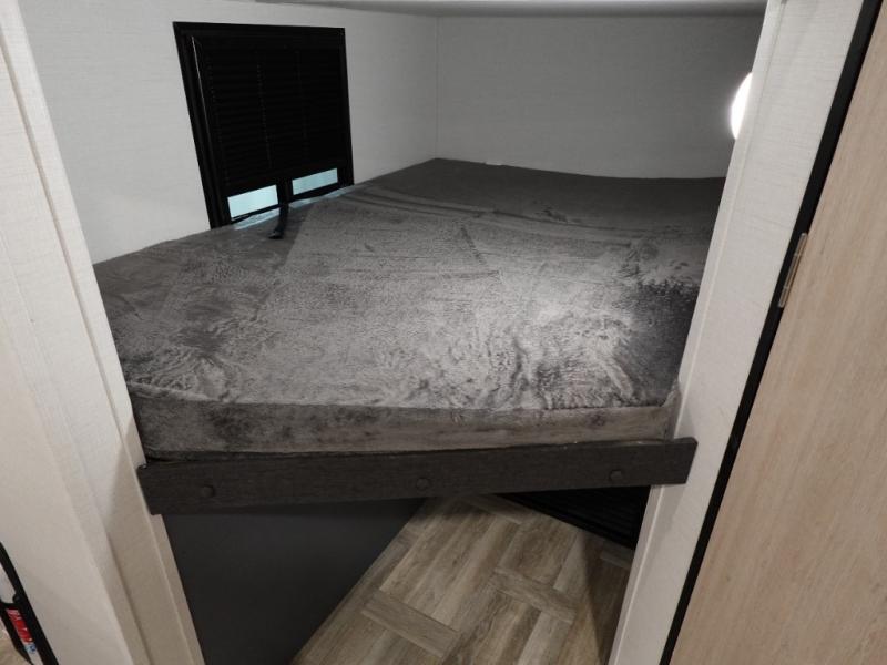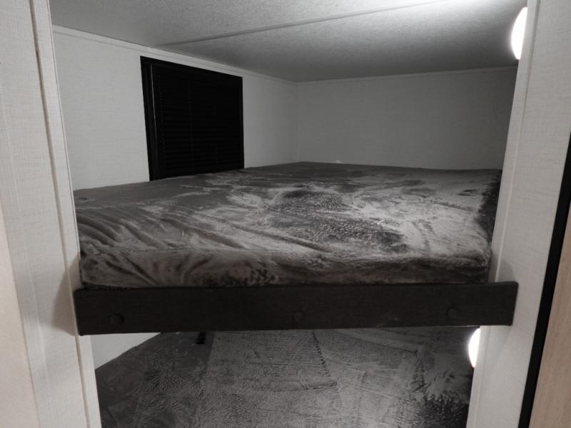 If you're looking for more comfort and a larger sleeping capacity in your next RV, this travel trailer is the one! There are double-size bunks in the rear corner, along with a ladder to easily hop into bed, and the full bath is in the other rear corner for easy nighttime use. You'll enjoy the front private bedroom with its queen bed and dual wardrobes for your things. In the morning, you can make breakfast in the full kitchen, then dine at the bartop with three stools. Or head outdoors to cook on the camp kitchen and eat under the awning! There is also a theater seat within the slide out for more comfort and space, plus the pantry and refrigerator are here so you can easily grab a snack!