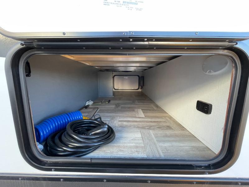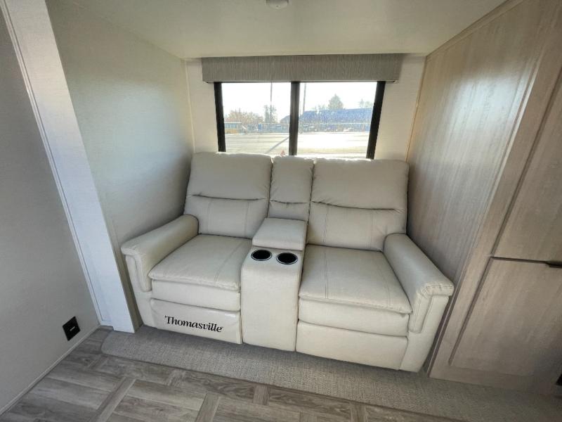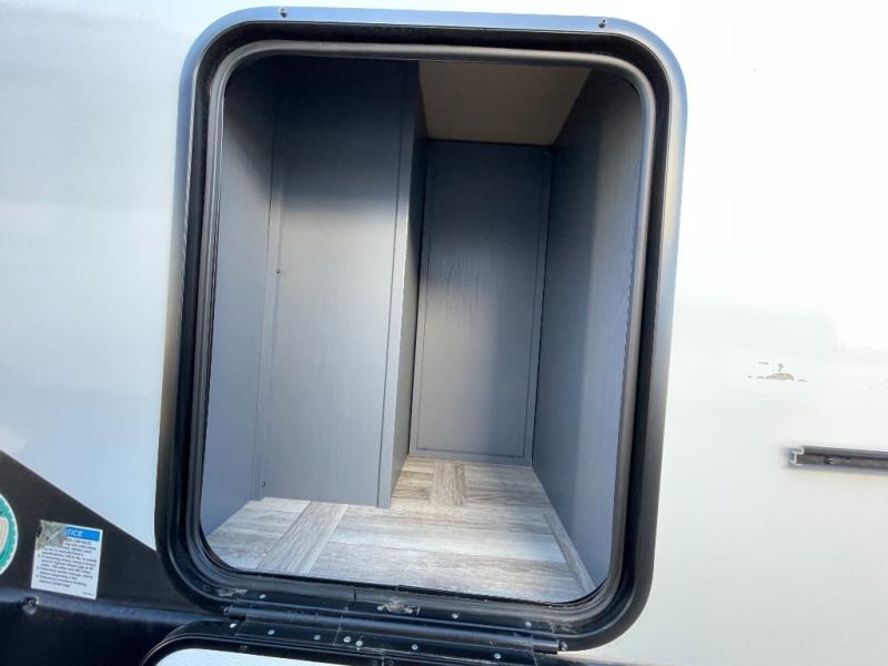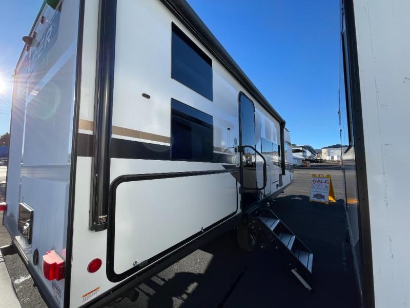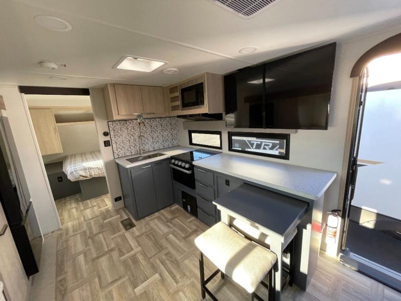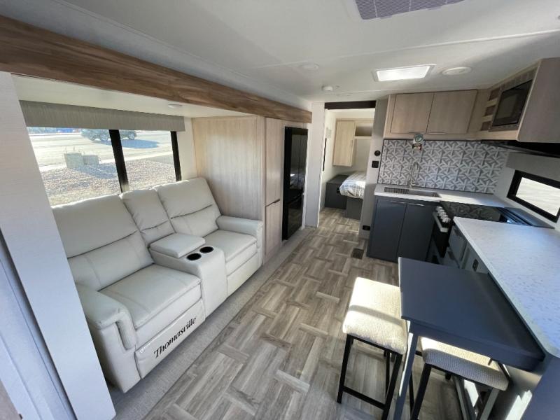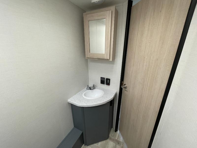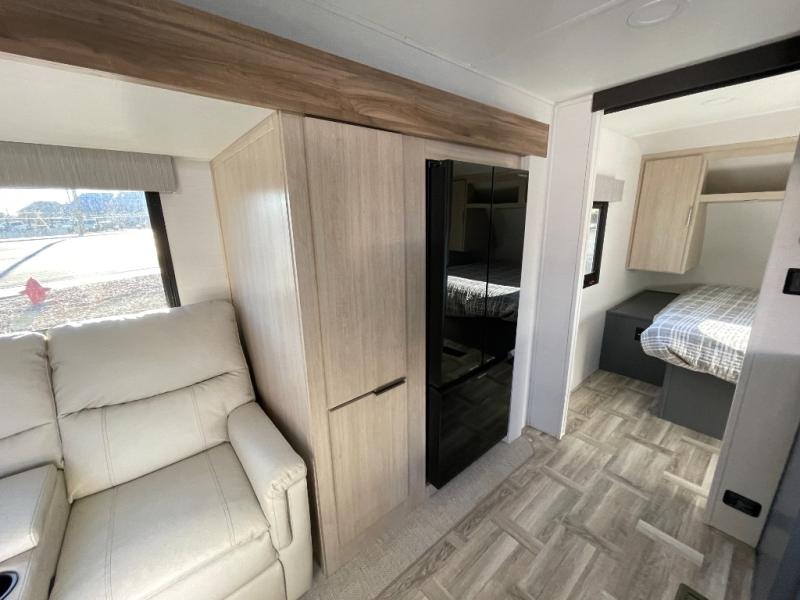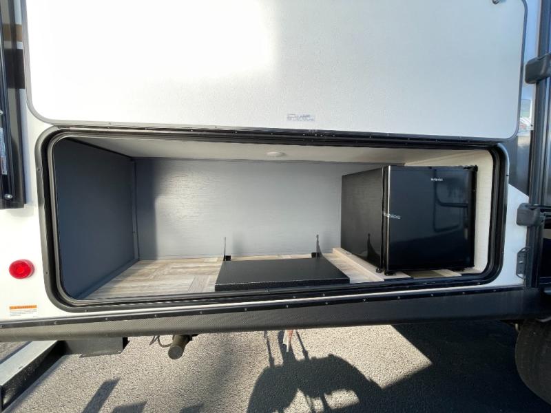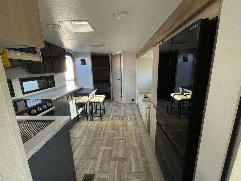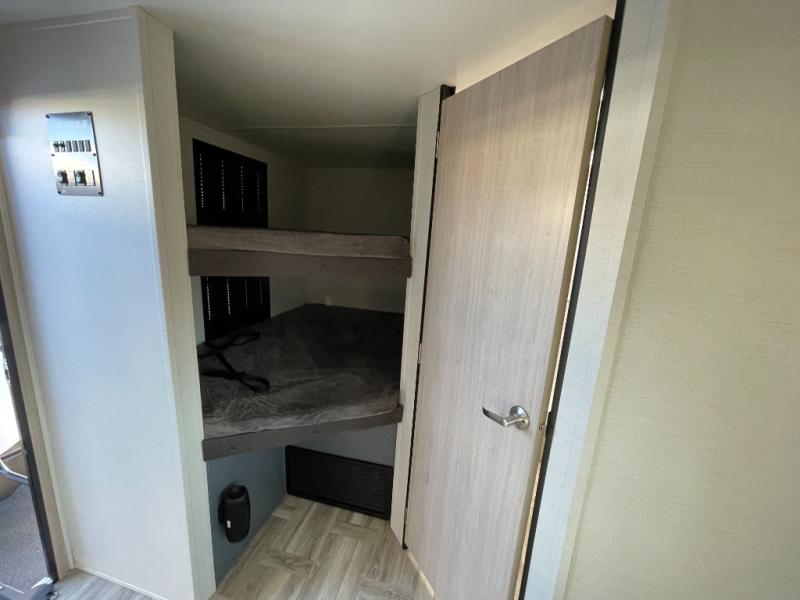 If you're looking for more comfort and a larger sleeping capacity in your next RV, this travel trailer is the one! There are double-size bunks in the rear corner, along with a ladder to easily hop into bed, and the full bath is in the other rear corner for easy nighttime use. You'll enjoy the front private bedroom with its queen bed and dual wardrobes for your things. In the morning, you can make breakfast in the full kitchen, then dine at the bartop with three stools. Or head outdoors to cook on the camp kitchen and eat under the awning! There is also a theater seat within the slide out for more comfort and space, plus the pantry and refrigerator are here so you can easily grab a snack!