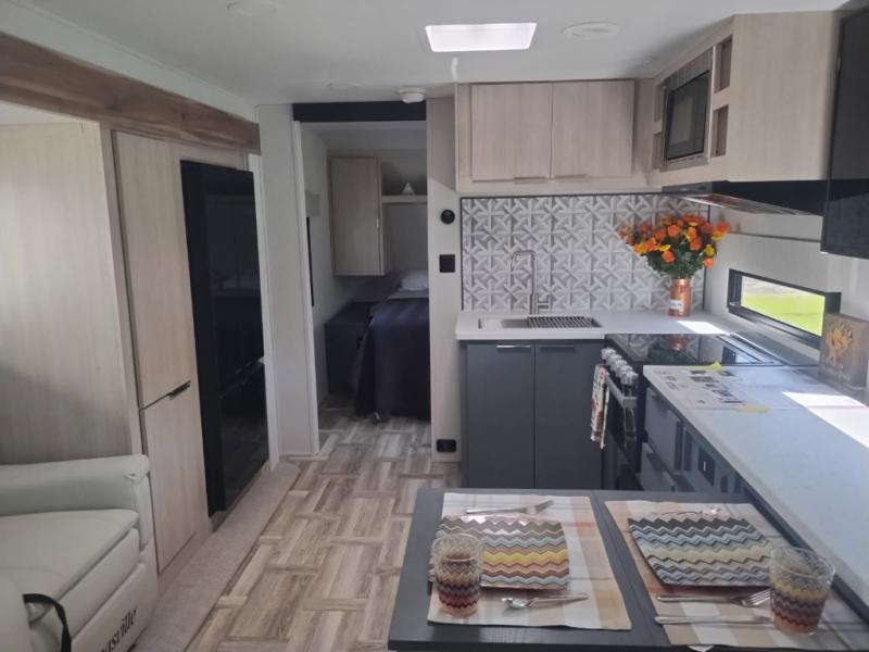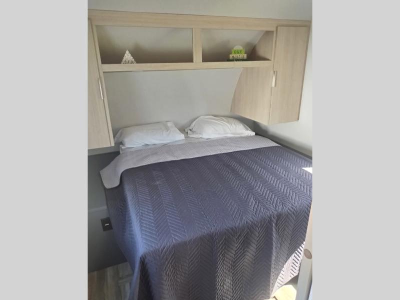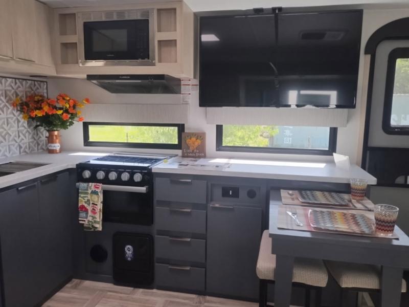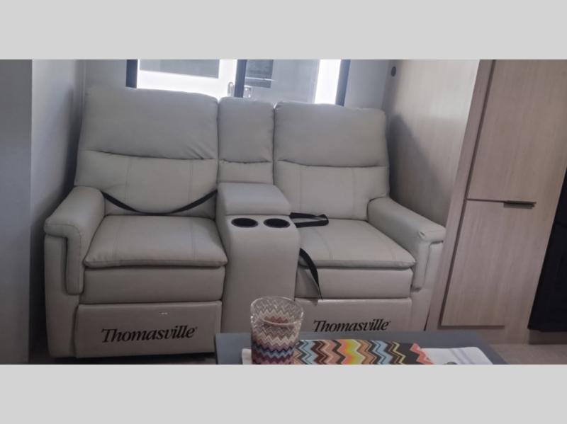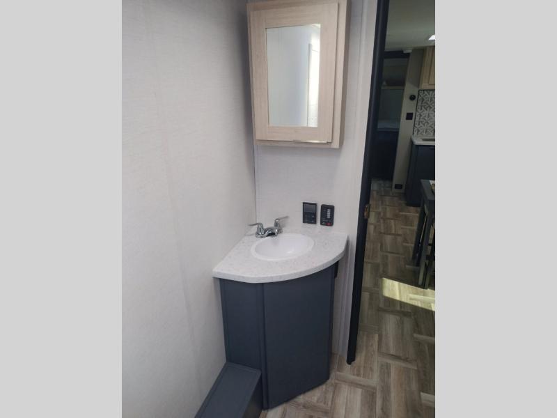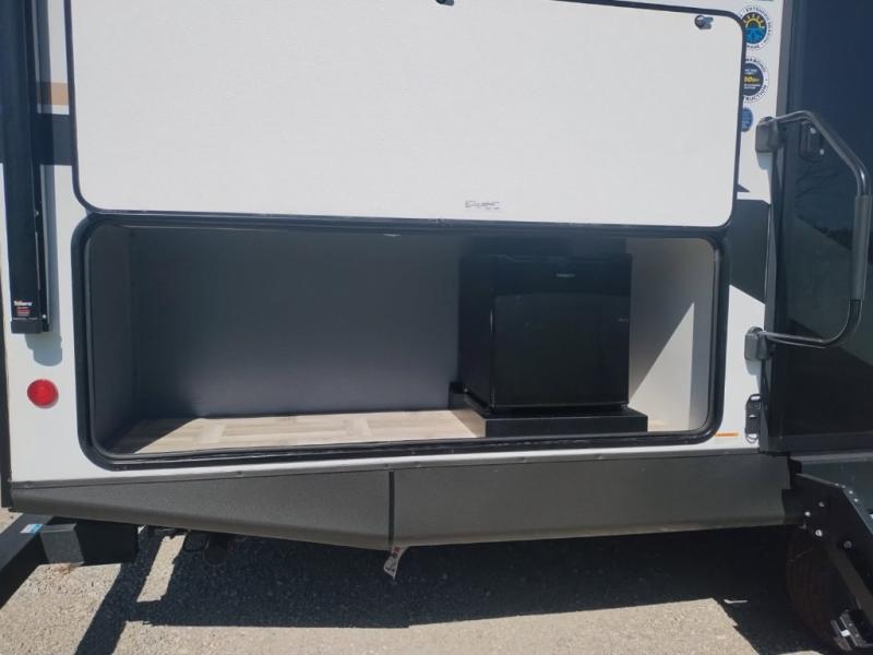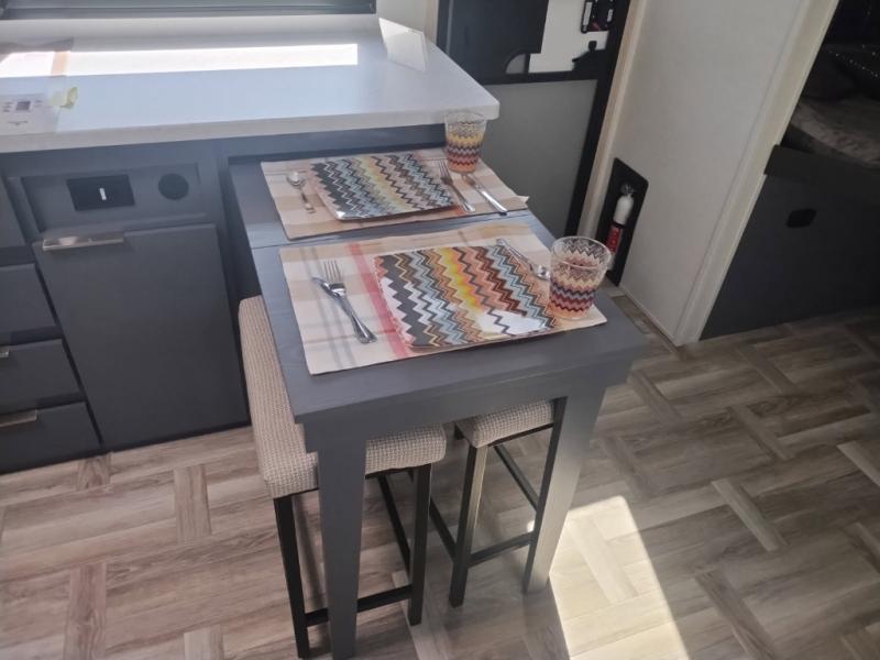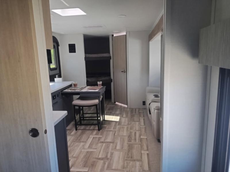 If you're looking for more comfort and a larger sleeping capacity in your next RV, this travel trailer is the one! There are double-size bunks in the rear corner, along with a ladder to easily hop into bed, and the full bath is in the other rear corner for easy nighttime use. You'll enjoy the front private bedroom with its queen bed and dual wardrobes for your things. In the morning, you can make breakfast in the full kitchen, then dine at the bartop with three stools. Or head outdoors to cook on the camp kitchen and eat under the awning! There is also a theater seat within the slide out for more comfort and space, plus the pantry and refrigerator are here so you can easily grab a snack!