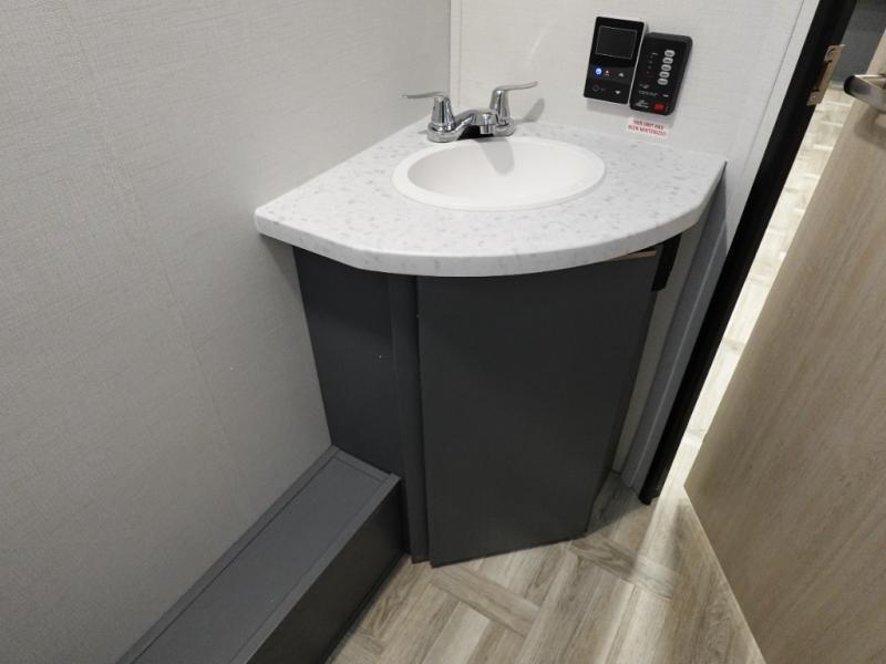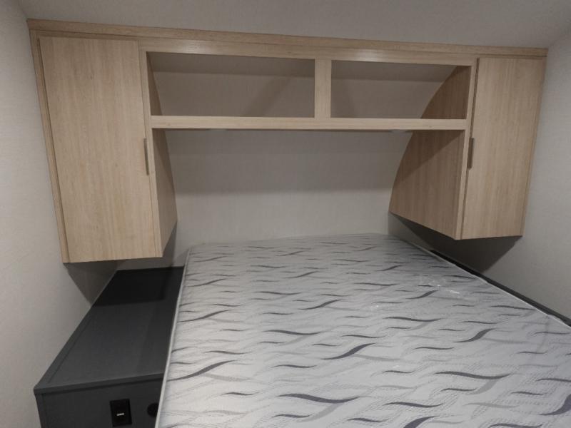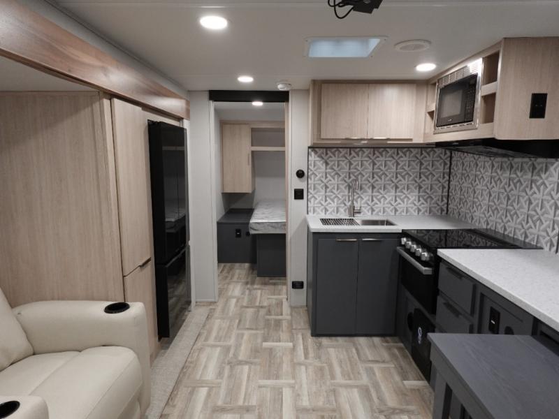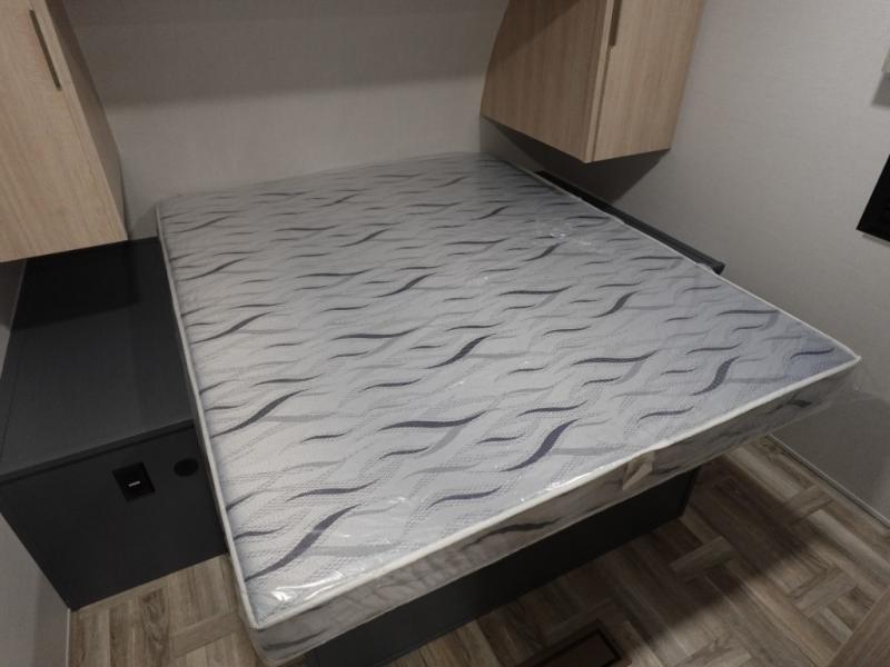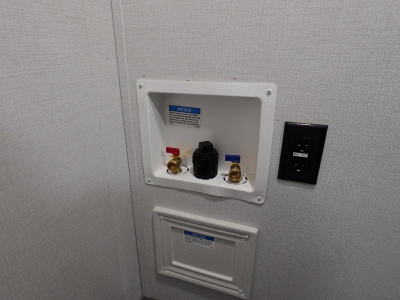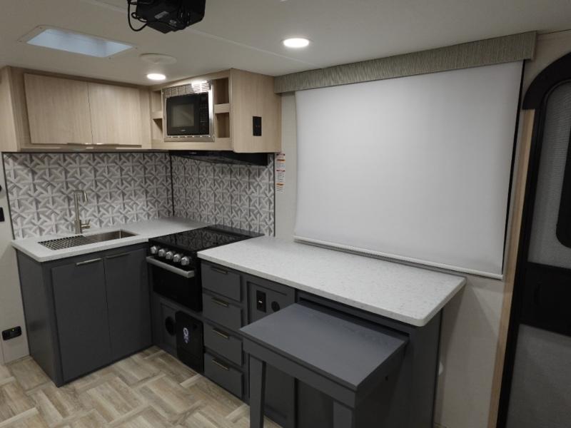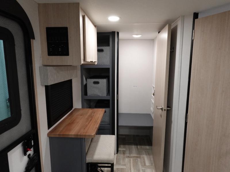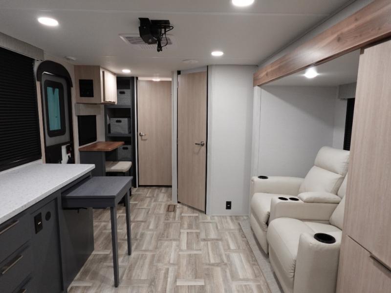 The perfect couple's trailer is found with this RV! You'll enjoy the front private bedroom with its queen bed and dual wardrobes for your things, and the rear corner full bath on board will let you stay clean throughout your trip. In the morning, you can make breakfast in the full kitchen, then dine at the bartop with three stools. There is also a theater seat within the slide out for more comfort and space, plus the pantry and refrigerator are here so you can easily grab a snack. A desk with a chair lets you work while you're away from home if you need to, and there is even a closet with washer and dryer prep if you choose to add those appliances!