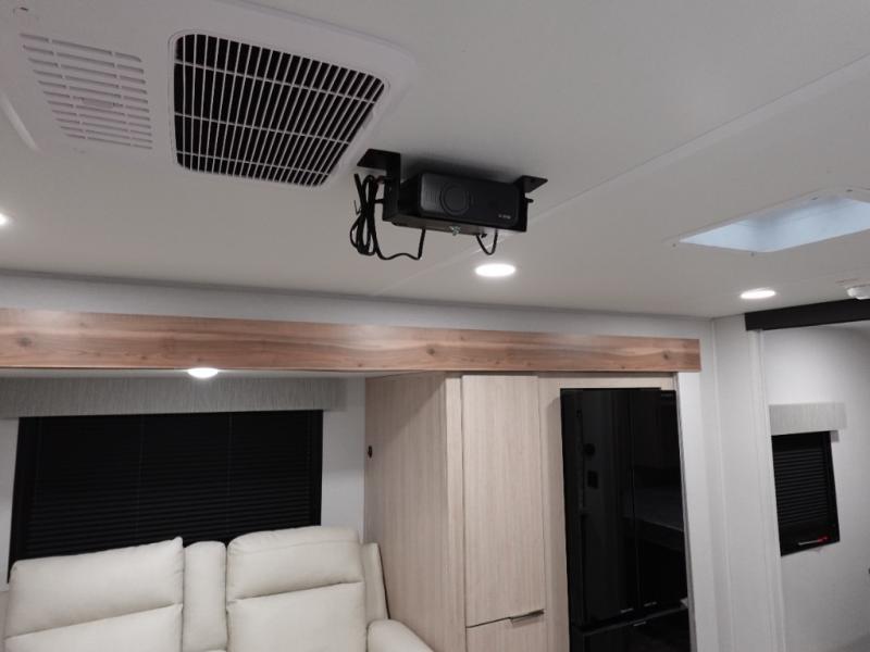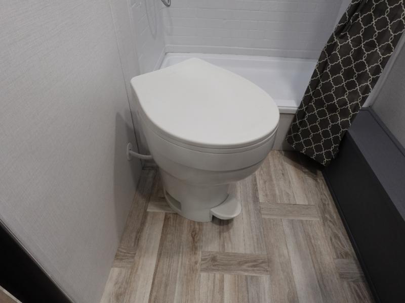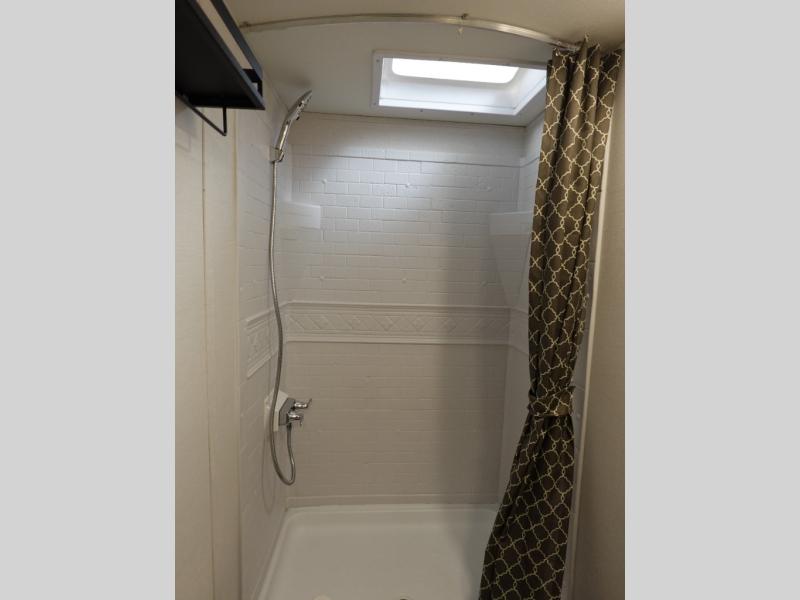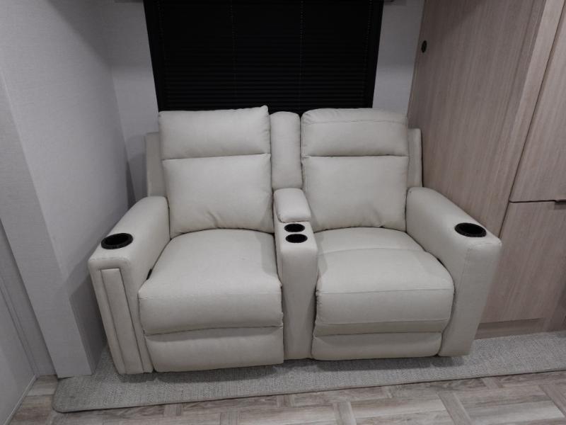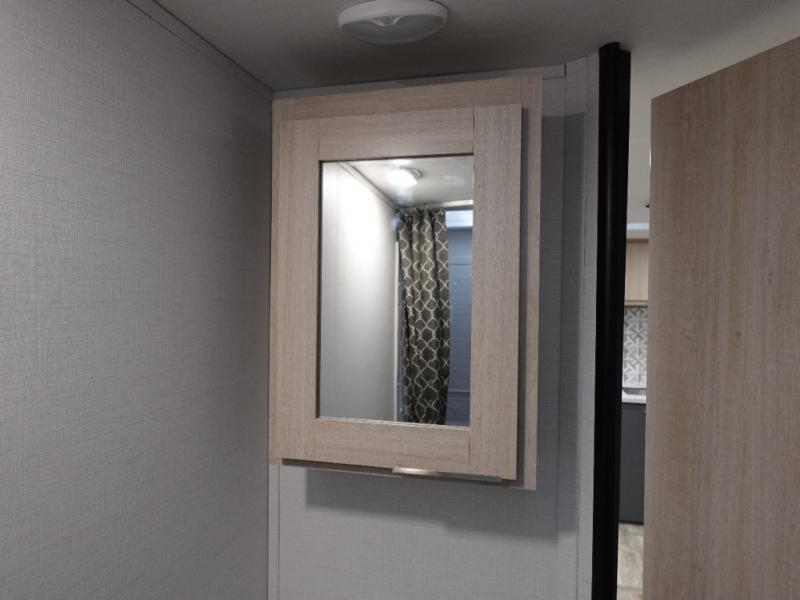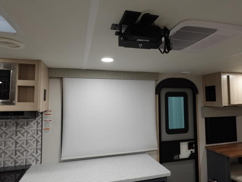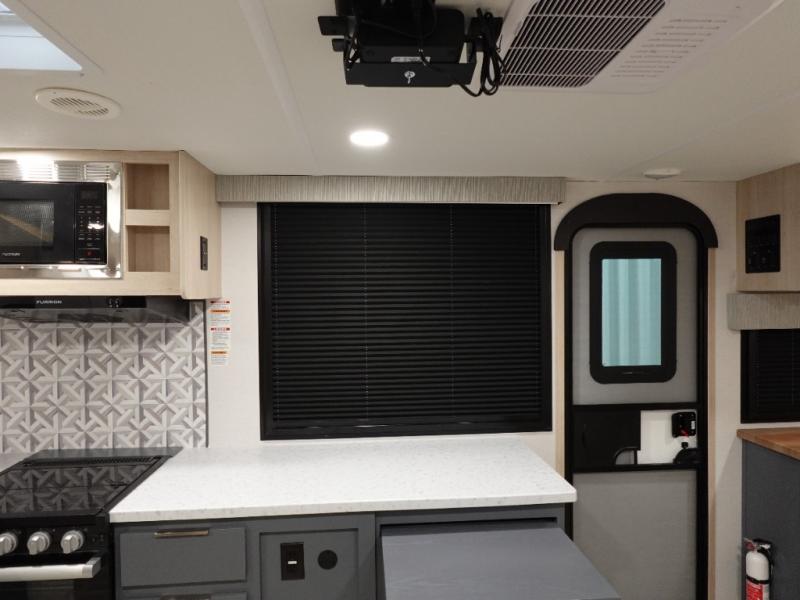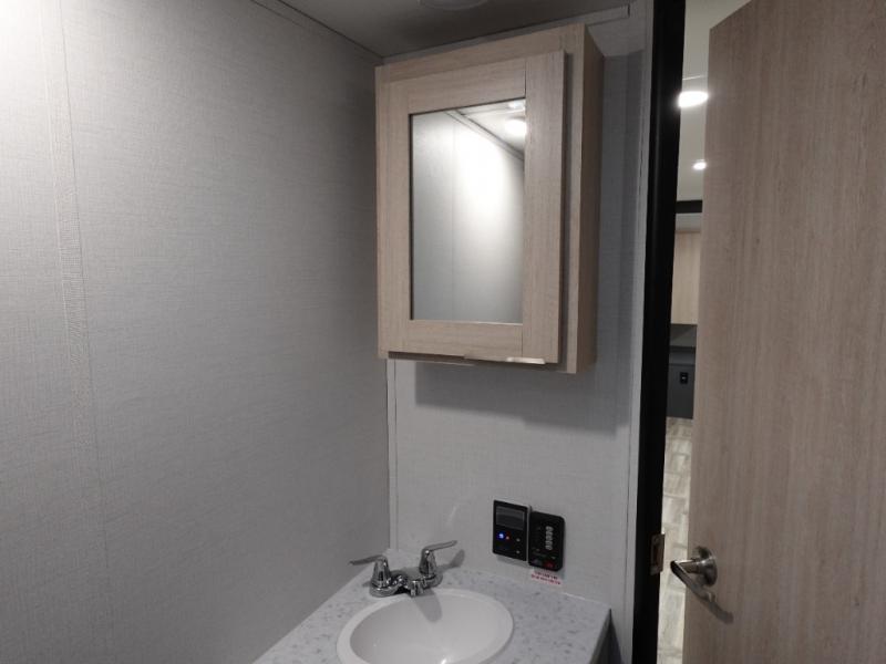 The perfect couple's trailer is found with this RV! You'll enjoy the front private bedroom with its queen bed and dual wardrobes for your things, and the rear corner full bath on board will let you stay clean throughout your trip. In the morning, you can make breakfast in the full kitchen, then dine at the bartop with three stools. There is also a theater seat within the slide out for more comfort and space, plus the pantry and refrigerator are here so you can easily grab a snack. A desk with a chair lets you work while you're away from home if you need to, and there is even a closet with washer and dryer prep if you choose to add those appliances!