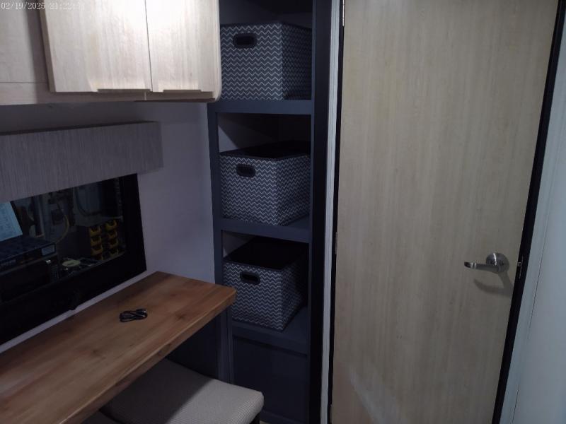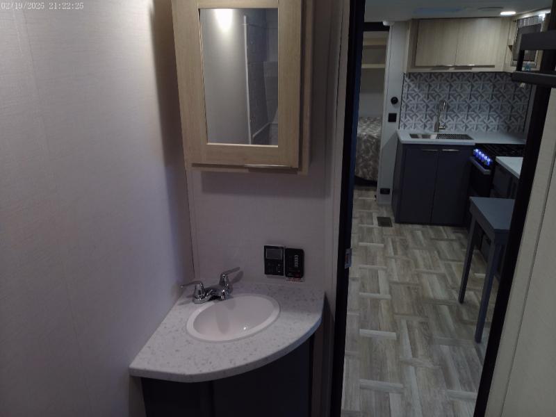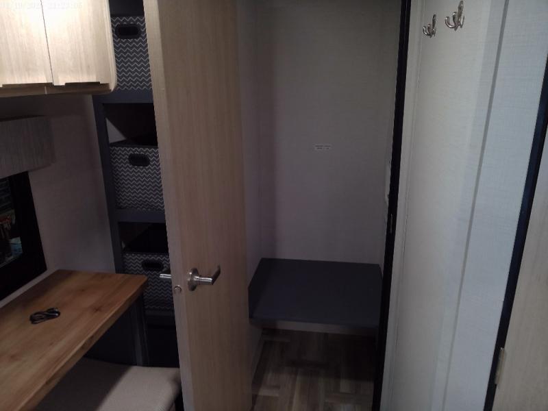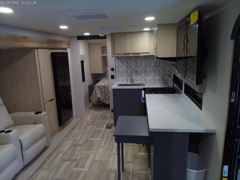 The perfect couple's trailer is found with this RV! You'll enjoy the front private bedroom with its queen bed and dual wardrobes for your things, and the rear corner full bath on board will let you stay clean throughout your trip. In the morning, you can make breakfast in the full kitchen, then dine at the bartop with three stools. There is also a theater seat within the slide out for more comfort and space, plus the pantry and refrigerator are here so you can easily grab a snack. A desk with a chair lets you work while you're away from home if you need to, and there is even a closet with washer and dryer prep if you choose to add those appliances!