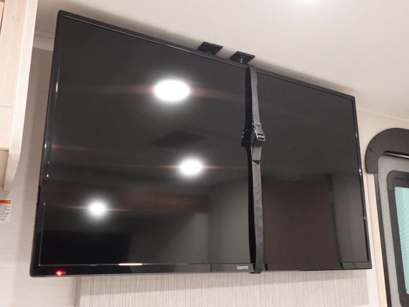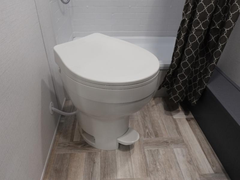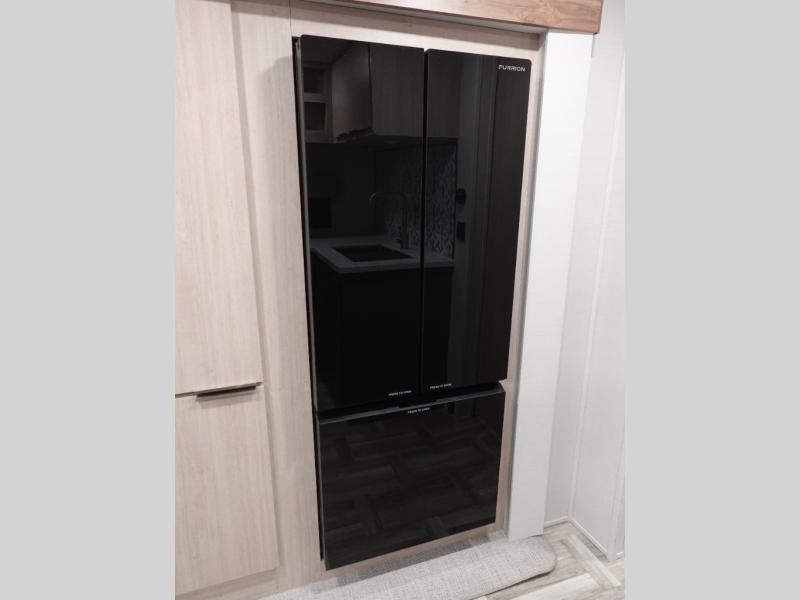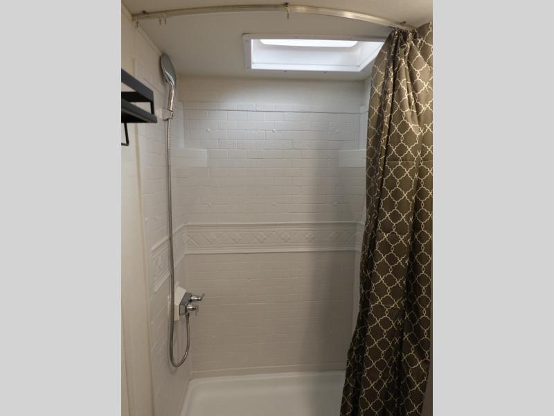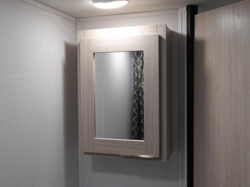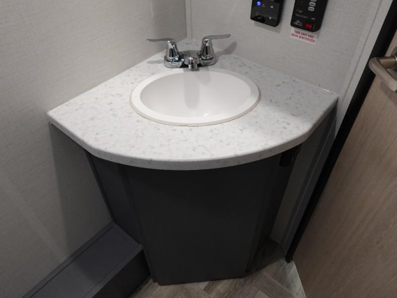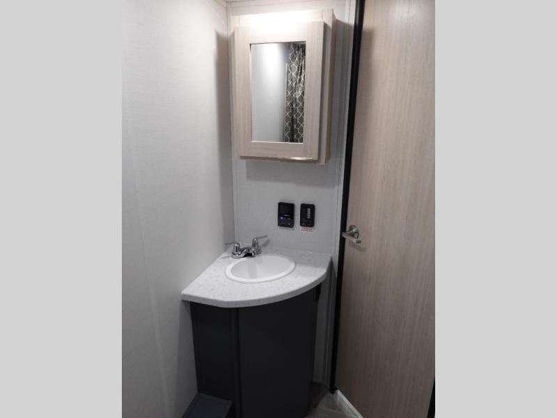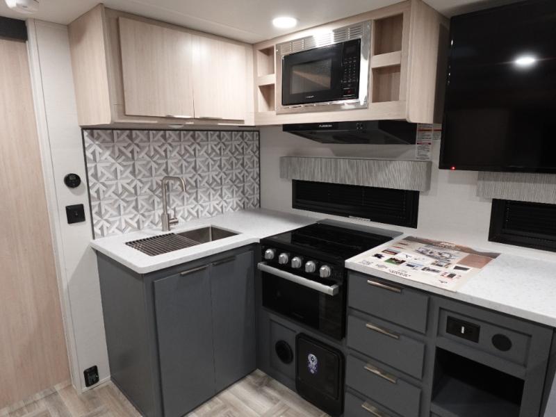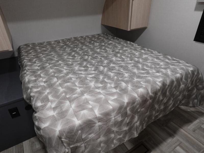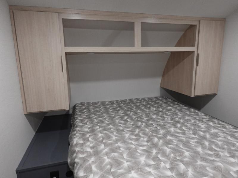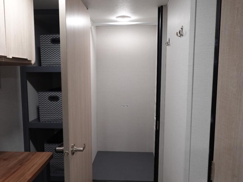 The perfect couple's trailer is found with this RV! You'll enjoy the front private bedroom with its queen bed and dual wardrobes for your things, and the rear corner full bath on board will let you stay clean throughout your trip. In the morning, you can make breakfast in the full kitchen, then dine at the bartop with three stools. There is also a theater seat within the slide out for more comfort and space, plus the pantry and refrigerator are here so you can easily grab a snack. A desk with a chair lets you work while you're away from home if you need to, and there is even a closet with washer and dryer prep if you choose to add those appliances!