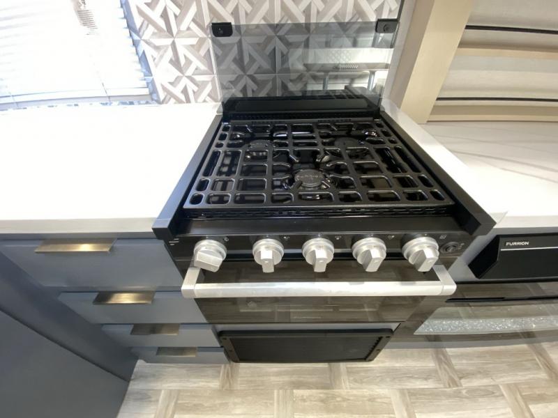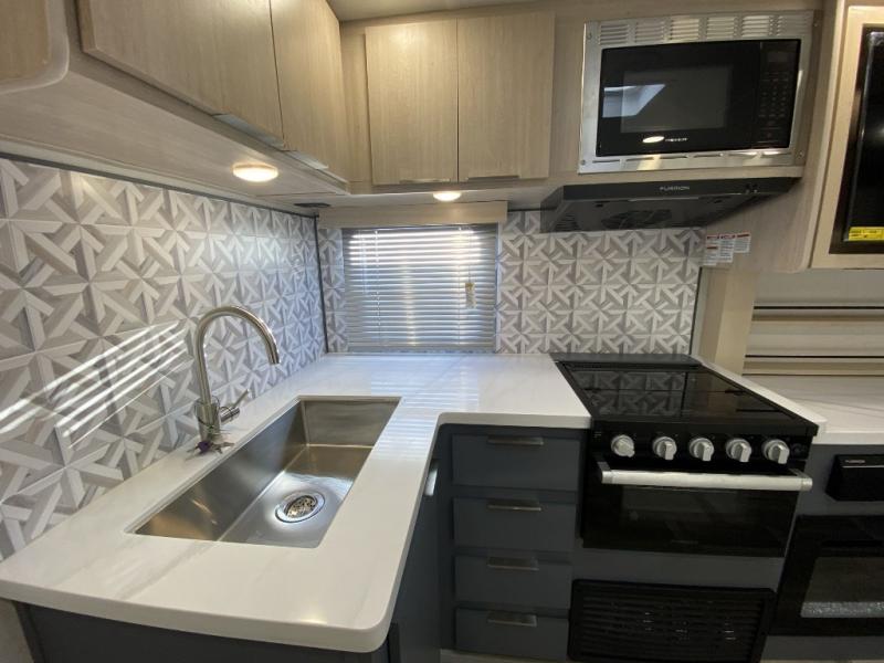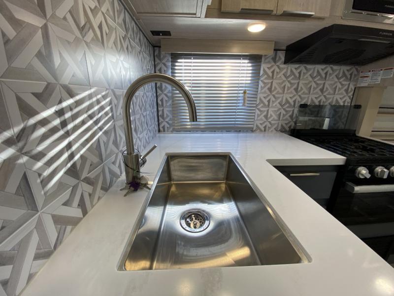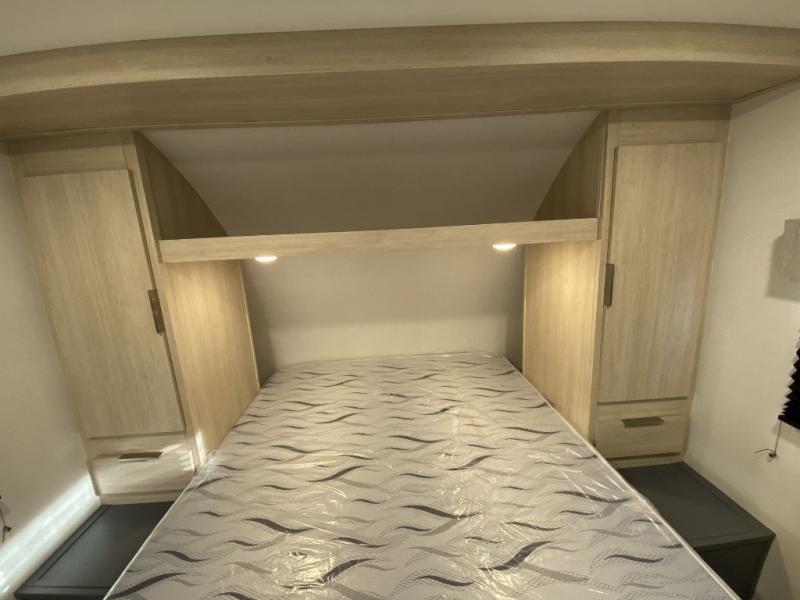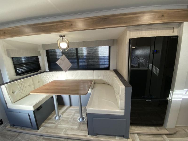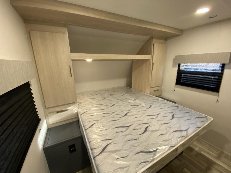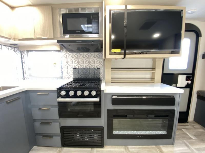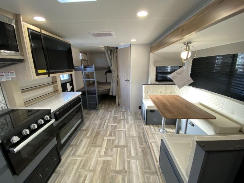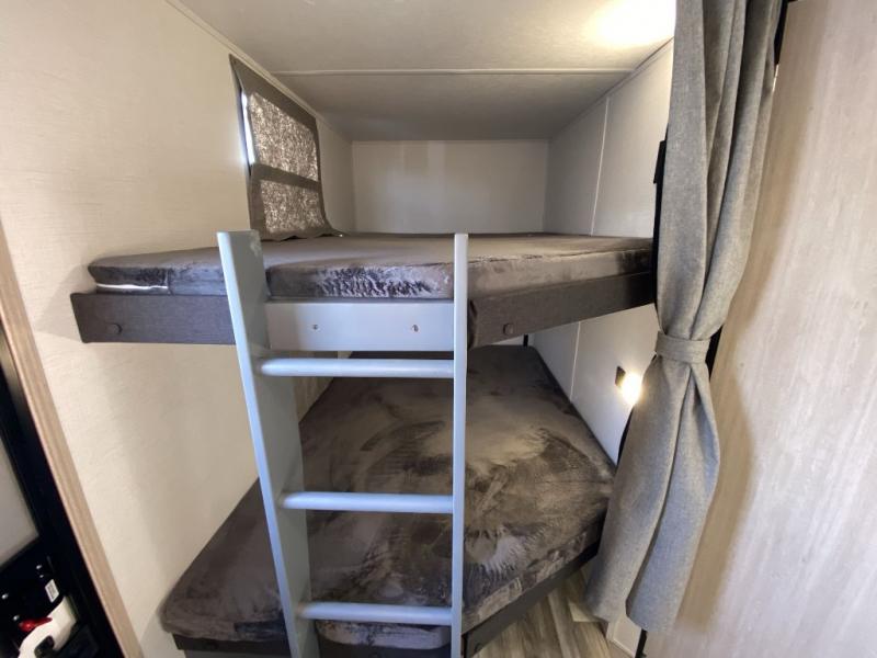 The perfect family travel trailer with sleeping for six or more with double bed bunks just inside the entry door on your left, a queen bed up front, and the U-shaped dinette can be folded down to accommodate another tired camper if needed as well as being the perfect spot for meals and game playing at night. You will love being able to cook inside or outside with a full kitchen indoors including a large two door refrigerator within the large slide, plus a single sink, a three burner range, and overhead microwave too. Or, use the camp kitchen on the exterior beneath the 19' awning. This is great when you just want to spend as much time outdoors as possible. And, don't worry about bringing along bikes and outdoor games like corn hole toss and more because this unit has a rear bike door beneath the bunks in back making it easy to load and unload, plus a nice pass-through compartment where you can easily access your other camping gear from either side of the trailer in front.