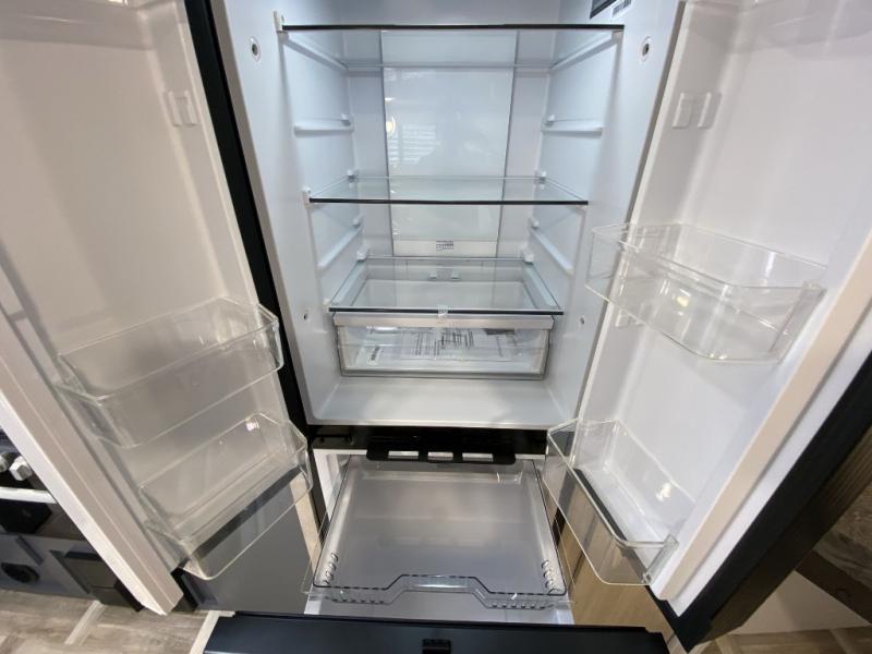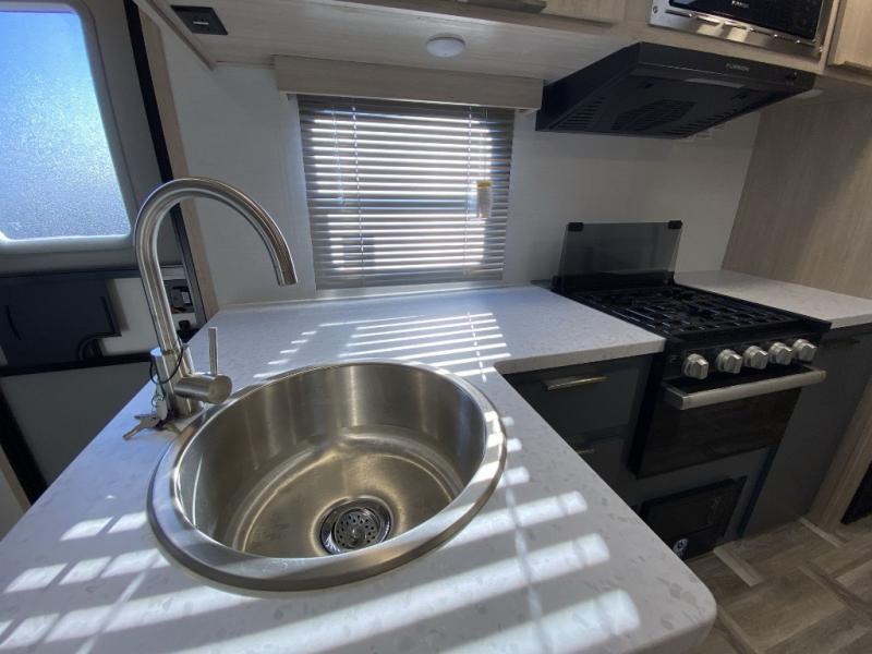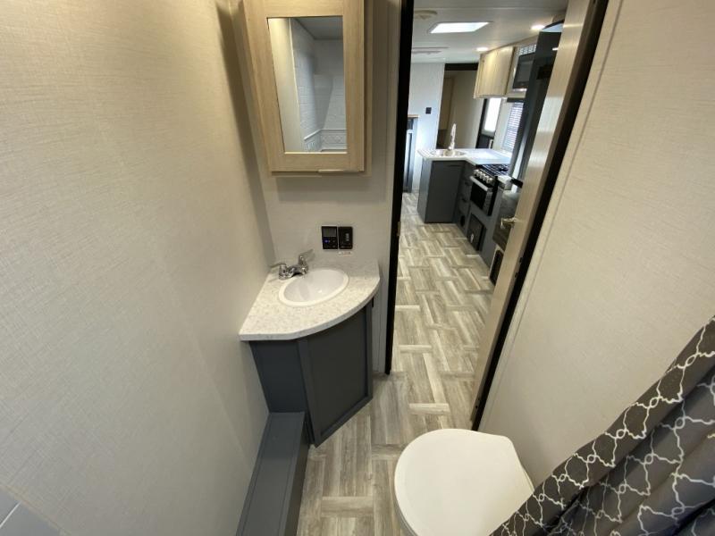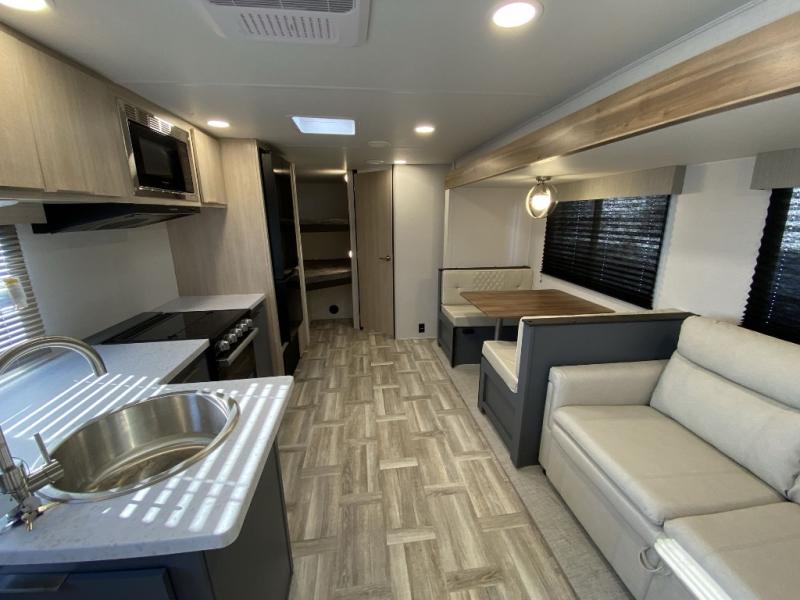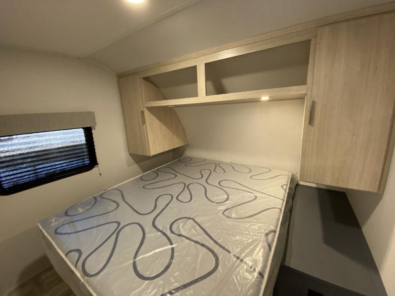If you are looking for a trailer with double-size bunks and a private bedroom, you have found it! The queen bed and two wardrobes are behind a partial wall for added privacy. The double-size bunks are in the rear corner next to the full bathroom for convenience for the kids or your guests. And the L-shaped counter with a kitchen sink and full amenities sets up the cook nicely to be able to make meals for everyone. And you will love the extra floor space created by the booth dinette and sofa slide out.
