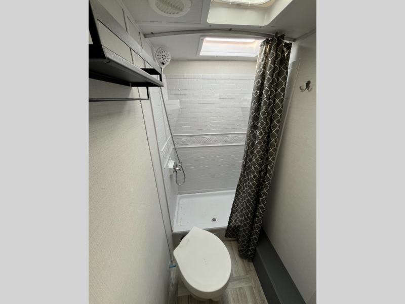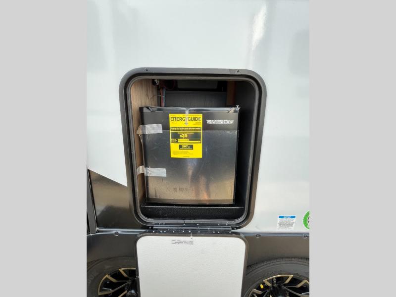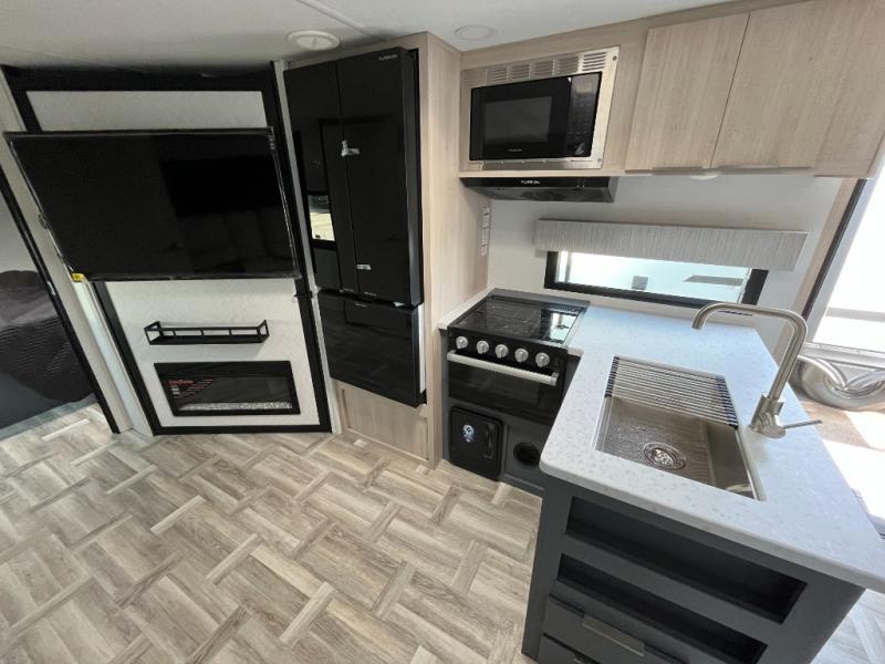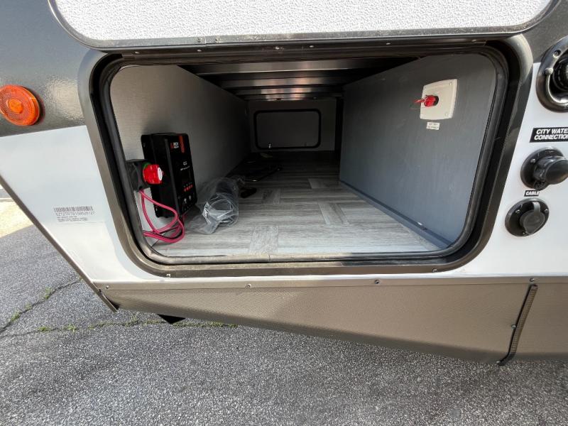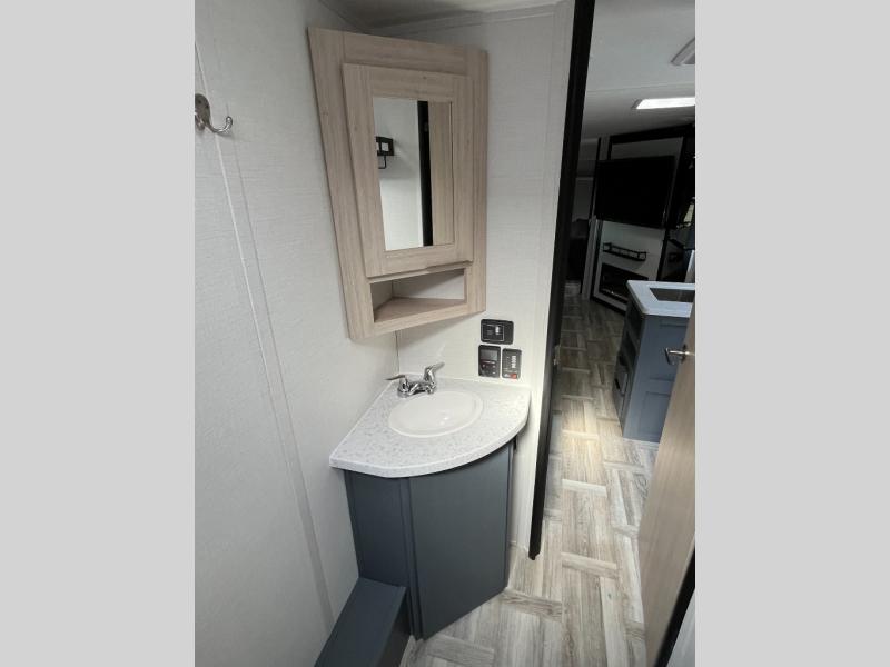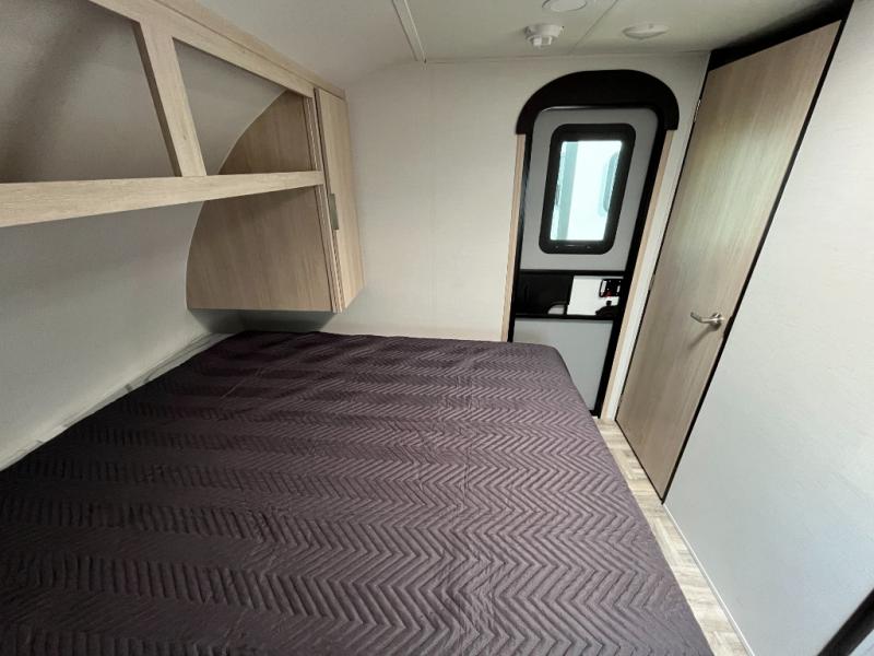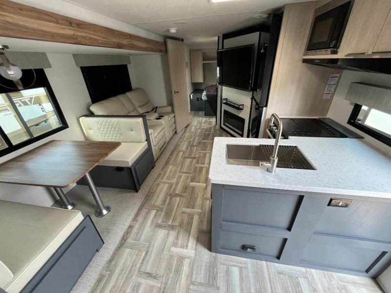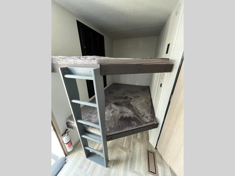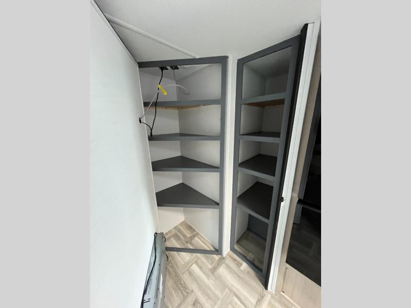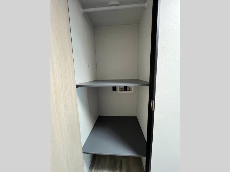 If you're looking for more comfort and a larger sleeping capacity in your next RV, this travel trailer is the one! There are double-size bunks in the rear corner, along with a ladder to easily hop into bed, and the full bath is in the other rear corner for easy nighttime use. You'll enjoy the front private bedroom with its queen bed and dual wardrobes for your things, and a separate closet with washer and dryer prep if you choose to add those appliances. And one of the dual entry doors is located here so you can easily slip out in the morning without waking everyone else up in the trailer! In the morning, you can make breakfast in the full kitchen, then dine at the booth dinette within the large slide out. There is also a theater here for more comfort. This travel trailer also includes plenty of storage space, including a walk-in pantry with shelves, an additional storage closet, and a pass-thru storage outside for fishing poles!