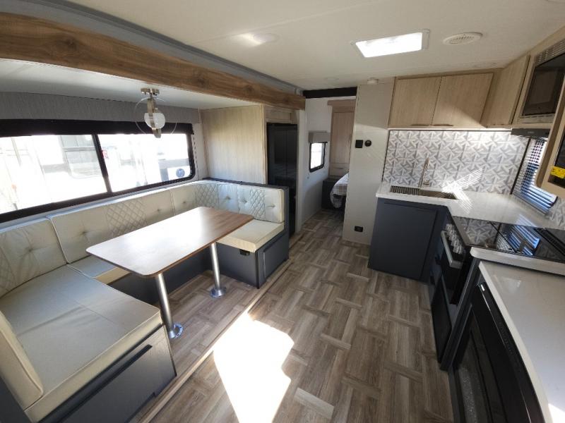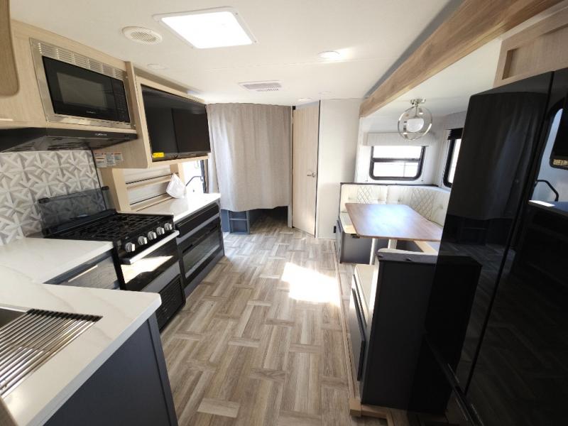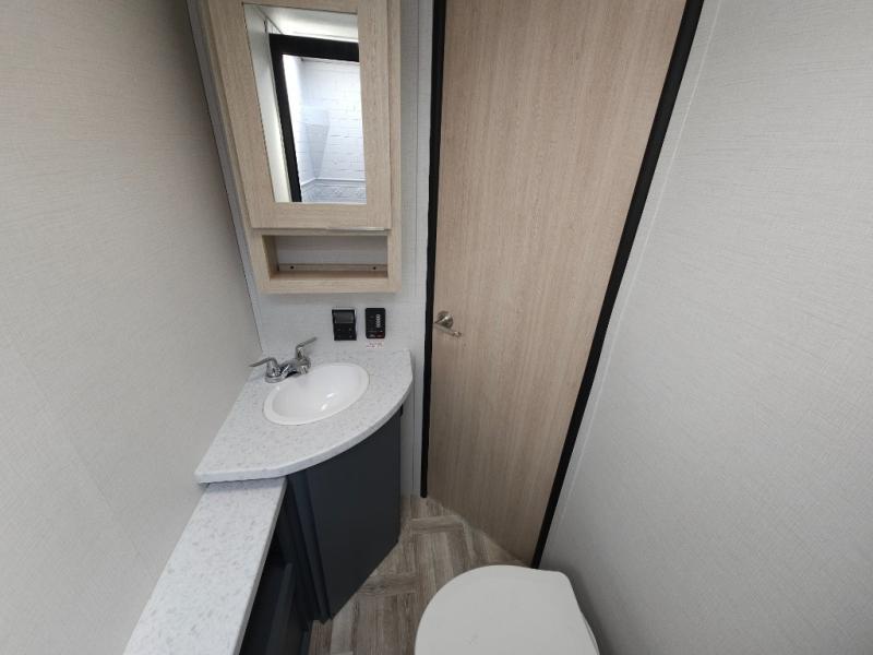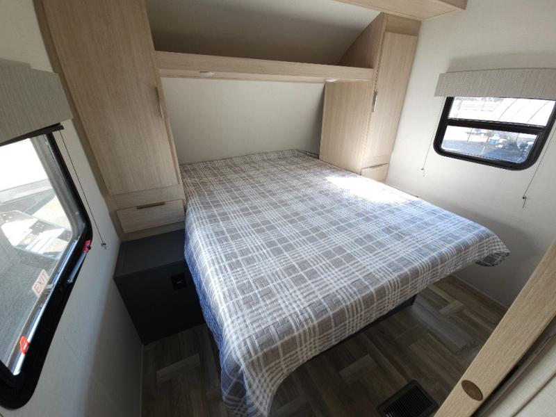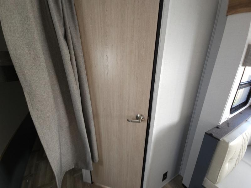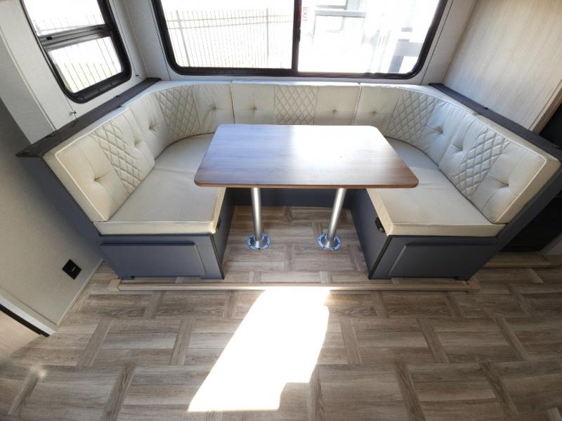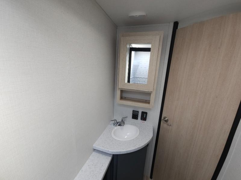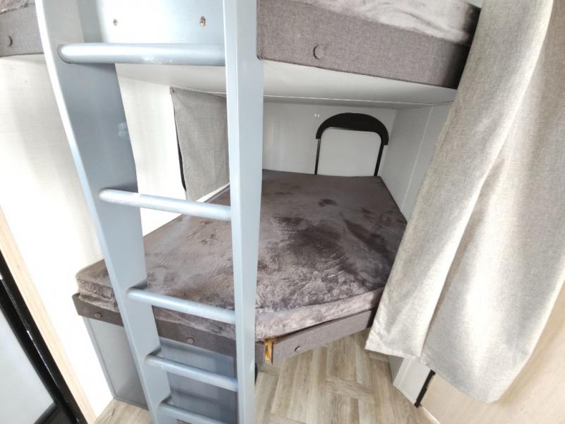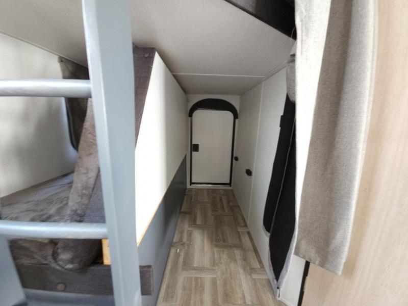 If you're looking for more comfort and a larger sleeping capacity in your next RV, this travel trailer is the one! There are double-size bunks in the rear corner, along with a ladder to easily hop into bed, and the full bath is in the other rear corner for easy nighttime use. You'll enjoy the front private bedroom with its queen bed and dual wardrobes for your things, and a separate closet with washer and dryer prep if you choose to add those appliances. And one of the dual entry doors is located here so you can easily slip out in the morning without waking everyone else up in the trailer! In the morning, you can make breakfast in the full kitchen, then dine at the booth dinette within the large slide out. There is also a theater here for more comfort. This travel trailer also includes plenty of storage space, including a walk-in pantry with shelves, an additional storage closet, and a pass-thru storage outside for fishing poles!