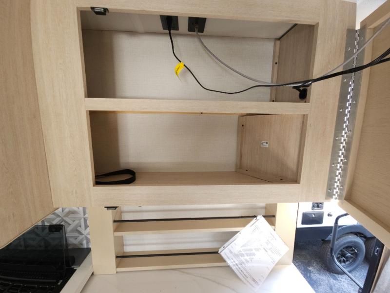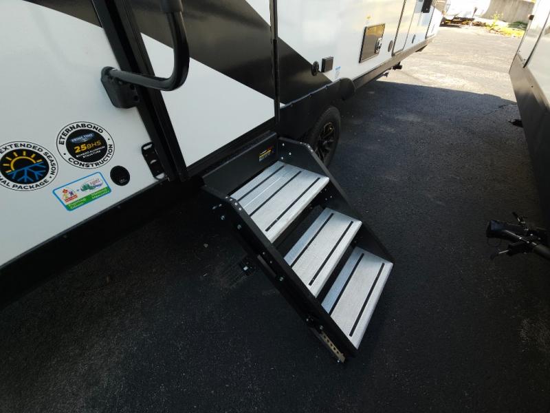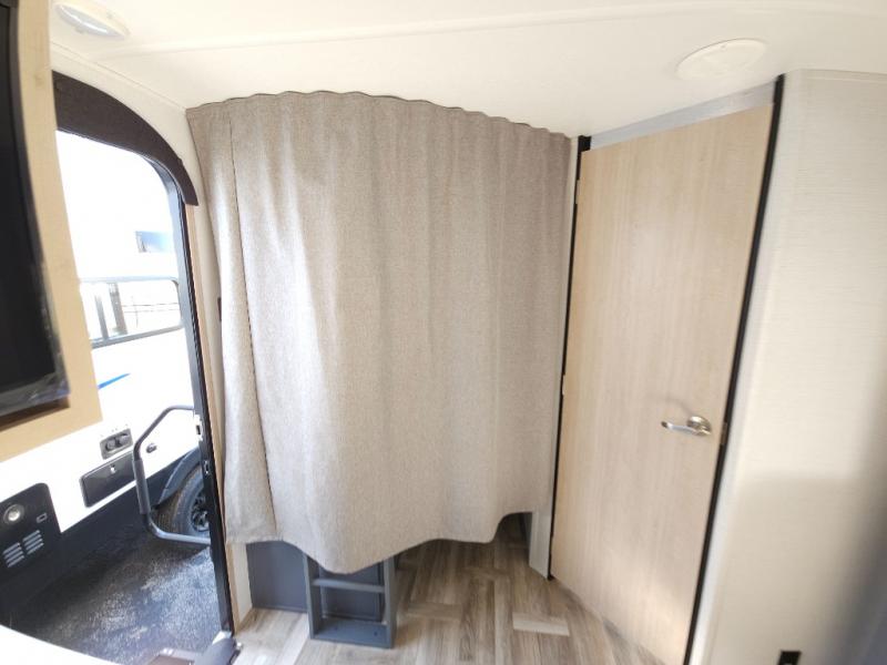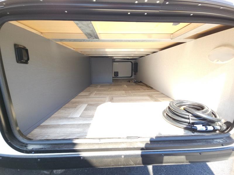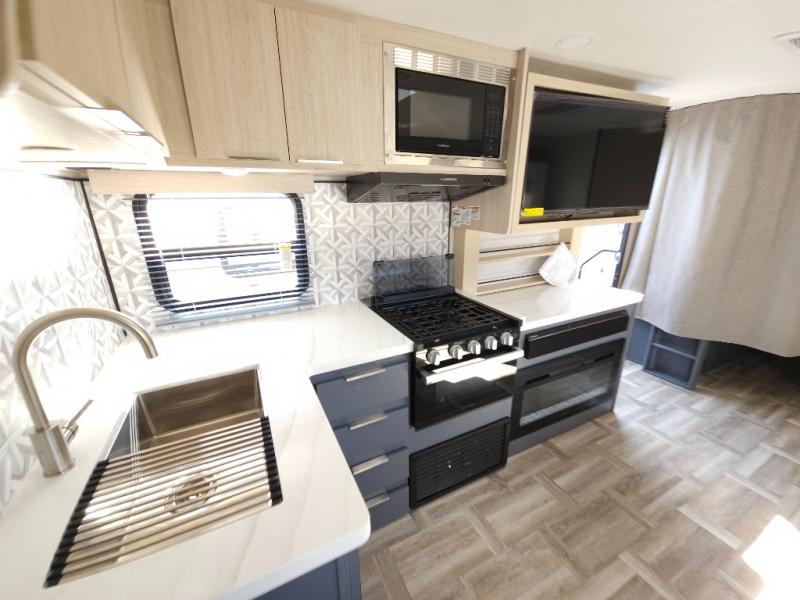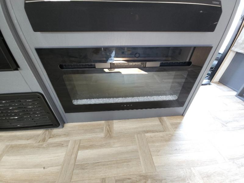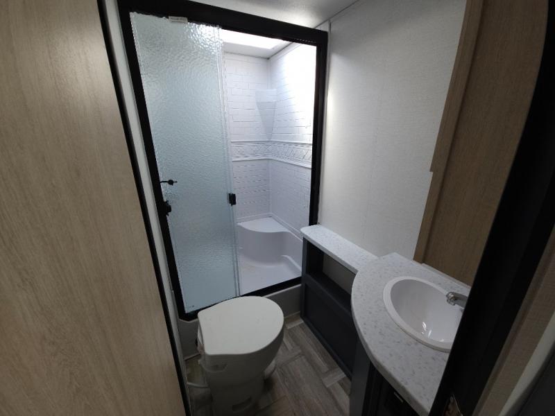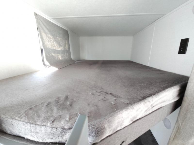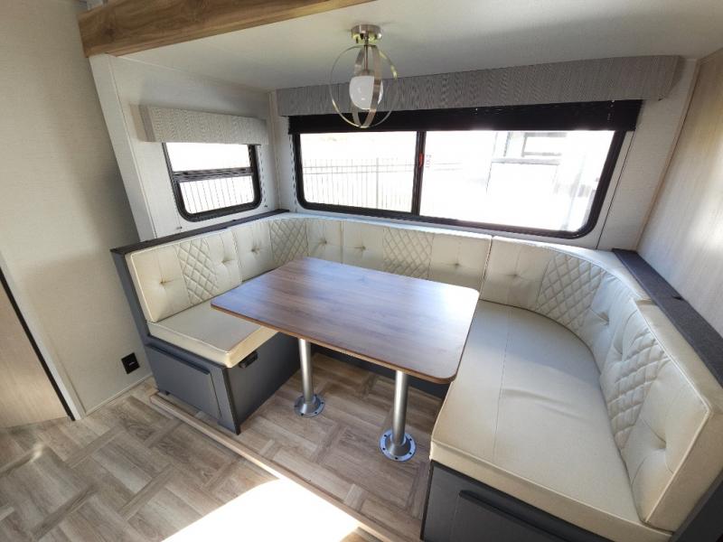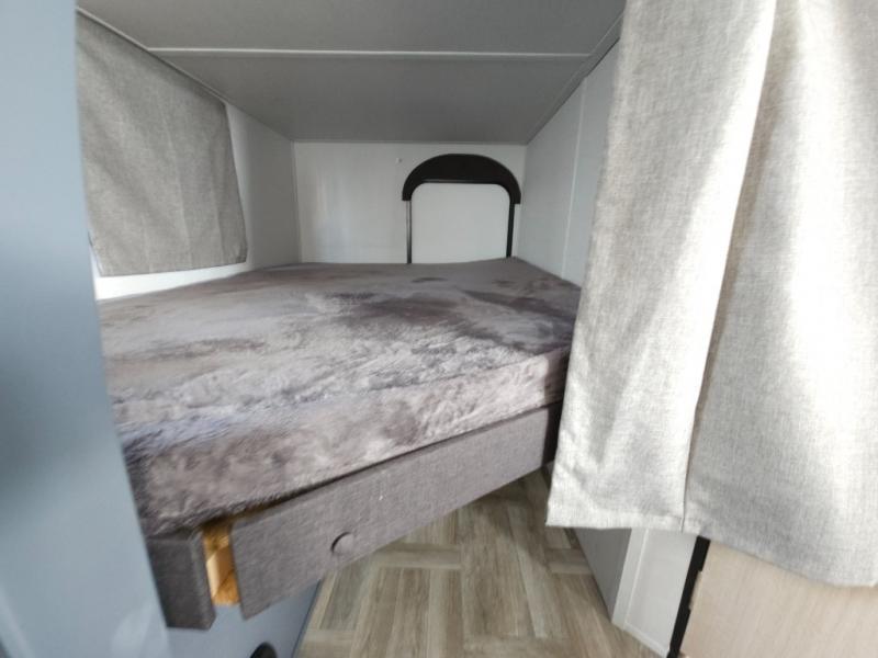 If you're looking for more comfort and a larger sleeping capacity in your next RV, this travel trailer is the one! There are double-size bunks in the rear corner, along with a ladder to easily hop into bed, and the full bath is in the other rear corner for easy nighttime use. You'll enjoy the front private bedroom with its queen bed and dual wardrobes for your things, and a separate closet with washer and dryer prep if you choose to add those appliances. And one of the dual entry doors is located here so you can easily slip out in the morning without waking everyone else up in the trailer! In the morning, you can make breakfast in the full kitchen, then dine at the booth dinette within the large slide out. There is also a theater here for more comfort. This travel trailer also includes plenty of storage space, including a walk-in pantry with shelves, an additional storage closet, and a pass-thru storage outside for fishing poles!