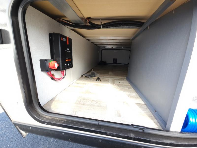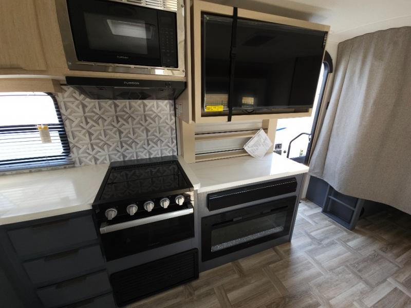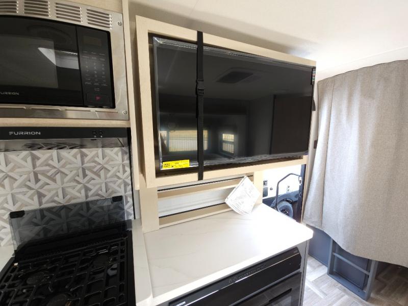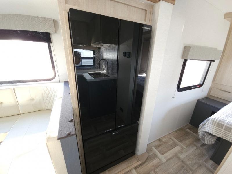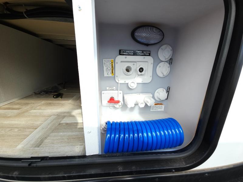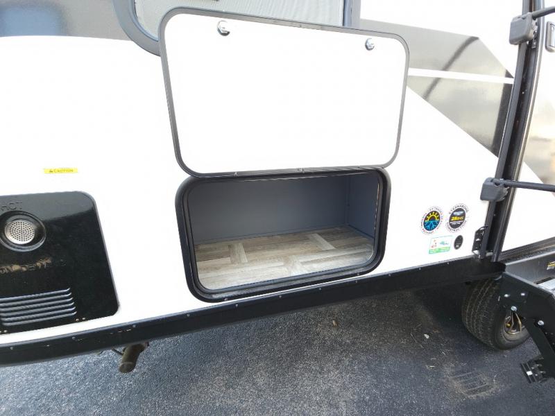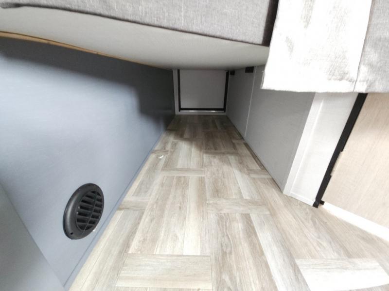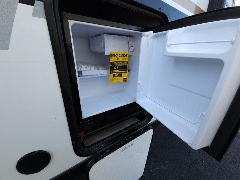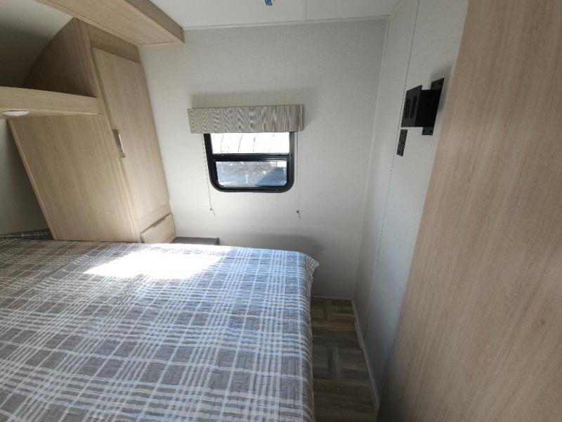 If you're looking for more comfort and a larger sleeping capacity in your next RV, this travel trailer is the one! There are double-size bunks in the rear corner, along with a ladder to easily hop into bed, and the full bath is in the other rear corner for easy nighttime use. You'll enjoy the front private bedroom with its queen bed and dual wardrobes for your things, and a separate closet with washer and dryer prep if you choose to add those appliances. And one of the dual entry doors is located here so you can easily slip out in the morning without waking everyone else up in the trailer! In the morning, you can make breakfast in the full kitchen, then dine at the booth dinette within the large slide out. There is also a theater here for more comfort. This travel trailer also includes plenty of storage space, including a walk-in pantry with shelves, an additional storage closet, and a pass-thru storage outside for fishing poles!