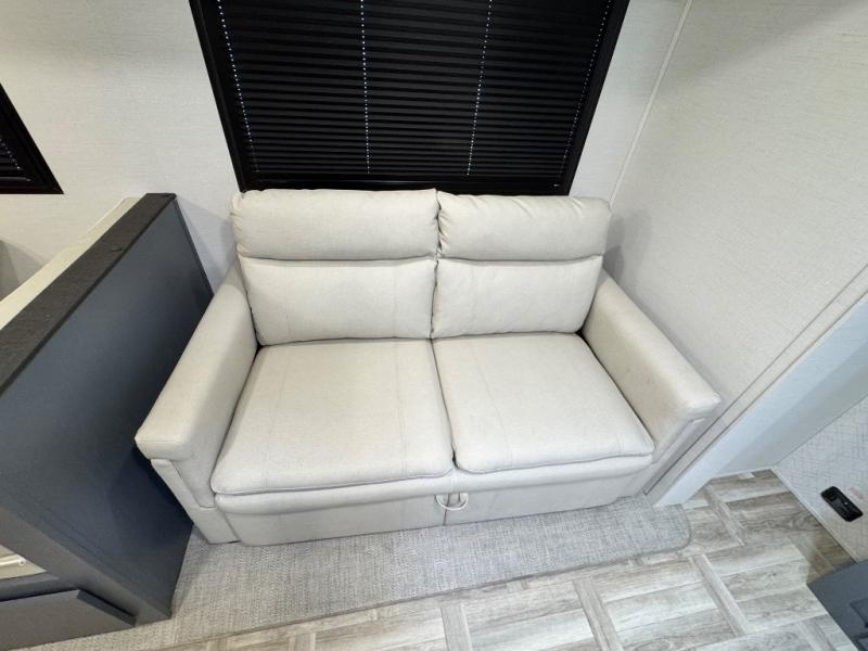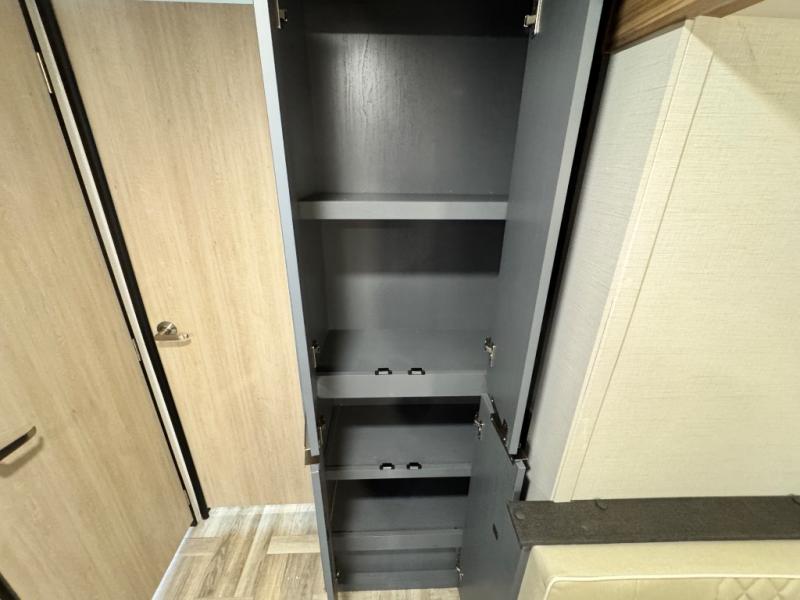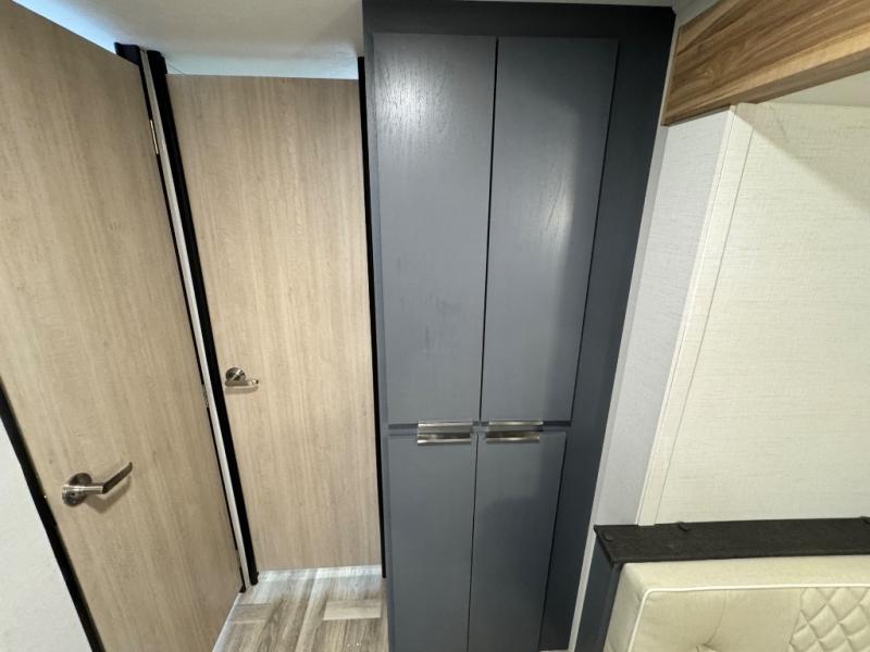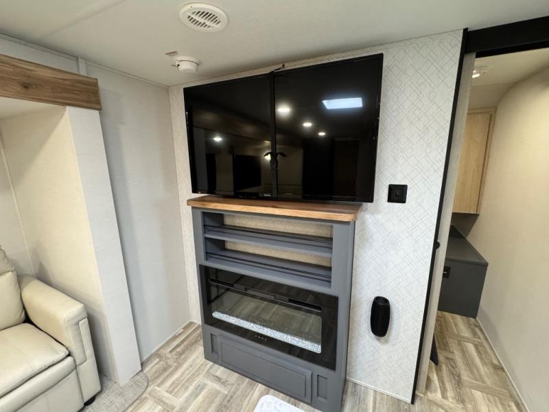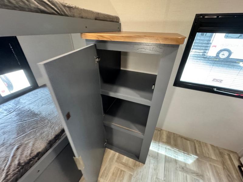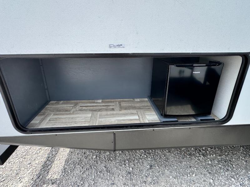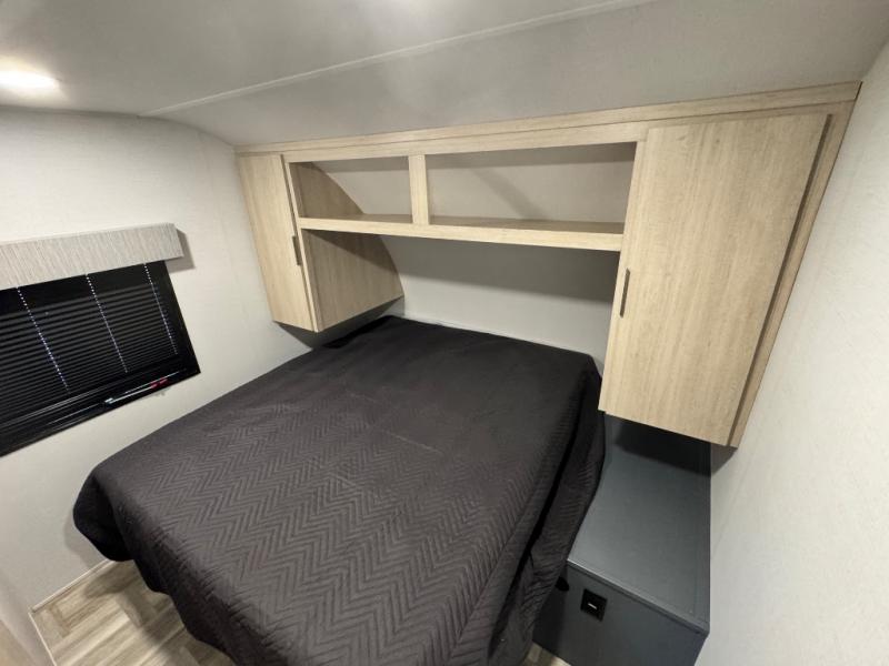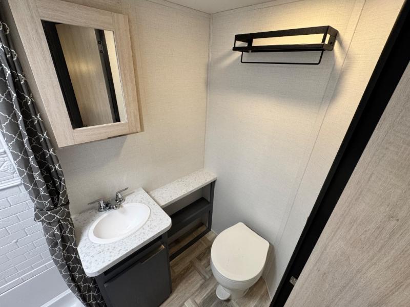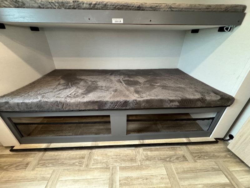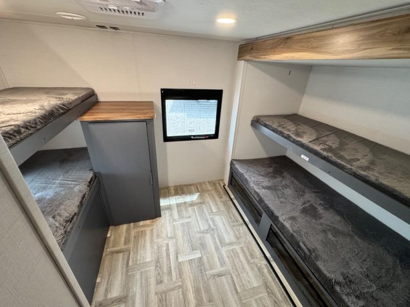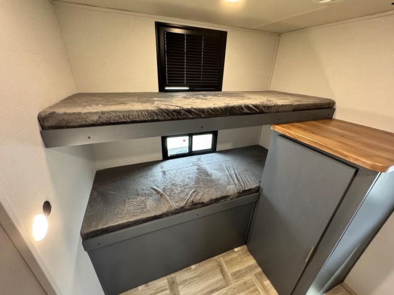 Camping with friends and family just got easier in this double slide, bunkhouse travel trailer! There are four bunks in the bunkhouse, along with a closet for clothes and shoes plus a slide out for more space. The front private bedroom provides the owners with their own space, and if you have any other guests, they can sleep on the booth dinette and sofa in the main living room. The full bath is convenient since you won't have to use the camp's facilities, and a full kitchen on board will let you whip up your best campground meals!