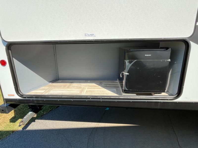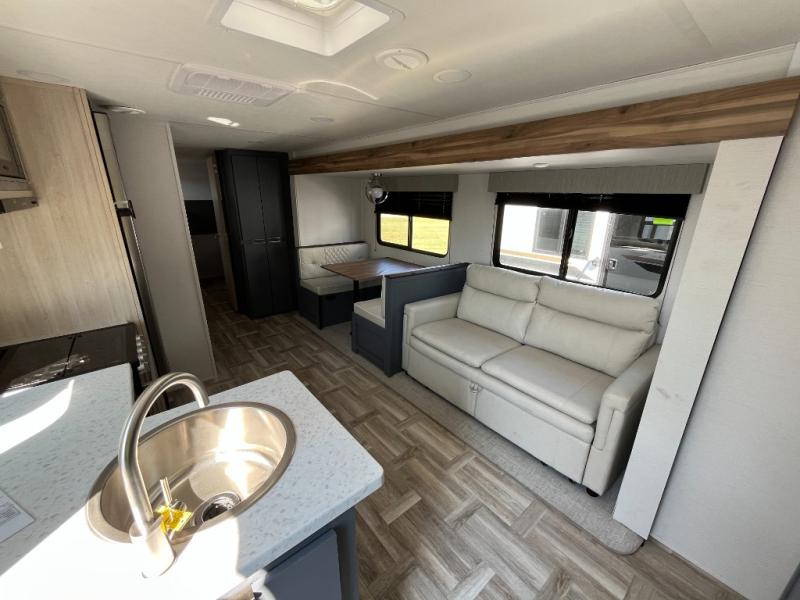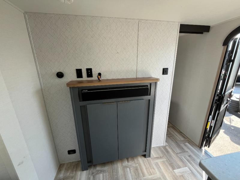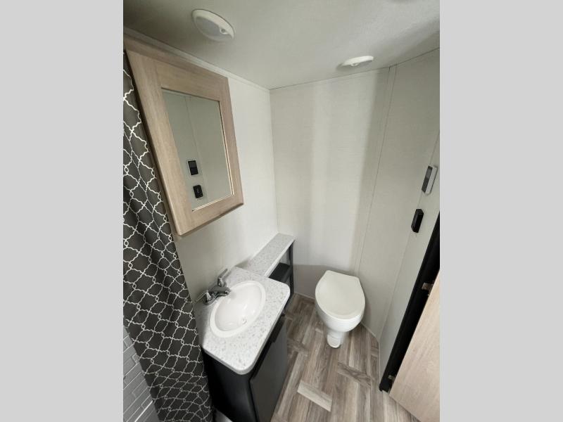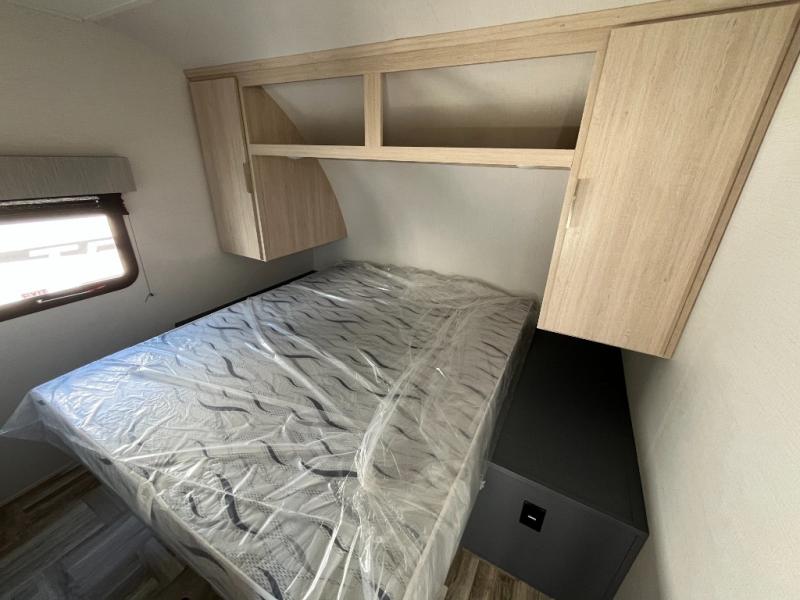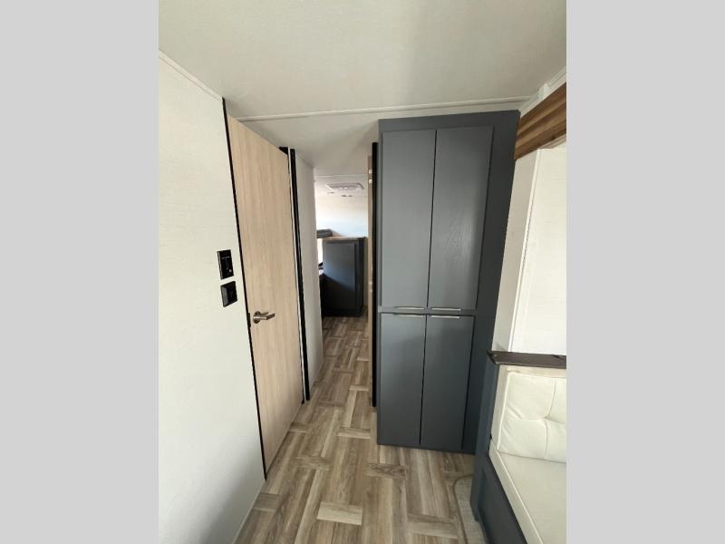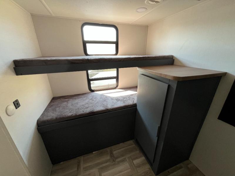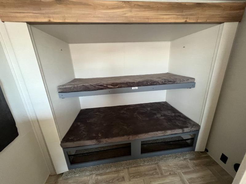 If more interior space and a larger sleeping capacity is what you're looking for, your search is over! The rear bunkhouse includes slide out bunk beds across from a second set of bunks plus a closet to keep this space organized. You will have the queen bed all to yourselves in the front bedroom, and there are even two wardrobes and an overhead cabinet for books. The combined living area and kitchen is made open thanks to the large slide out. Here, you'll find a sofa and booth dinette plus an entertainment center with TV prep if you want the option for movie nights. The chef of your group will love the full kitchen, complete with a microwave oven, 2 in 1 gas oven and range, and a large 2-door 12V refrigerator to keep your perishables fresh. Head outdoors after dinner to enjoy the 19' power awning with LED lights, and you can keep yard games in the exterior storage!