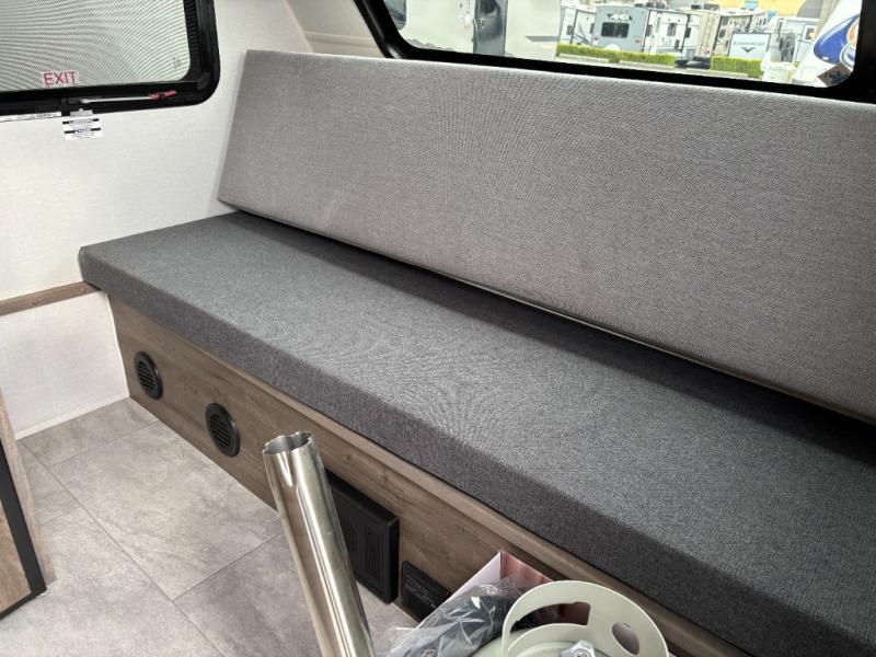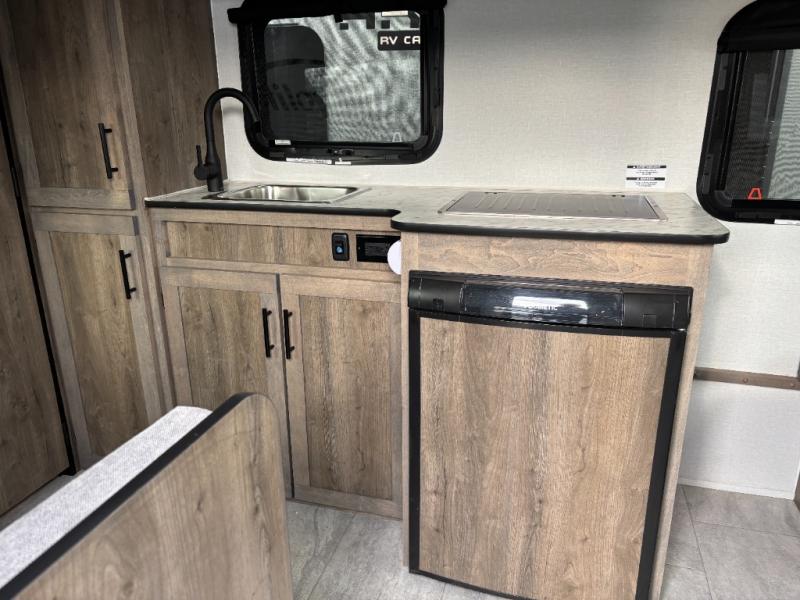 Hitch up your SUV or van to take this trailer camping with inside comforts only steps away once at your destination. You will appreciate being able to skip the public facilities thanks to the wet bath that includes a shower and cassette toilet. There is sleeping space available for three people on the sofa bed that converts to a 74" x 54" bed, and the dinette that measures 74" x 36" when folded down. You will find a stove, a sink, and a fridge to utilize to make meals, and you might decide to add the microwave option. The 20,000 BTU heater will keep you cozy during the cooler months, and the fan during the warmer months. Be sure to take a look at the options, such as adding an air conditioner, a front window with curtain, an exterior shower, and an AM/FM/CD/MP3/Bluetooth radio.