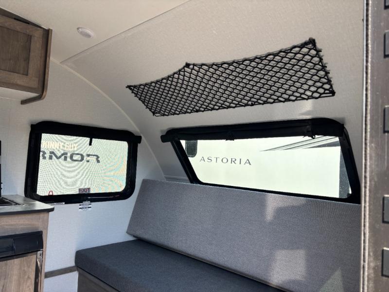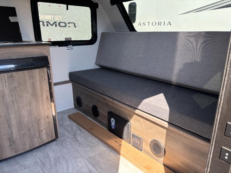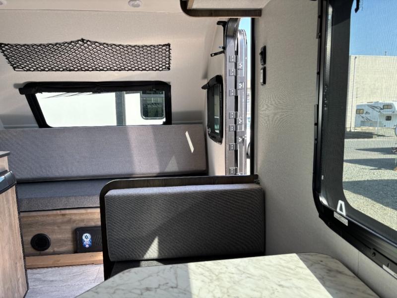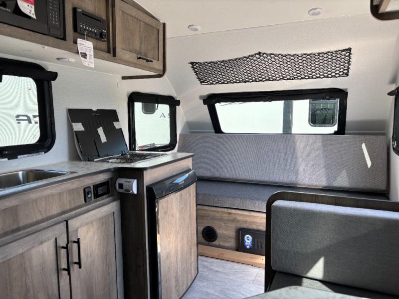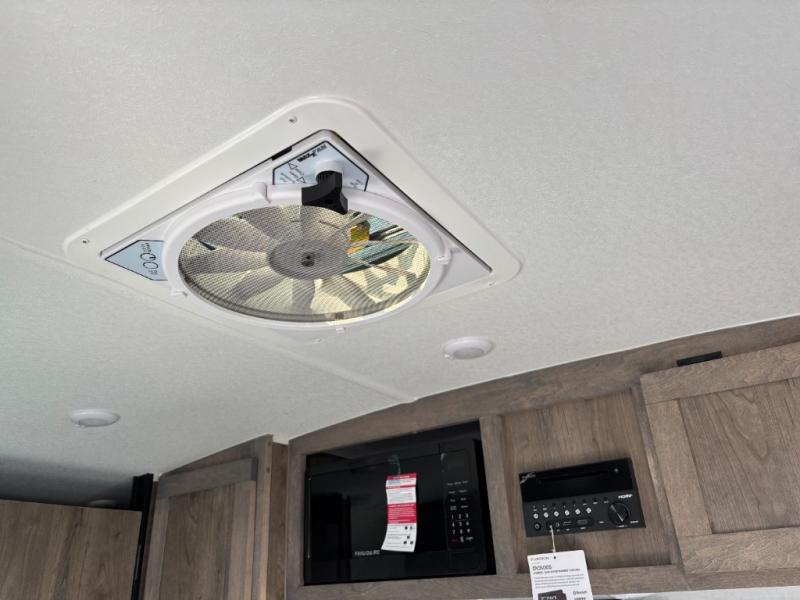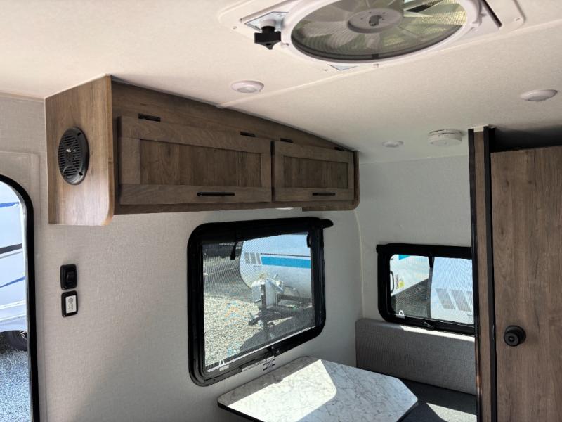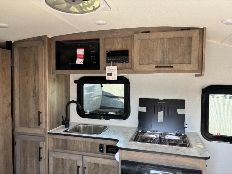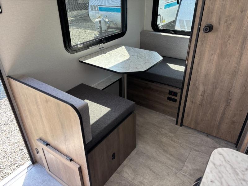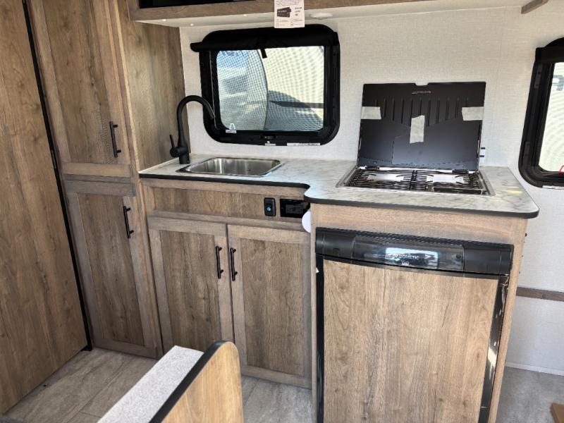 Hitch up your SUV or van to take this trailer camping with inside comforts only steps away once at your destination. You will appreciate being able to skip the public facilities thanks to the wet bath that includes a shower and cassette toilet. There is sleeping space available for three people on the sofa bed that converts to a 74" x 54" bed, and the dinette that measures 74" x 36" when folded down. You will find a stove, a sink, and a fridge to utilize to make meals, and you might decide to add the microwave option. The 20,000 BTU heater will keep you cozy during the cooler months, and the fan during the warmer months. Be sure to take a look at the options, such as adding an air conditioner, a front window with curtain, an exterior shower, and an AM/FM/CD/MP3/Bluetooth radio.