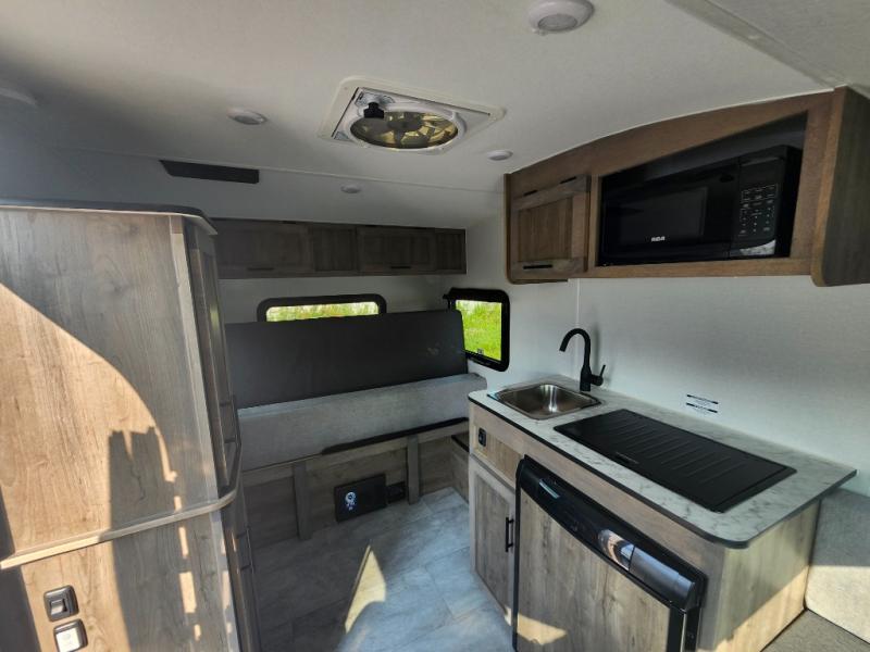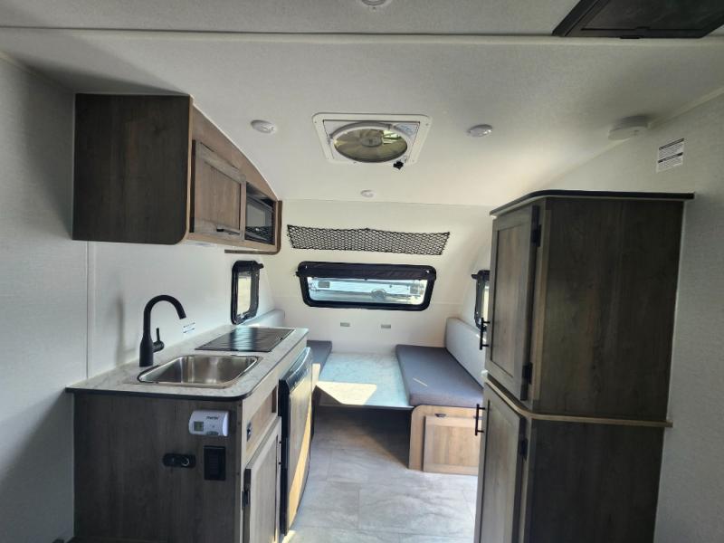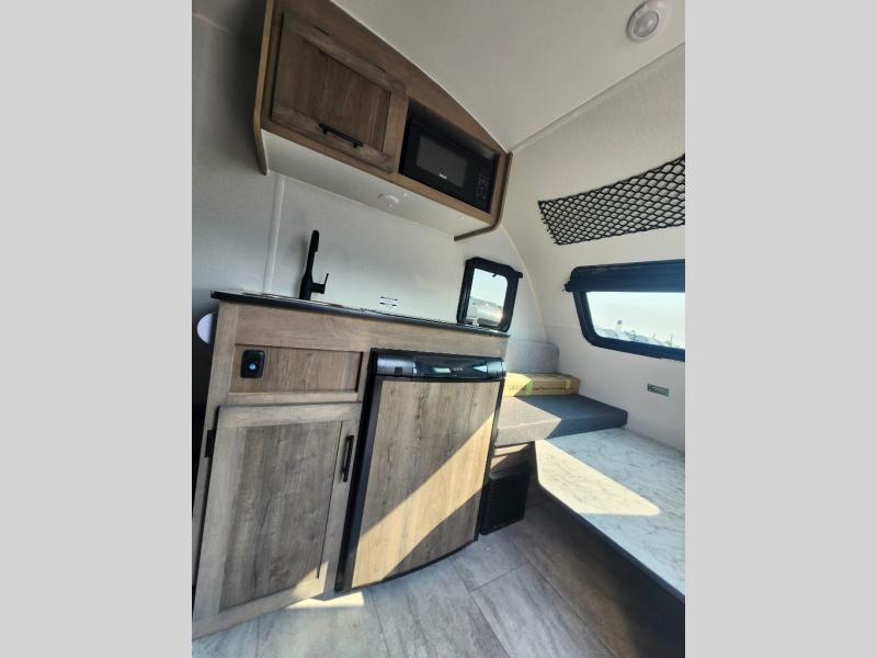Hitch up your compact car to easily tow this popular model, the Mini. This camping caravan can easily accommodate four people with the sofa that converts into a 74" x 54" bed and the dinette offering a 74" x 48" sleeping space. You will also have the comfort of 16,000 BTU heating, a 3.7/4.2 cu. ft. refrigerator, and a stove. Outside you will find a 120 volts outlet and a storage door for a few more items. You may decide to add a option or two such as an air conditioner, an exterior shower, and a radio.