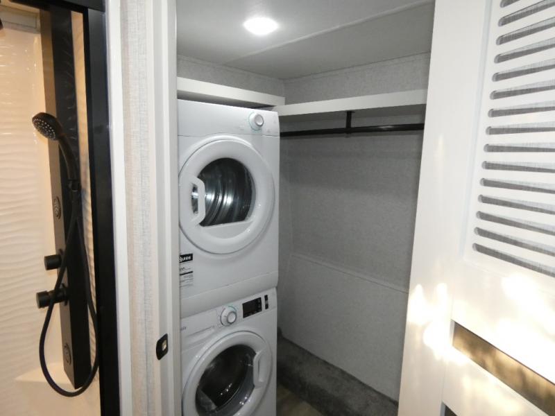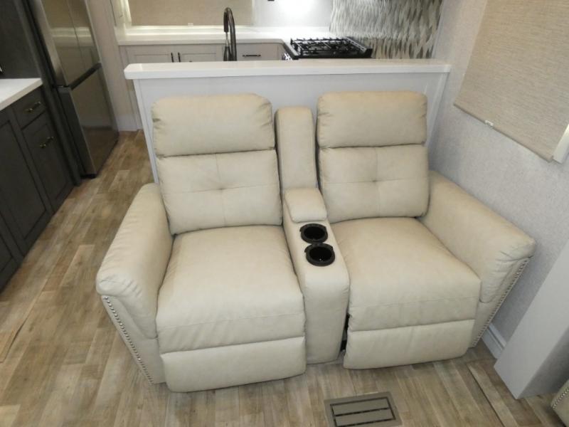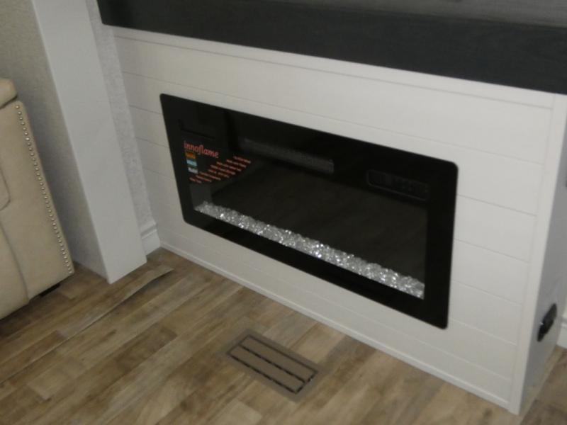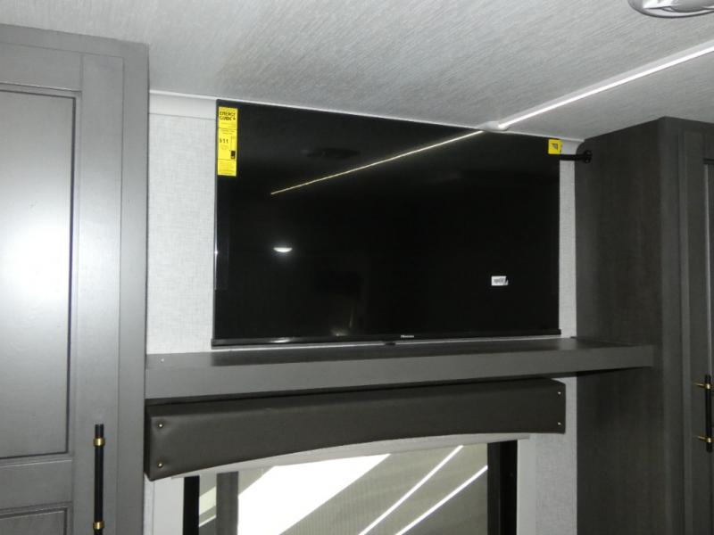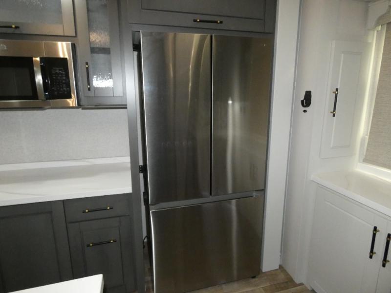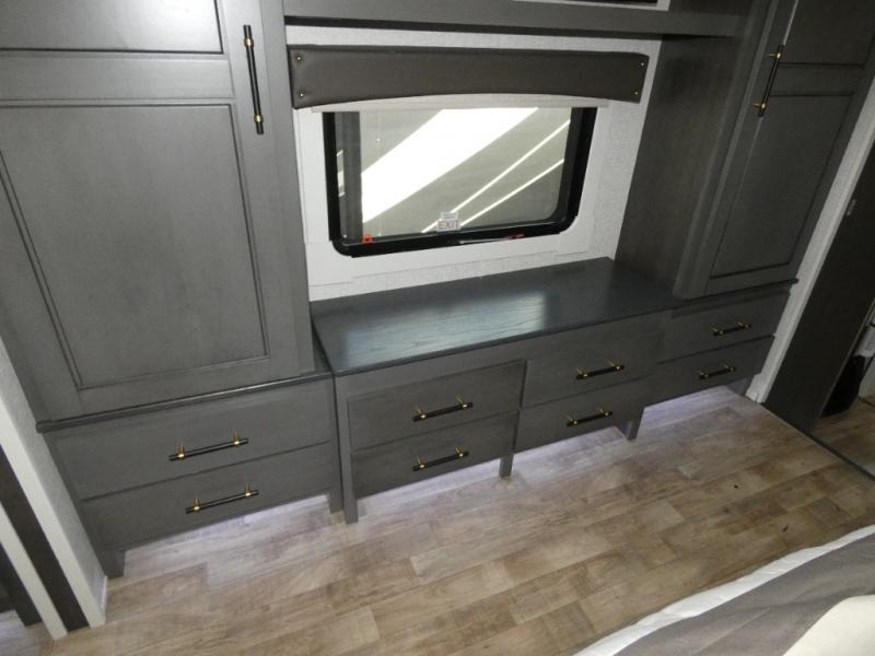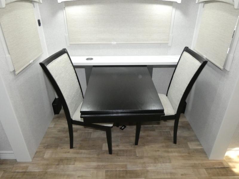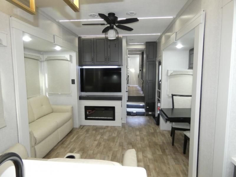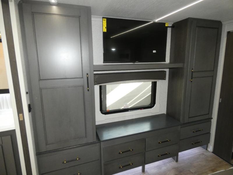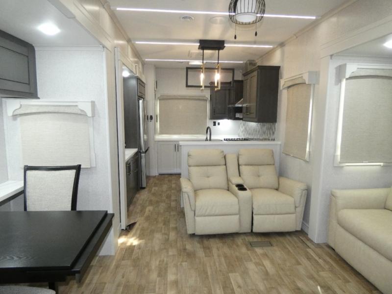 One step inside this fifth wheel and you'll see why it's an award-winning most-popular unit! You'll love the rear kitchen that includes ample countertop for food prep and a slide including the refrigerator, pantry and microwave for added moving around space. Head to the main living area where you can enjoy some family time on the theater seats, and the dinette with chairs will be the perfect place for a game of cards. The half bath is right off of this room for convenience, and your guests or kids can convert the tri-fold sofa into a bed for sleeping space at night. You will love the master bedroom with a king bed slide out, a dresser with a flip-up lid, plus a 39" TV. The front full bath is super spacious, and it includes a large walk-in wardrobe where you can even add an optional washer and dryer if you choose!