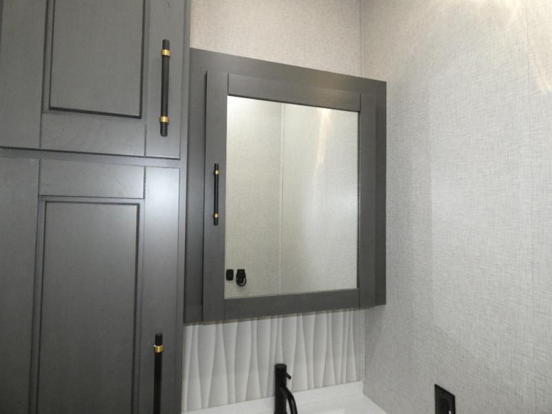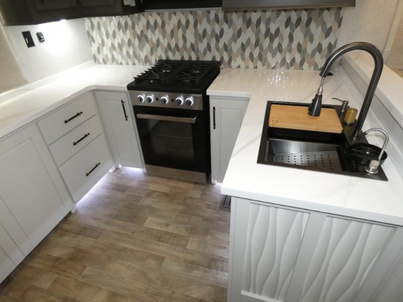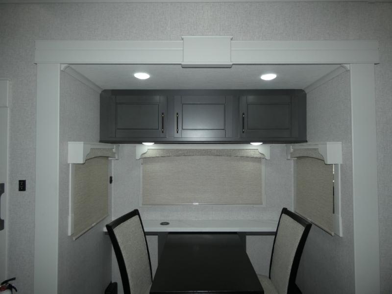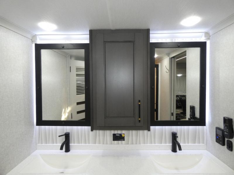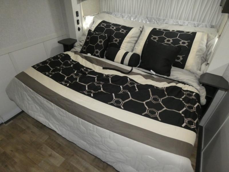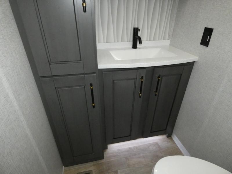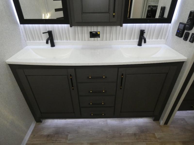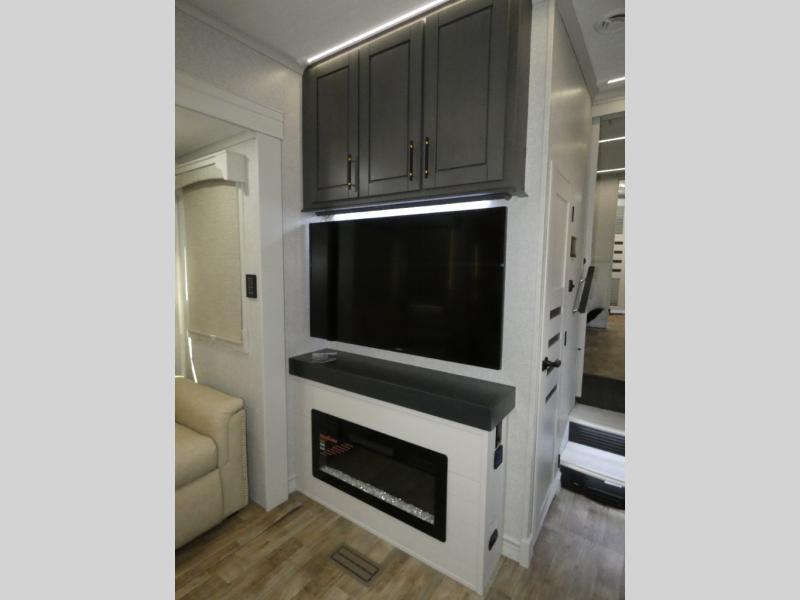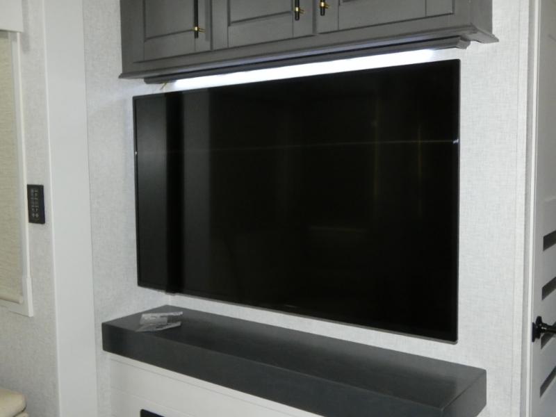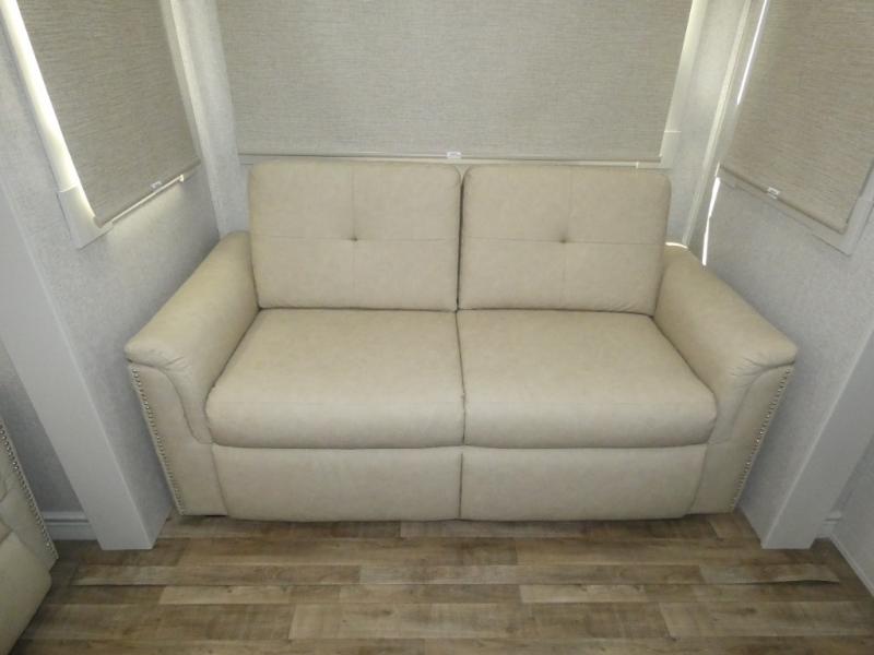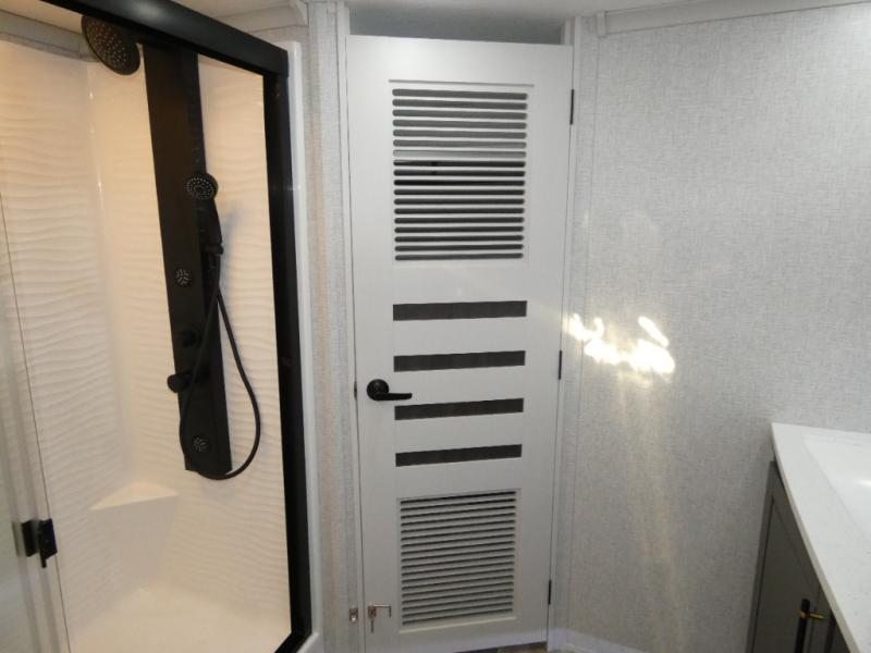 One step inside this fifth wheel and you'll see why it's an award-winning most-popular unit! You'll love the rear kitchen that includes ample countertop for food prep and a slide including the refrigerator, pantry and microwave for added moving around space. Head to the main living area where you can enjoy some family time on the theater seats, and the dinette with chairs will be the perfect place for a game of cards. The half bath is right off of this room for convenience, and your guests or kids can convert the tri-fold sofa into a bed for sleeping space at night. You will love the master bedroom with a king bed slide out, a dresser with a flip-up lid, plus a 39" TV. The front full bath is super spacious, and it includes a large walk-in wardrobe where you can even add an optional washer and dryer if you choose!