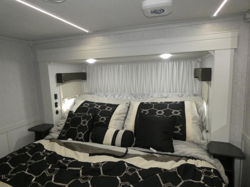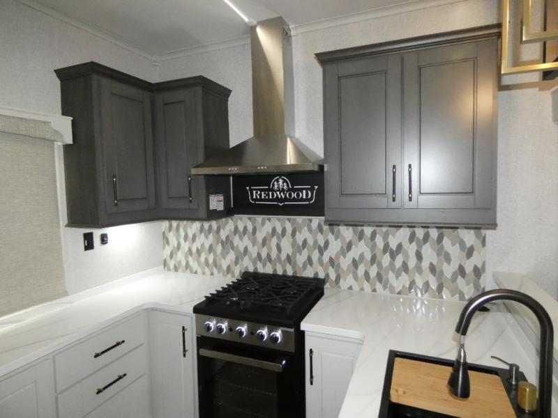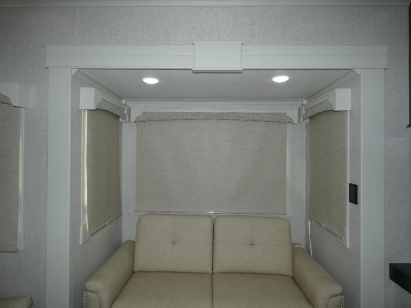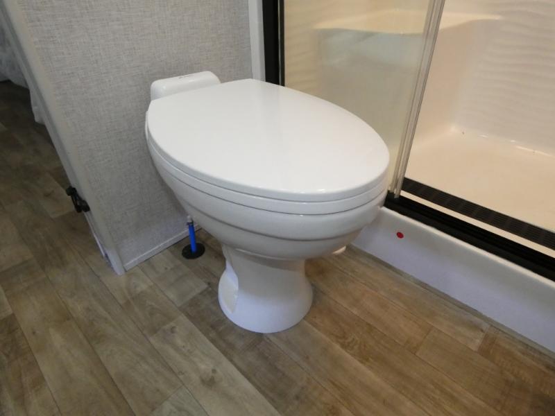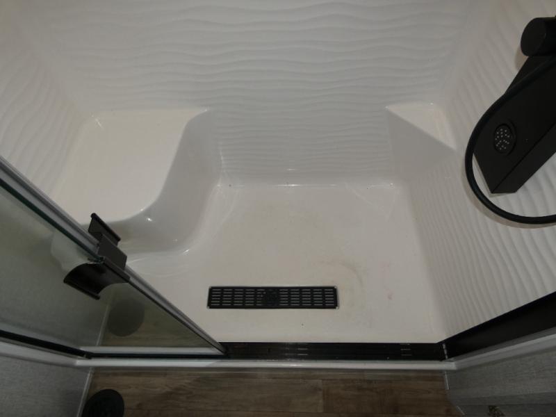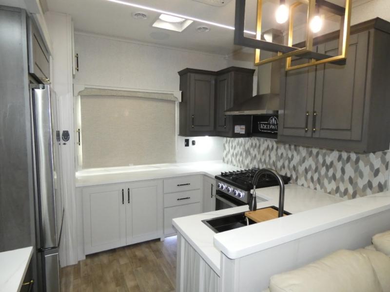 You are going to wish you found the Redwood fifth wheels sooner! With all of the residential comfort and modern luxury, you will be impressed. The Williamsburg Furniture Collection includes two premium dinette chairs, a buffet-style adjustable dinette with leaf extension, a residential-style sofa, and powered theater seating. The luxury further extends to the bedroom where you will find a gel-foam king bed with tilt and C-PAP shelves on both sides of the bed. The straight roof line gives a luxury profile, and there are preparations for a wireless backup camera as well as solar power. The seamless residential insulated heat ducts will efficiently heat your unit, and there is an exterior radio in the fully finished and heated pass-through with slat board storage.