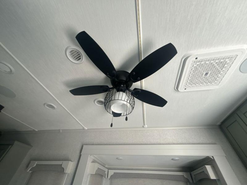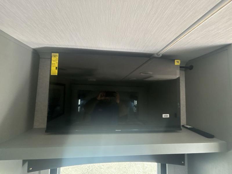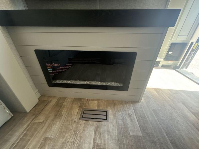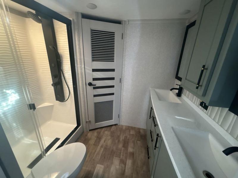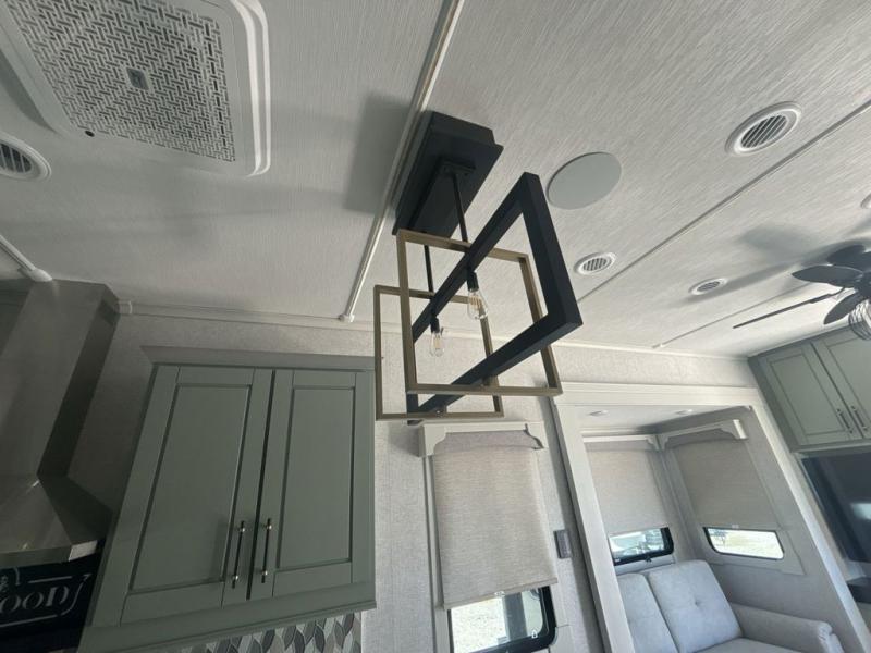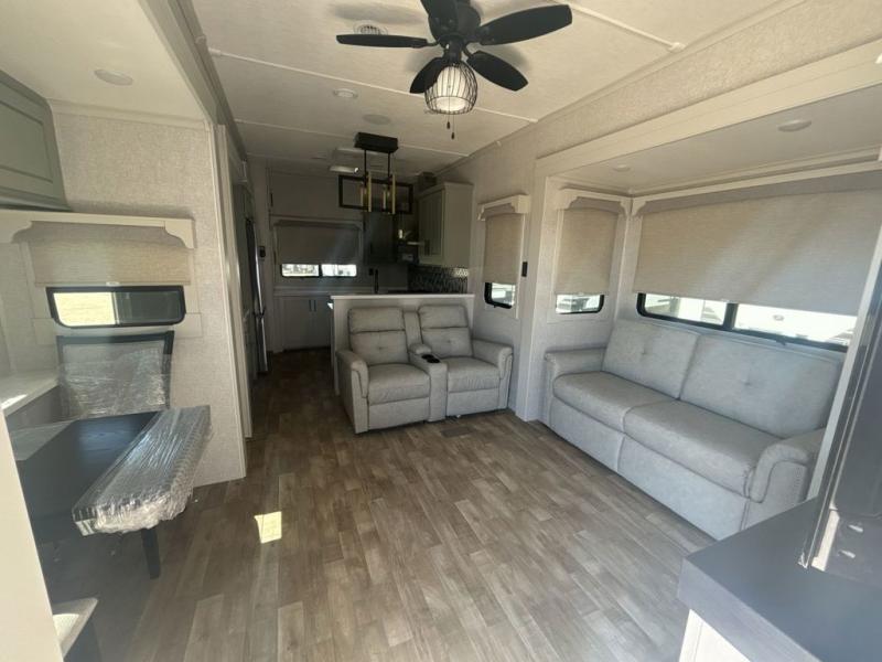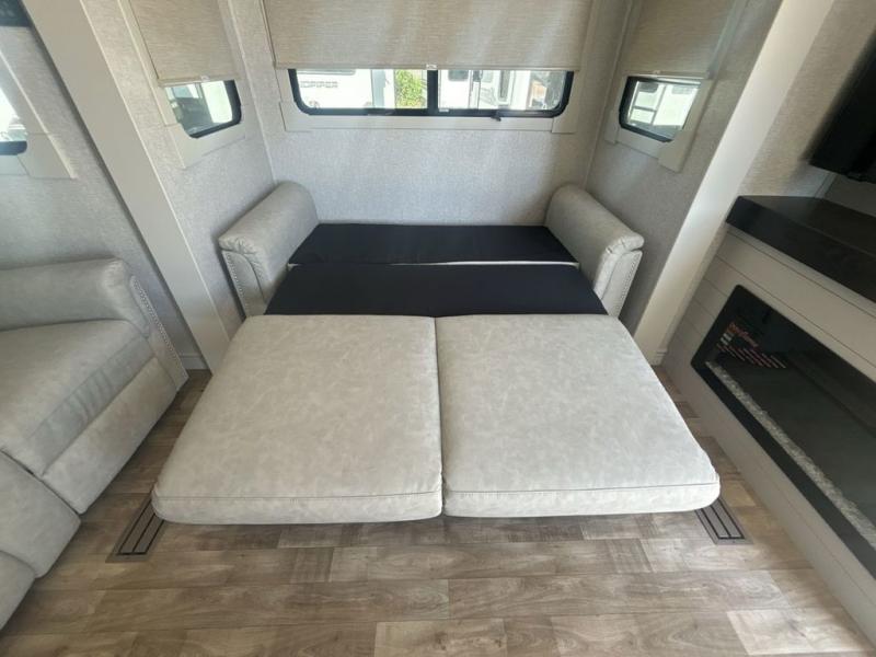 One step inside this fifth wheel and you'll be hooked! You'll love the rear kitchen that includes ample countertop for food prep and a slide including the refrigerator, pantry and microwave for added moving around space. Head to the main living area where you can enjoy some family time on the theater seats, and the dinette with chairs will be the perfect place for a game of cards. The half bath is right off of this room for convenience, and your guests or kids can convert the tri-fold sofa into a bed for sleeping space at night. You will love the master bedroom with a king bed slide out, a dresser with a flip-up lid, plus a 39" TV. The front full bath is super spacious, and it includes a large walk-in wardrobe where you can even add an optional washer and dryer if you choose!