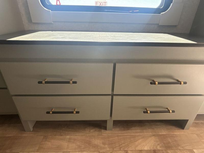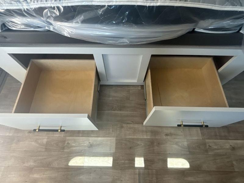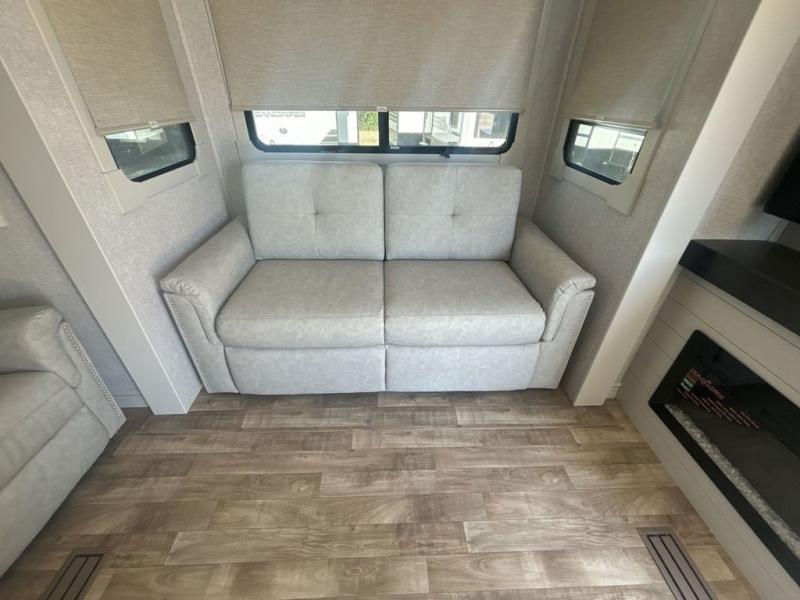 You are going to wish you found the Redwood fifth wheels sooner! With all of the residential comfort and modern luxury, you will be impressed. The Williamsburg Furniture Collection includes two premium dinette chairs, a buffet-style adjustable dinette with leaf extension, a residential-style sofa, and powered theater seating. The luxury further extends to the bedroom where you will find a gel-foam king bed with tilt and C-PAP shelves on both sides of the bed. The straight roof line gives a luxury profile, and there are preparations for a wireless backup camera as well as solar power. The seamless residential insulated heat ducts will efficiently heat your unit, and there is an exterior radio in the fully finished and heated pass-through with slat board storage.