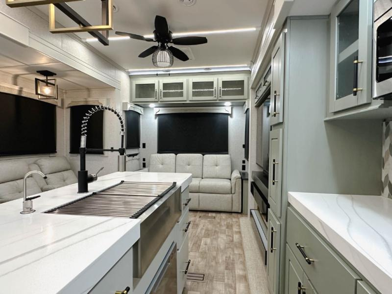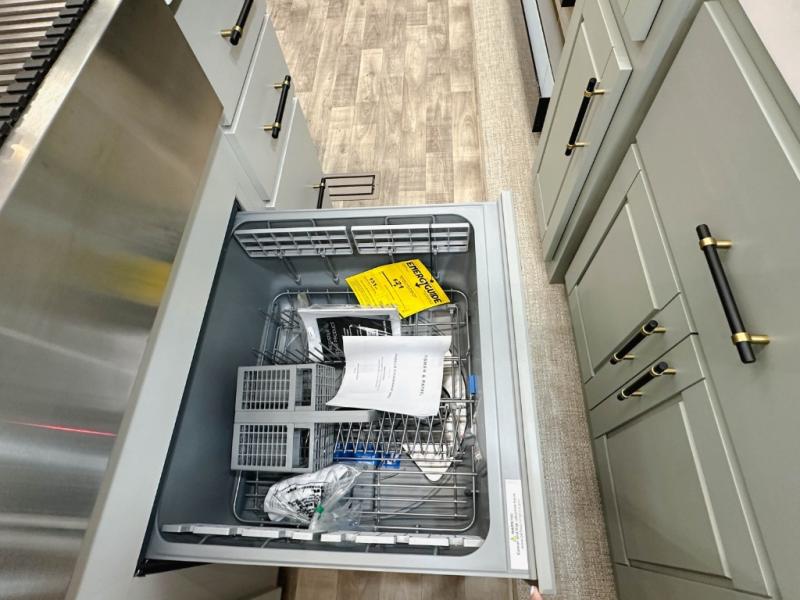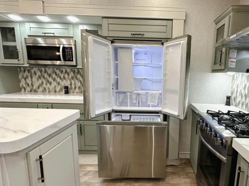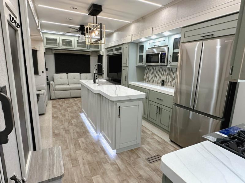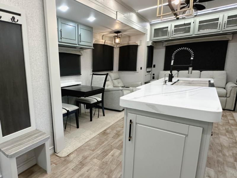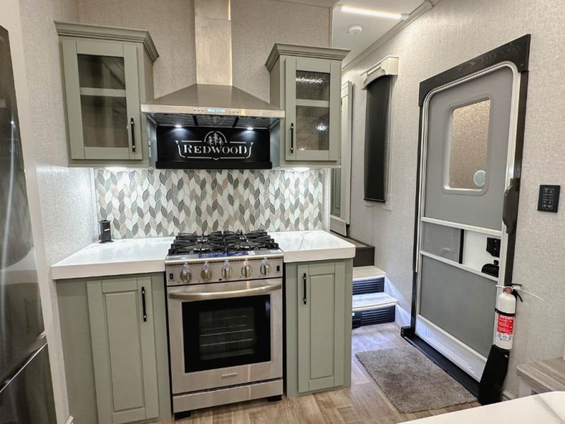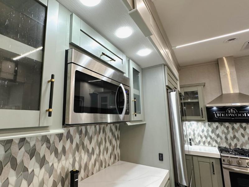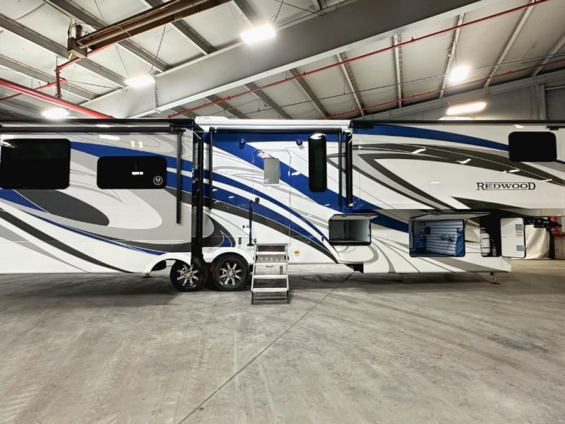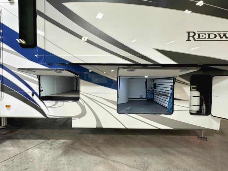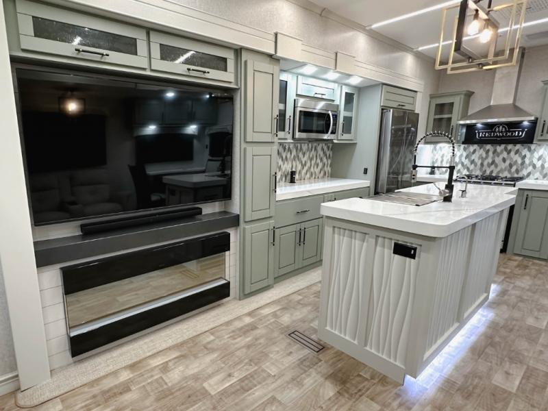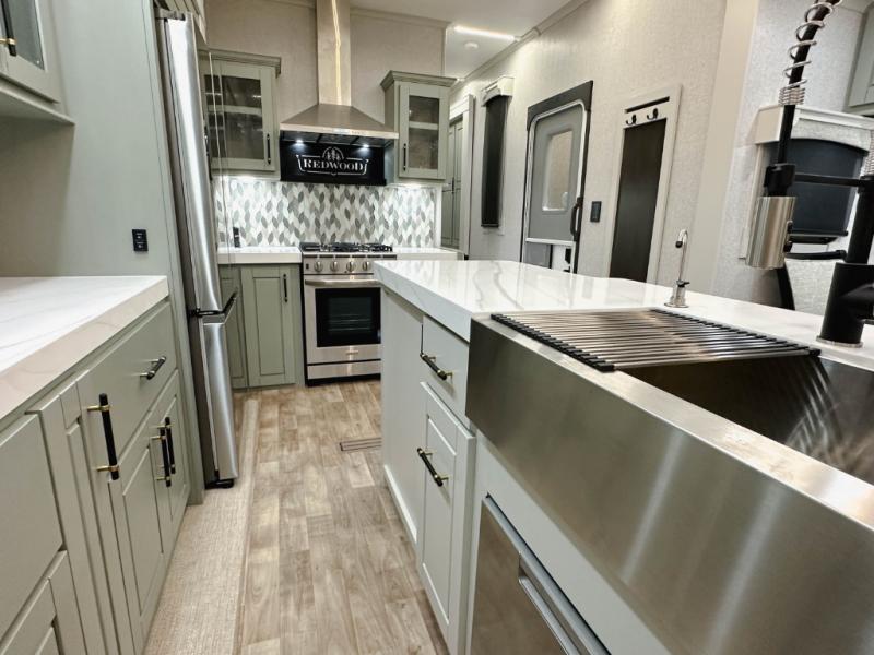 Live large in this Redwood RV quad slide fifth wheel featuring a combined kitchen and living area with dual opposing slides for maximum space in this area alone. There is plenty of seating with an 80" tri-fold sofa along the rear wall, and 68" theater seats plus a dining table with two chairs within the curbside slide. You can easily entertain guests in this space and the center island with a sink, and the dishwasher prep gives you the option to make cleaning easier. You will love the entertainment center with 65" TV opposite the theater seats for movie night, and when it's time to turn in, a spacious master bedroom with dual opposing slides as well. This space offer a king bed, ample storage, and a dual entry bath with 48" shower including a seat with a slide out linen cabinet and vanity sink which is all part of the bed slide.