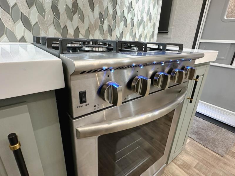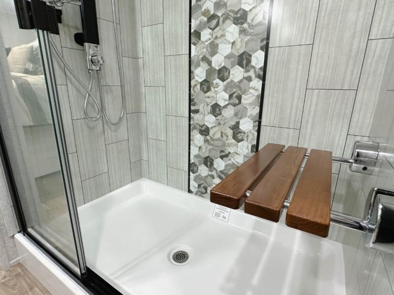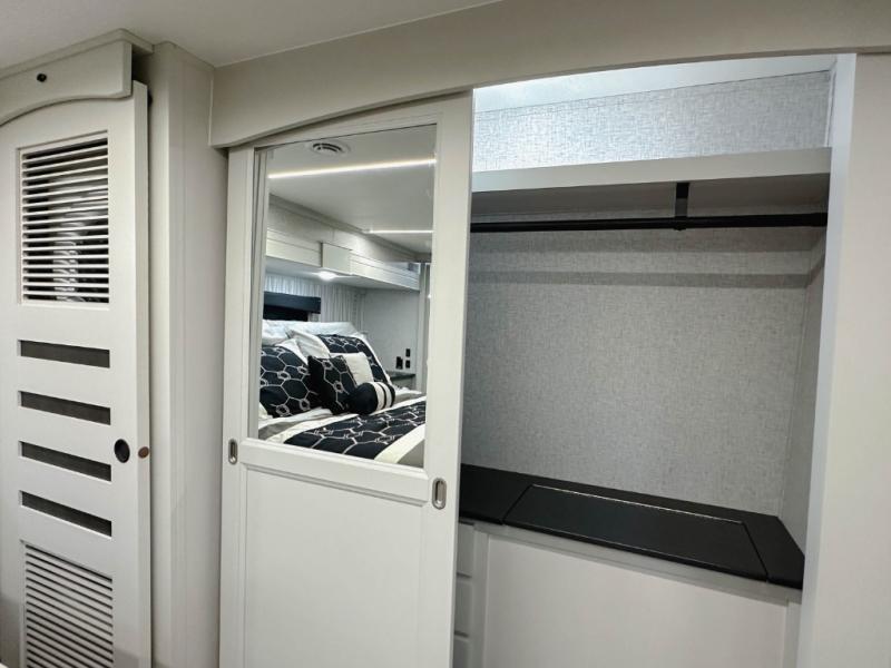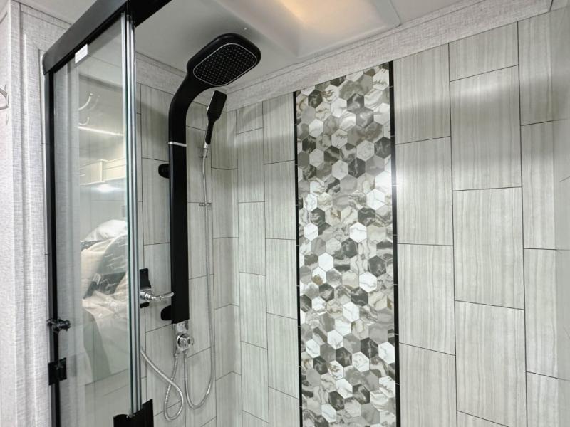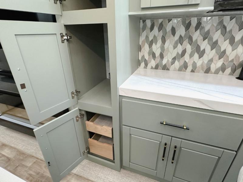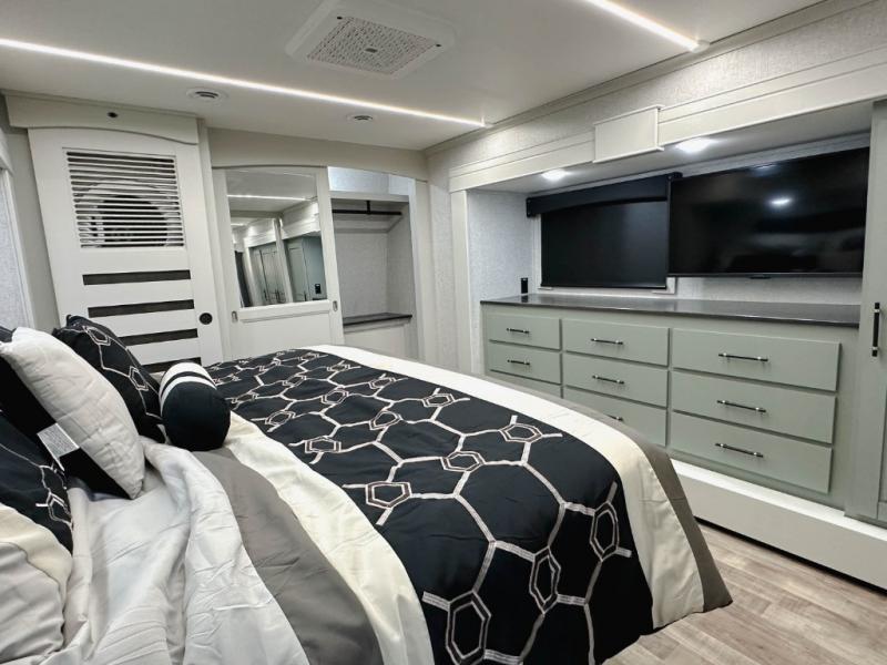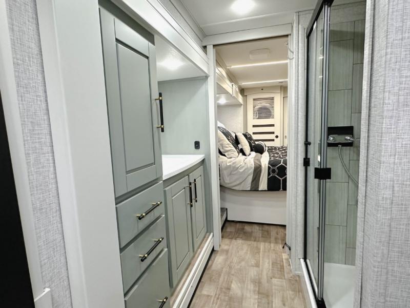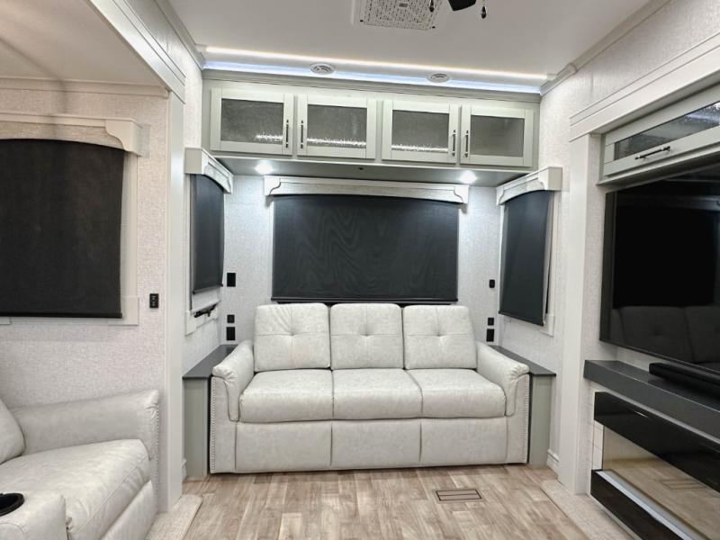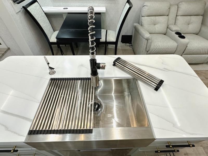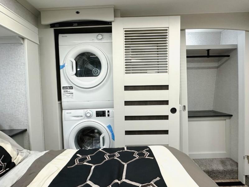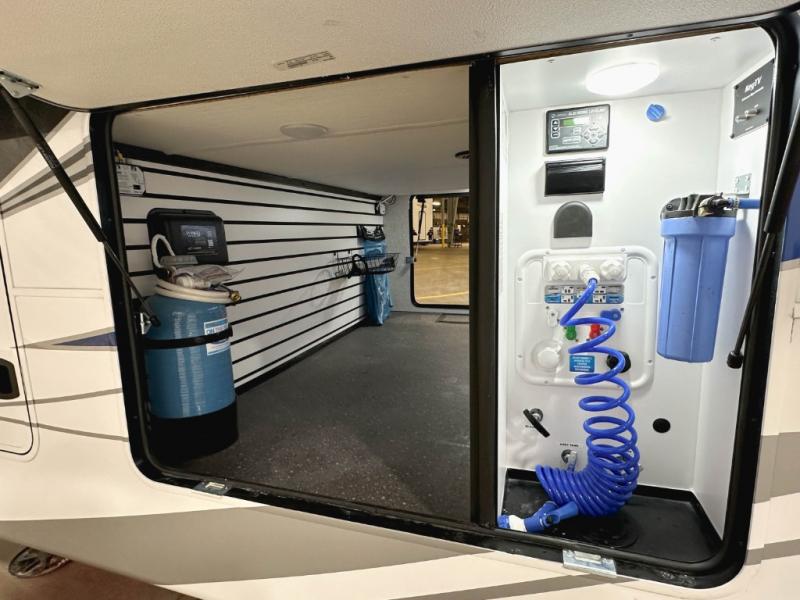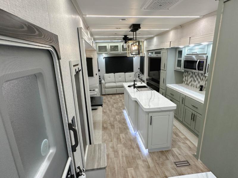 Live large in this Redwood RV quad slide fifth wheel featuring a combined kitchen and living area with dual opposing slides for maximum space in this area alone. There is plenty of seating with an 80" tri-fold sofa along the rear wall, and 68" theater seats plus a dining table with two chairs within the curbside slide. You can easily entertain guests in this space and the center island with a sink, and the dishwasher prep gives you the option to make cleaning easier. You will love the entertainment center with 65" TV opposite the theater seats for movie night, and when it's time to turn in, a spacious master bedroom with dual opposing slides as well. This space offer a king bed, ample storage, and a dual entry bath with 48" shower including a seat with a slide out linen cabinet and vanity sink which is all part of the bed slide.