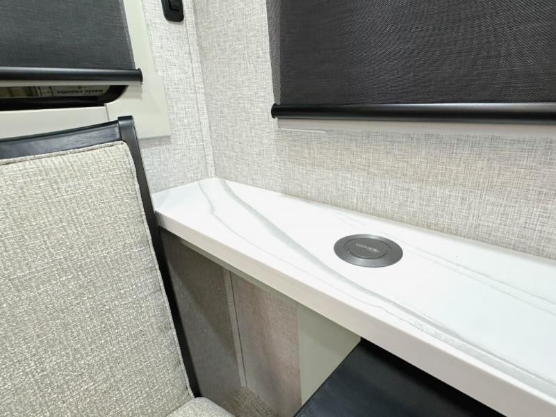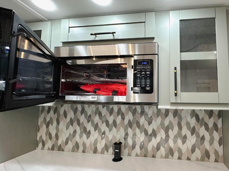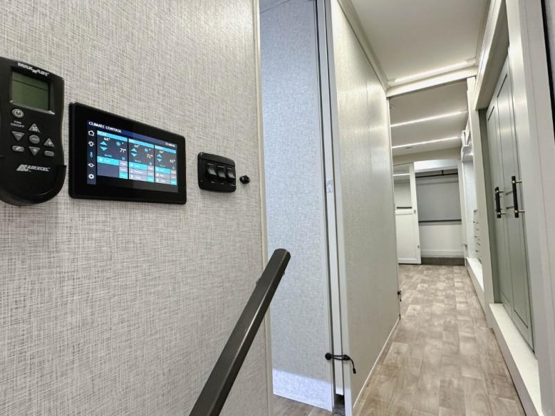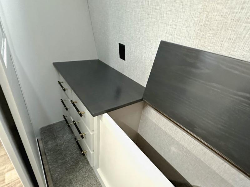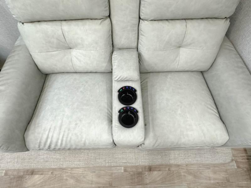 You are going to wish you found the Redwood fifth wheels sooner! With all of the residential comfort and modern luxury, you will be impressed. The Williamsburg Furniture Collection includes two premium dinette chairs, a buffet-style adjustable dinette with leaf extension, a residential-style sofa, and powered theater seating. The luxury further extends to the bedroom where you will find a gel-foam king bed with tilt and C-PAP shelves on both sides of the bed. The straight roof line gives a luxury profile, and there are preparations for a wireless backup camera as well as solar power. The seamless residential insulated heat ducts will efficiently heat your unit, and there is an exterior radio in the fully finished and heated pass-through with slat board storage.