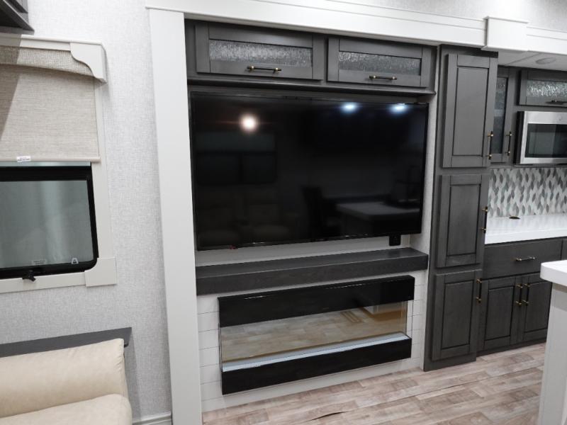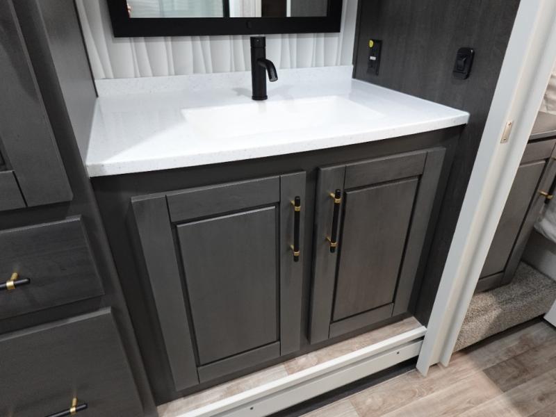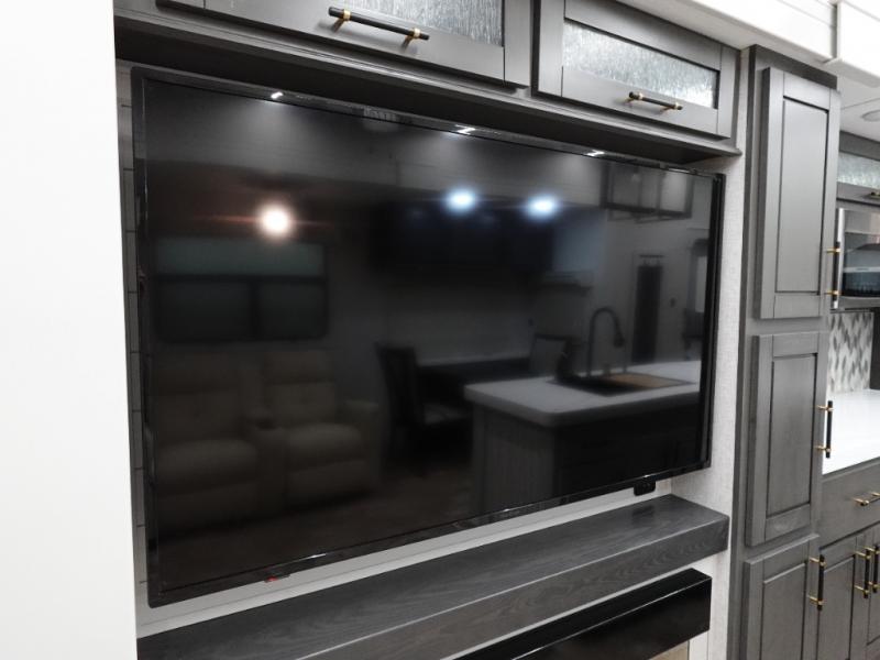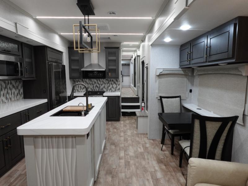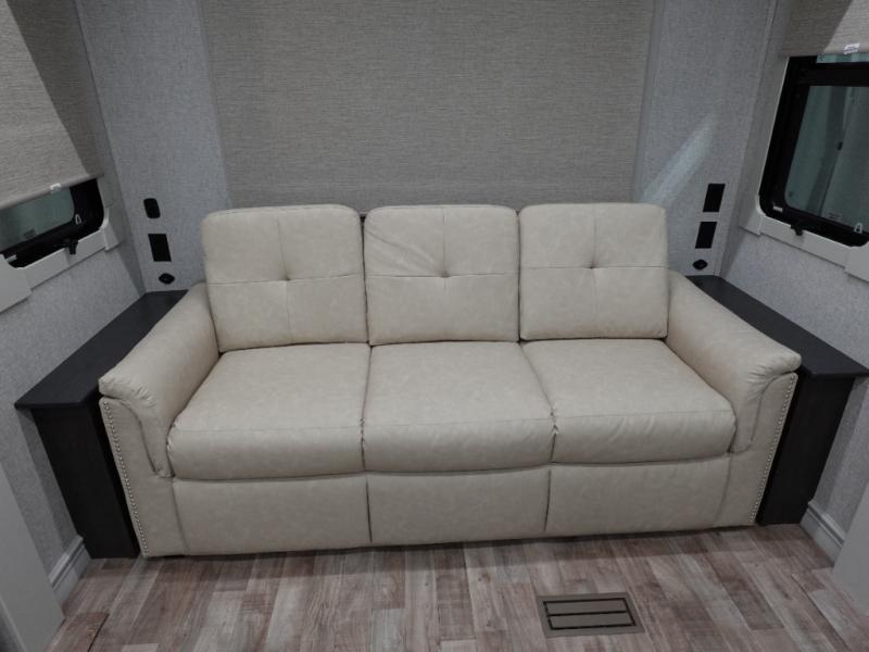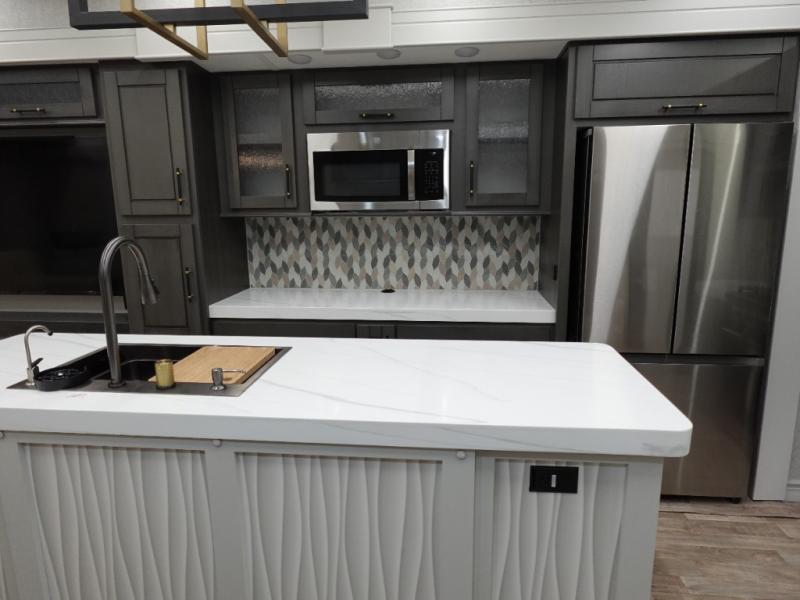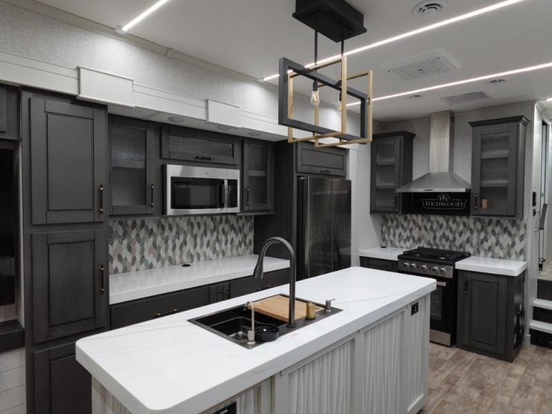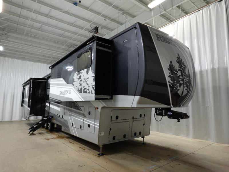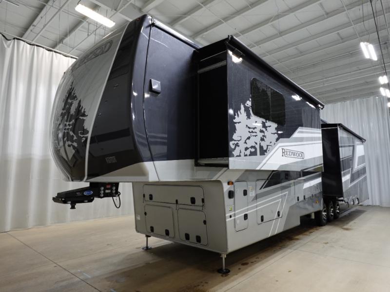 Live large in this Redwood RV quad slide fifth wheel featuring a combined kitchen and living area with dual opposing slides for maximum space in this area alone. There is plenty of seating with an 80" tri-fold sofa along the rear wall, and 68" theater seats plus a dining table with two chairs within the curbside slide. You can easily entertain guests in this space and the center island with sink, and the dishwasher prep gives you the option to make cleaning easier. You will love the entertainment center with 65" TV opposite the theater seats for movie night, and when it's time to turn in, a spacious master bedroom with dual opposing slides as well. This space offer a king bed, ample storage, and a dual entry bath with 48" shower including a seat with a slide out linen cabinet and vanity sink which is all part of the bed slide.