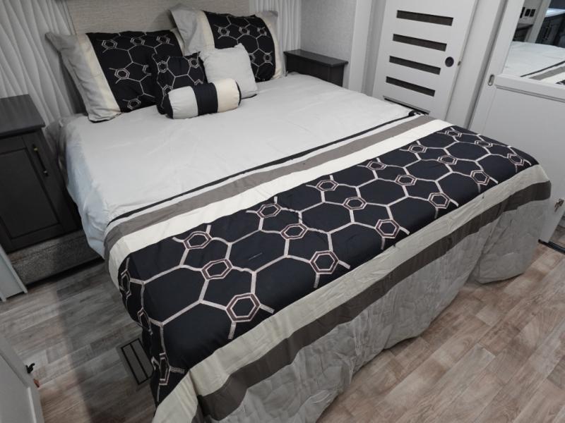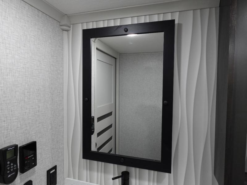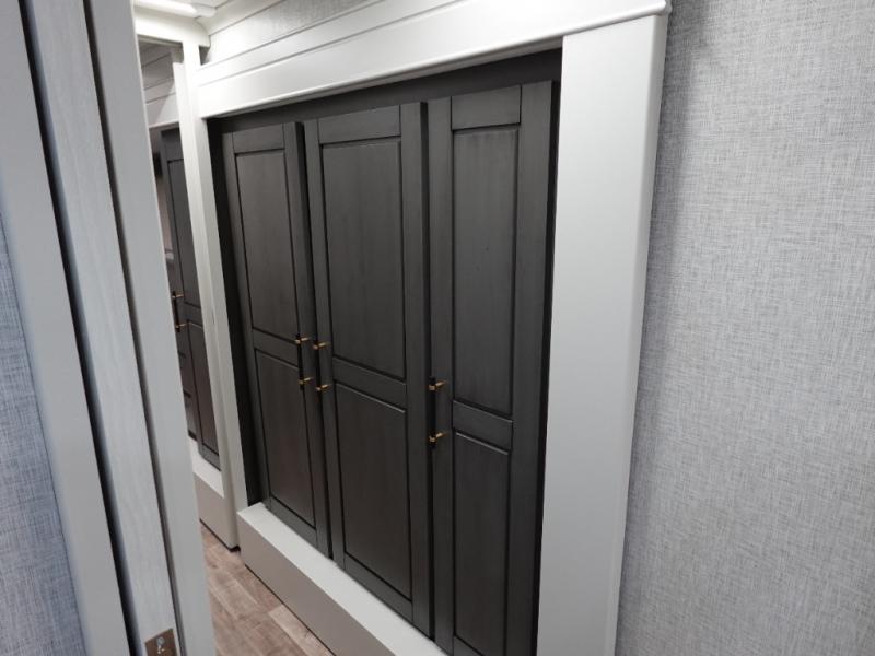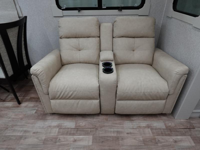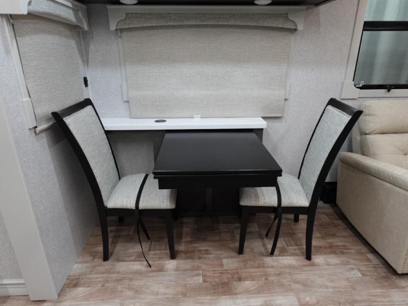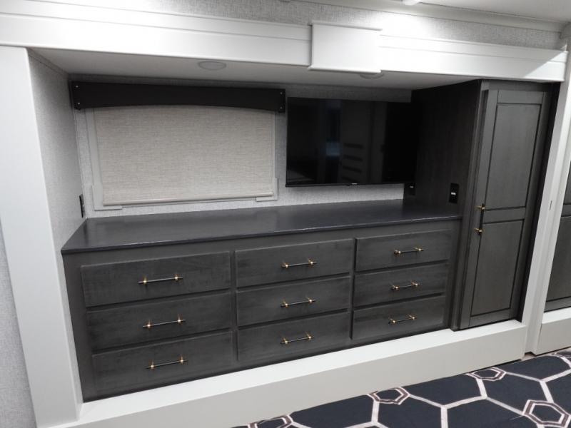 You are going to wish you found the Redwood fifth wheels sooner! With all of the residential comfort and modern luxury, you will be impressed. The Williamsburg Furniture Collection includes two premium dinette chairs, a buffet-style adjustable dinette with leaf extension, a residential-style sofa, and powered theater seating. The luxury further extends to the bedroom where you will find a gel-foam king bed with tilt and C-PAP shelves on both sides of the bed. The straight roof line gives a luxury profile, and there are preparations for a wireless backup camera as well as solar power. The seamless residential insulated heat ducts will efficiently heat your unit, and there is an exterior radio in the fully finished and heated pass-through with slat board storage.