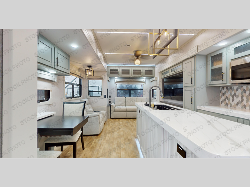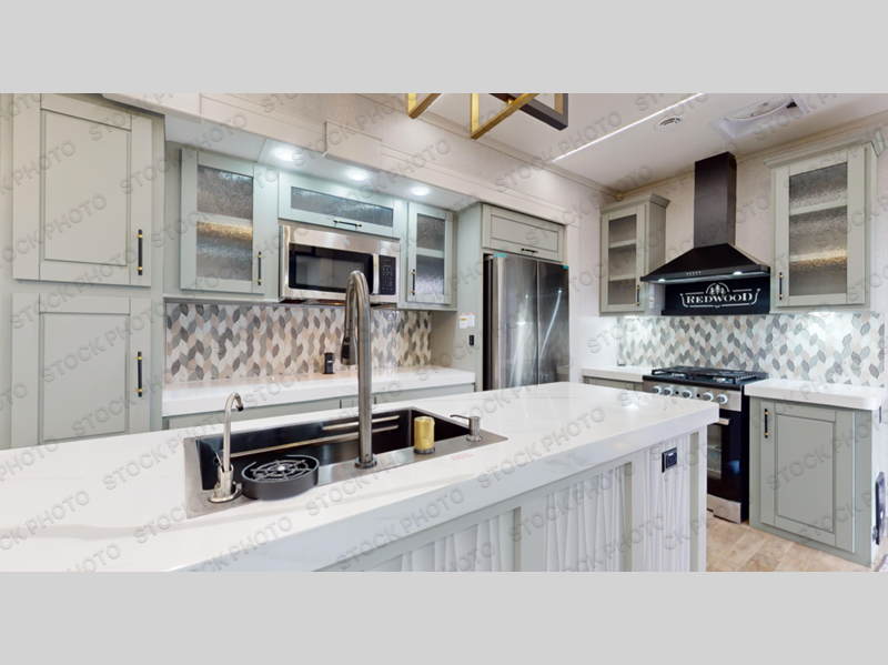 Live large in this Redwood RV quad slide fifth wheel featuring a combined kitchen and living area with dual opposing slides for maximum space in this area alone. There is plenty of seating with an 80" tri-fold sofa along the rear wall, and 68" theater seats plus a dining table with two chairs within the curbside slide. You can easily entertain guests in this space and the center island with sink, and the dishwasher prep gives you the option to make cleaning easier. You will love the entertainment center with 65" TV opposite the theater seats for movie night, and when it's time to turn in, a spacious master bedroom with dual opposing slides as well. This space offer a king bed, ample storage, and a dual entry bath with 48" shower including a seat with a slide out linen cabinet and vanity sink which is all part of the bed slide.