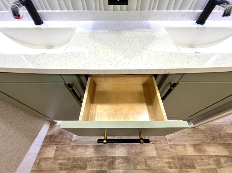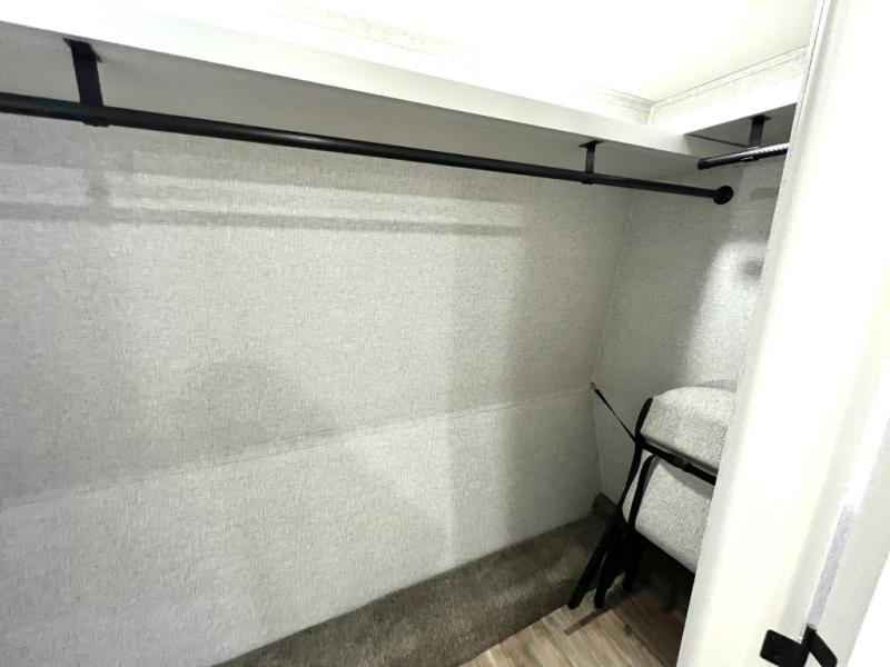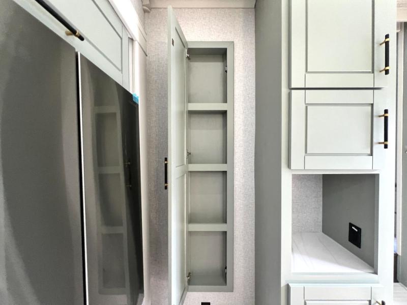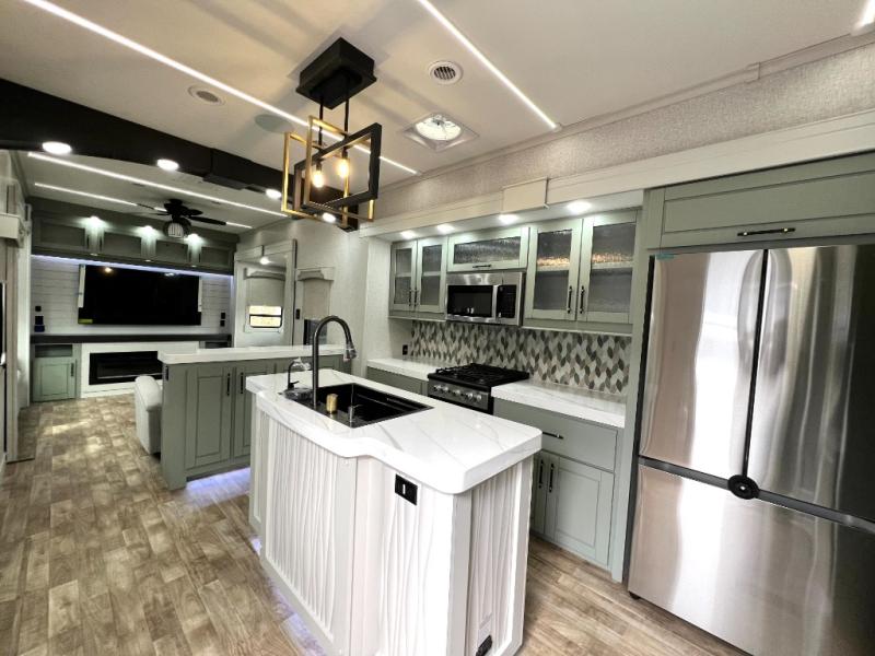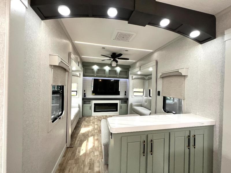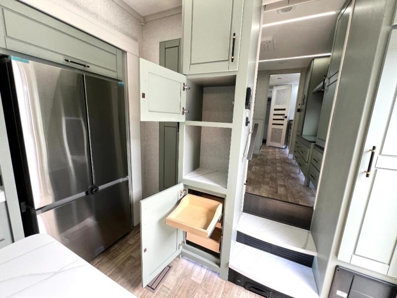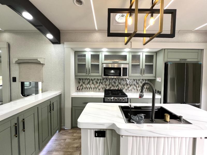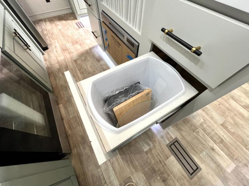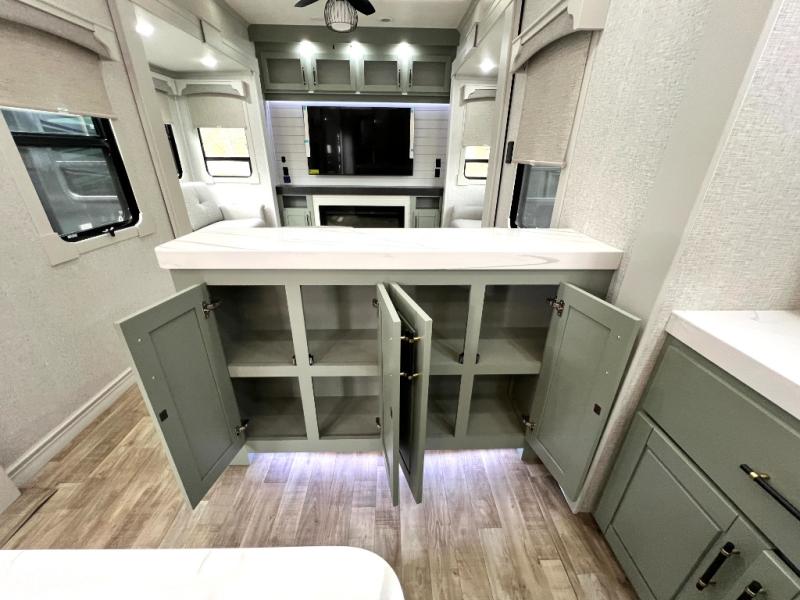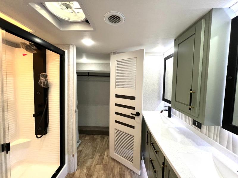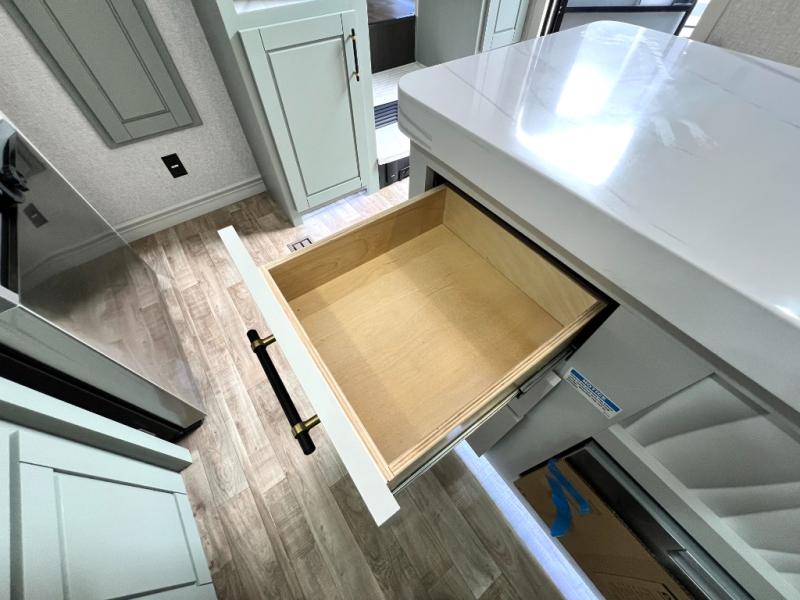 This Redwood fifth wheel is going to make you say wow! The rear living room is fully impressive with its 72" tri-fold sofa slides that are across from one another, its 60" theater sofa, its entertainment center with 65" TV, and its ceiling fan. All in all, it will feel like you're lounging back at home. The kitchen is also completely decked out with opposing slides, a pull-out waste basket at the large island, two buffets, a pantry, and a message center, and just a few steps away from the kitchen is where you will find the luxurious master suite. This space has a full bathroom up at the front where you will find a huge walk-in closet, and within the bedroom, the king bed slide rests across from the 39" TV so that you can watch a movie in comfort.
